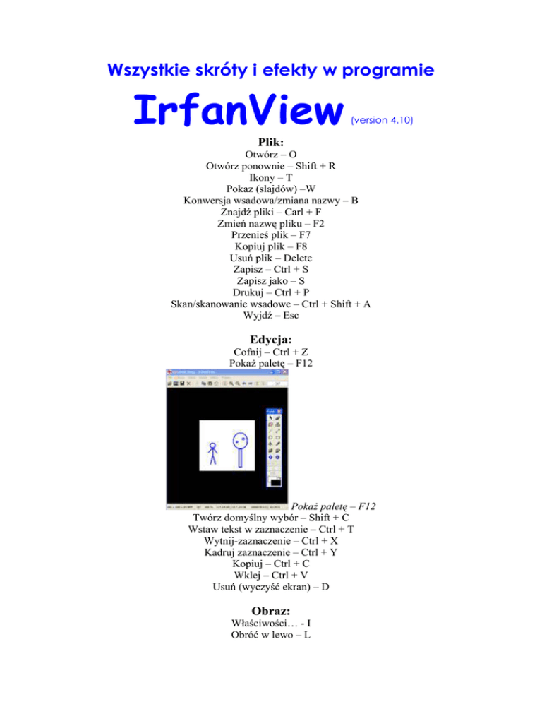 Wszystkie skróty i efekty w programie (version 4.10) Plik: Otwórz – O Otwórz ponownie – Shift + R Ikony – T Pokaz (slajdów) –W Konwersja wsadowa/zmiana nazwy – B Znajdź pliki – Carl + F Zmień nazwę pliku – F2 Przenieś plik – F7 Kopiuj plik – F8 Usuń plik – Delete Zapisz – Ctrl + S Zapisz jako – S Drukuj – Ctrl + P Skan/skanowanie wsadowe – Ctrl + Shift + A Wyjdź – Esc Edycja: Cofnij – Ctrl + Z Pokaż paletę – F12 Pokaż paletę – F12 Twórz domyślny wybór – Shift + C Wstaw tekst w zaznaczenie – Ctrl + T Wytnij-zaznaczenie – Ctrl + X Kadruj zaznaczenie – Ctrl + Y Kopiuj – Ctrl + C Wklej – Ctrl + V Usuń (wyczyść ekran) – D Obraz: Właściwości… - I Obróć w lewo – L Obróć w lewo – L Obróć w prawo – R Obróć w prawo – R Dokładny obrót – Ctrl + U Przerzuć pionowo – V Przerzuć pionowo – V Przerzuć poziomo – H Przerzuć poziomo – H Zmień wielkość/testuj – Ctrl + R Zwiększ liczbę kolorów – Shift + G Zwiększ liczbę kolorów – Shift + G Histogram – Shift + H Auto dopasowanie kolorów – Shift + U Wyostrz – Shift + S Korekta czerwonych oczu – Shift + Y Opcje: Właściwości/ustawienia – P Zatrzymaj animację – G Wyślij plik e-mailem – Shift + M Zrzut ekranu – C Ustaw jako tapetę pulpitu: Wyśrodkuj – Shift + Ctrl + C Sąsiadująco - Shift + Ctrl + T Rozciągnij - Shift + Ctrl + S Minimalizuj – M Widok: Pokaż/ukryj pasek stanu – Alt + Shift + S Pokaż/ukryj pasek narzędzi - Alt + Shift +T Pokaż/ukryj pasek menu - Alt + Shift +M Pokaż/ukryj nagłówek - Alt + Shift +C Pełny ekran – Enter Następny plik w folderze – Space Poprzedni plik w folderze – Backspace Pierwszy plik w folderze – Ctrl + Home Ostatni plik w folderze – Ctrl + End Przypadkowa kolejność w folderze – Ctrl + M Odśwież – F5 Start/stop automatyczny przegląd – Shift + A Powiększ – [+] Zmniejsz – [-] Oryginalna wielkość – Ctrl + H Pokaż widok HEX – F3 Pomoc: Pomoc IrfanView – F1 O IrfanView… - A EFEKTY Przeglądaj efekty – Ctrl + E Oryginalny Obrazek: Edge detection Median filter Blur Explosion Embross Pixelize Oil paint Sharpen Fragment Unsharp mask Twirl Sepia Swirl Rain drop Radial blur Solarize Zoom blur 3D buton Rock Relief Polar coordinates Find edges Cylindrical effect Fish eye Shift colors Noise Metallic Snow Metallic - Gold Circular Waves Metallic - Ice