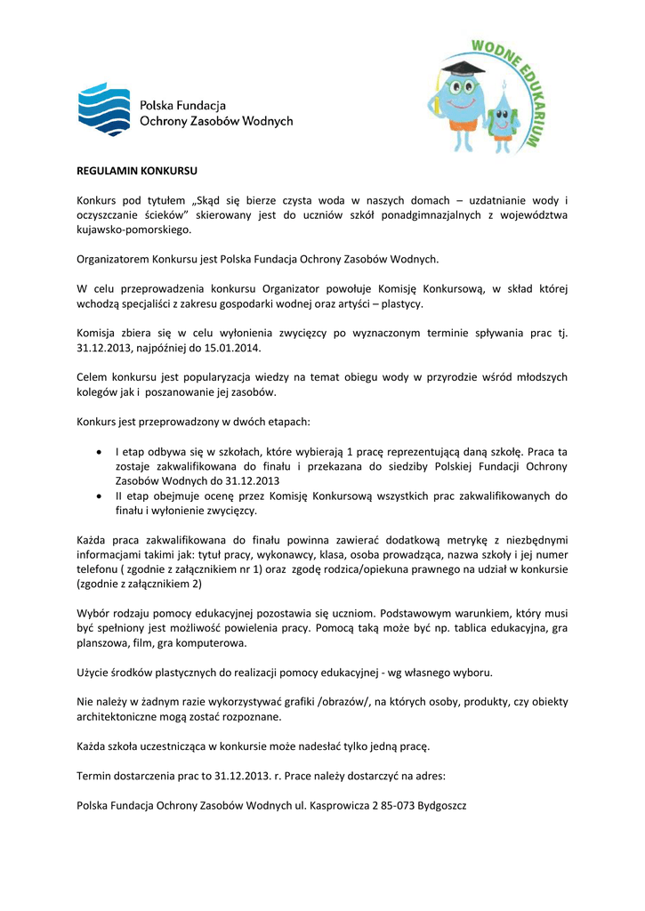 REGULAMIN KONKURSU Konkurs pod tytułem „Skąd się bierze czysta woda w naszych domach – uzdatnianie wody i oczyszczanie ścieków” skierowany jest do uczniów szkół ponadgimnazjalnych z województwa kujawsko-pomorskiego. Organizatorem Konkursu jest Polska Fundacja Ochrony Zasobów Wodnych. W celu przeprowadzenia konkursu Organizator powołuje Komisję Konkursową, w skład której wchodzą specjaliści z zakresu gospodarki wodnej oraz artyści – plastycy. Komisja zbiera się w celu wyłonienia zwycięzcy po wyznaczonym terminie spływania prac tj. 31.12.2013, najpóźniej do 15.01.2014. Celem konkursu jest popularyzacja wiedzy na temat obiegu wody w przyrodzie wśród młodszych kolegów jak i poszanowanie jej zasobów. Konkurs jest przeprowadzony w dwóch etapach: I etap odbywa się w szkołach, które wybierają 1 pracę reprezentującą daną szkołę. Praca ta zostaje zakwalifikowana do finału i przekazana do siedziby Polskiej Fundacji Ochrony Zasobów Wodnych do 31.12.2013 II etap obejmuje ocenę przez Komisję Konkursową wszystkich prac zakwalifikowanych do finału i wyłonienie zwycięzcy. Każda praca zakwalifikowana do finału powinna zawierać dodatkową metrykę z niezbędnymi informacjami takimi jak: tytuł pracy, wykonawcy, klasa, osoba prowadząca, nazwa szkoły i jej numer telefonu ( zgodnie z załącznikiem nr 1) oraz zgodę rodzica/opiekuna prawnego na udział w konkursie (zgodnie z załącznikiem 2) Wybór rodzaju pomocy edukacyjnej pozostawia się uczniom. Podstawowym warunkiem, który musi być spełniony jest możliwość powielenia pracy. Pomocą taką może być np. tablica edukacyjna, gra planszowa, film, gra komputerowa. Użycie środków plastycznych do realizacji pomocy edukacyjnej - wg własnego wyboru. Nie należy w żadnym razie wykorzystywać grafiki /obrazów/, na których osoby, produkty, czy obiekty architektoniczne mogą zostać rozpoznane. Każda szkoła uczestnicząca w konkursie może nadesłać tylko jedną pracę. Termin dostarczenia prac to 31.12.2013. r. Prace należy dostarczyć na adres: Polska Fundacja Ochrony Zasobów Wodnych ul. Kasprowicza 2 85-073 Bydgoszcz Szkoły zainteresowane uczestnictwem w konkursie proszone są o nadesłanie swojej deklaracji w terminie do 15.11.2013 na adres mailowy: [email protected] Ogłoszenie wyników będzie miało miejsce w dniu 20.01.2014 r na stronie internetowej organizatora www.pfozw.org.pl W celu uzgodnienia nagrody głównej, organizator skontaktuje się ze szkołą która zajęła I miejsce. O miejscu gali uroczystego wręczenia nagród szkoły zostaną poinformowane drogą e-mail oraz telefoniczną. Wszystkie prace zakwalifikowane do finału stają się własnością Organizatorów Konkursu, którzy zastrzegają sobie prawo do ich drukowania i rozpowszechniania. Z chwilą wydania prac Organizatorom konkursu przysługujące prawo własności egzemplarza tej pracy oraz prawa majątkowe do pracy przechodzą nieodpłatnie na Organizatorów konkursu, którzy zastrzegają sobie prawo do ich rozpowszechniania publicznego poprzez: przekazywanie w trakcie akcji organizowanych przez Fundację publiczne udostępnienie utworu na stronie internetowej Fundacji www.pfozw.org.pl Wszelkie informacje związane z konkursem oraz jego przebiegiem są dostępne na stronie internetowej Fundacji www.pfozw.org.pl Nagroda główna, którą dla całej szkoły zdobywają wykonawcy zwycięskiej pracy, to zakup pomocy naukowych o równowartości 1 500 PLN oraz nagroda dla autora pracy o równowartości 400 PLN. Organizatorzy przewidują również przyznanie dwóch wyróżnień oraz zapewniają drobne nagrody wszystkim autorom prac zakwalifikowanych do finału. Organizatorzy Konkursu zobowiązują się do zaprezentowania wszystkich prac biorących udział w konkursie na swojej stronie internetowej. Wszelkie sprawy nie objęte niniejszym Regulaminem rozstrzyga Komisja Konkursowa. Załącznik nr 1 Konkurs 2013 METRYKA Z DANYMI SZKOŁY 1. Tytuł pracy............................................................................................................................................. 2. Nazwa szkoły......................................................................................................................................... 3. Klasa....................................................................................................................................................... 4. Adres (ulica, kod pocztowy,miasto)....................................................................................................... 5. Telefon, fax, adres mailowy................................................................................................................... 6. Osoba prowadząca (imię nazwisko, telefon/adres mailowy)................................................................ 7. Nazwisko i podpis Dyrektora Szkoły...................................................................................................... Załącznik nr 2 konkurs 2013 OŚWIADCZENIE RODZICA/OPIEKUNA PRAWNEGO „Ja, niżej podpisany……………………………………………………………………………………………………………………………… jako rodzic/opiekun prawny nieletniego………………………………………………….………………......(dane dziecka) wyrażam zgodę na jego udział w Konkursie Ekologicznym "Wielka podróż małej kropelki Elki” organizowanym przez Polską Fundację Ochrony Zasobów Wodnych. Jednocześnie oświadczam, że zgłoszona do konkursu praca pt. "Wielka podróż małej kropelki Elki” stanowi wytwór mojego dziecka, któremu przysługują do niej prawa autorskie. Niniejszym nieodpłatnie przenoszę na Polską Fundację Ochrony Zasobów Wodnych prawo własności egzemplarza Pracy oraz wyłączne autorskie prawo majątkowe do w/w Pracy jako utworu obejmujące prawo do nieograniczonego w czasie korzystania i rozporządzania Pracą na wszystk