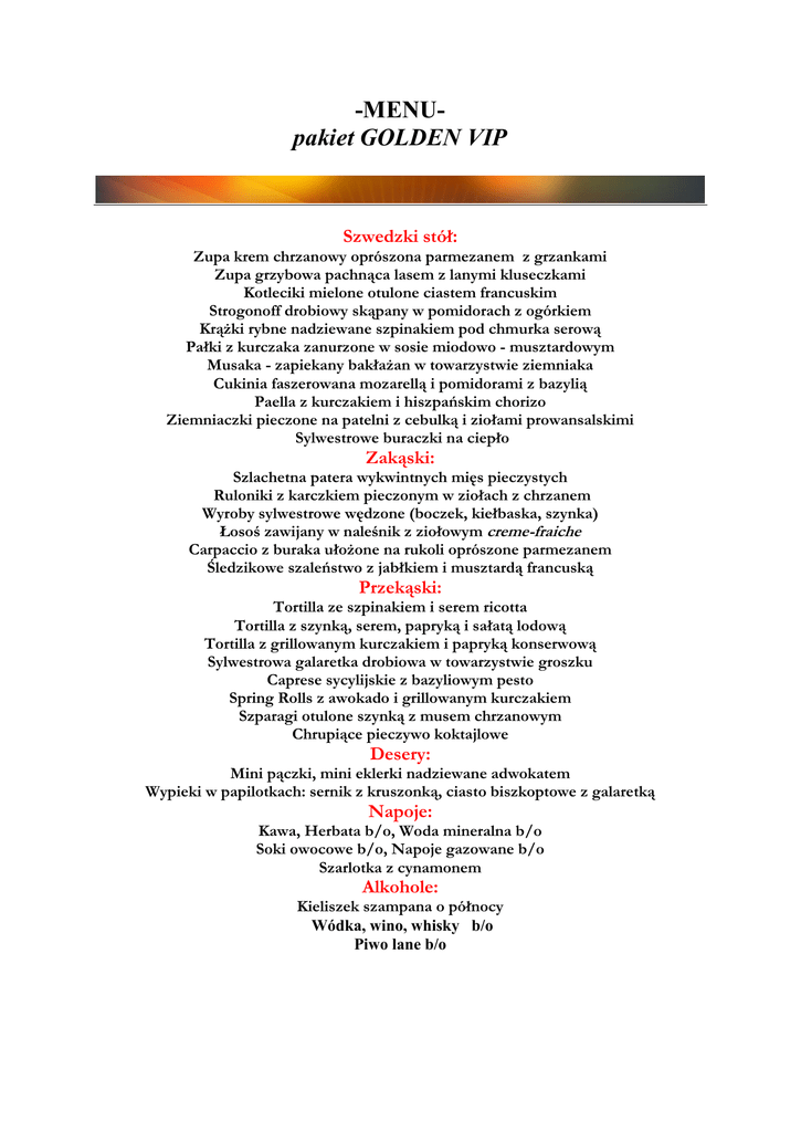 -MENUpakiet GOLDEN VIP Szwedzki stół: Zupa krem chrzanowy oprószona parmezanem z grzankami Zupa grzybowa pachnąca lasem z lanymi kluseczkami Kotleciki mielone otulone ciastem francuskim Strogonoff drobiowy skąpany w pomidorach z ogórkiem Krążki rybne nadziewane szpinakiem pod chmurka serową Pałki z kurczaka zanurzone w sosie miodowo - musztardowym Musaka - zapiekany bakłażan w towarzystwie ziemniaka Cukinia faszerowana mozarellą i pomidorami z bazylią Paella z kurczakiem i hiszpańskim chorizo Ziemniaczki pieczone na patelni z cebulką i ziołami prowansalskimi Sylwestrowe buraczki na ciepło Zakąski: Szlachetna patera wykwintnych mięs pieczystych Ruloniki z karczkiem pieczonym w ziołach z chrzanem Wyroby sylwestrowe wędzone (boczek, kiełbaska, szynka) Łosoś zawijany w naleśnik z ziołowym creme-fraiche Carpaccio z buraka ułożone na rukoli oprószone parmezanem Śledzikowe szaleństwo z jabłkiem i musztardą francuską Przekąski: Tortilla ze szpinakiem i serem ricotta Tortilla z szynką, serem, papryką i sałatą lodową Tortilla z grillowanym kurczakiem i papryką konserwową Sylwestrowa galaretka drobiowa w towarzystwie groszku Caprese sycylijskie z bazyliowym pesto Spring Rolls z awokado i grillowanym kurczakiem Szparagi otulone szynką z musem chrzanowym Chrupiące pieczywo koktajlowe Desery: Mini pączki, mini eklerki nadziewane adwokatem Wypieki w papilotkach: sernik z kruszonką, ciasto biszkoptowe z galaretką Napoje: Kawa, Herbata b/o, Woda mineralna b/o Soki owocowe b/o, Napoje gazowane b/o Szarlotka z cynamonem Alkohole: Kieliszek szampana o północy Wódka, wino, whisky b/o Piwo lane b/o