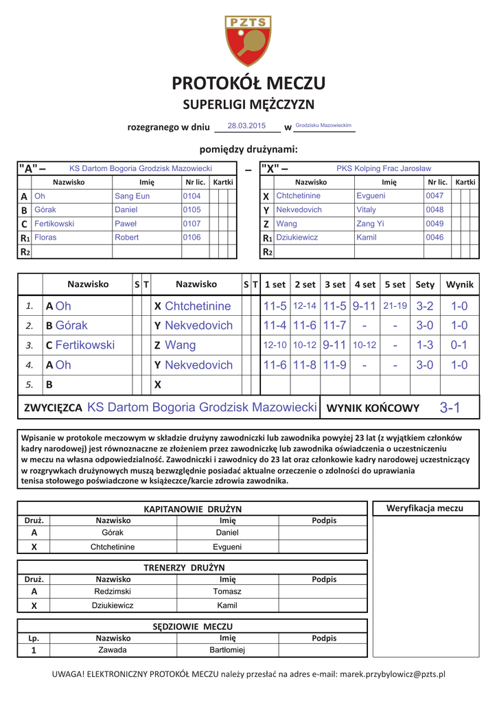 PROTOKÓŁ MECZU SUPERLIGI MĘŻCZYZN rozegranego w dniu 28.03.2015 w Grodzisku Mazowieckim a pomiędzy drużynami: "A" – Imię Nazwisko A B C R1 R2 – "X" – KS Dartom Bogoria Grodzisk Mazowiecki Sang Eun 0104 Górak Daniel 0105 Fertikowski Paweł 0107 Floras Robert 0106 Nazwisko X Y Z R1 R2 Nazwisko ST Imię Nazwisko Nr lic. Kartki Oh PKS Kolping Frac Jarosław Nr lic. Kartki Chtchetinine Evgueni 0047 Nekvedovich Vitaly 0048 Wang Zang Yi 0049 Dziukiewicz Kamil 0046 Sety Wynik 21-19 3-2 1-0 - - 3-0 1-0 10-12 - 1-3 0-1 - - 3-0 1-0 S T 1 set 2 set 3 set 4 set 5 set 1. A Oh X Chtchetinine 11-5 2. B Górak Y Nekvedovich 11-4 11-6 11-7 3. C Fertikowski Z Wang 12-10 10-12 4. A Oh Y Nekvedovich 11-6 11-8 11-9 5. B X 12-14 11-5 9-11 9-11 ZWYCIĘZCA KS Dartom Bogoria Grodzisk Mazowiecki WYNIK KOŃCOWY 3-1 Wpisanie w protokole meczowym w składzie drużyny zawodniczki lub zawodnika powyżej 23 lat (z wyjątkiem członków kadry narodowej) jest równoznaczne ze złożeniem przez zawodniczkę lub zawodnika oświadczenia o uczestniczeniu w meczu na własna odpowiedzialność. Zawodniczki i zawodnicy do 23 lat oraz członkowie kadry narodowej uczestniczący w rozgrywkach drużynowych muszą bezwzględnie posiadać aktualne orzeczenie o zdolności do uprawiania tenisa stołowego poświadczone w książeczce/karcie zdrowia zawodnika. Weryfikacja meczu KAPITANOWIE DRUŻYN Druż. Nazwisko Imię A X Górak Daniel Chtchetinine Evgueni Druż. Nazwisko Imię A X Redzimski Tomasz Dziukiewicz Kamil Podpis TRENERZY DRUŻYN Podpis SĘDZIOWIE MECZU Lp. Nazwisko Imię 1 Zawada Bartłomiej Podpis UWAGA! ELEKTRONICZNY PROTOKÓŁ MECZU należy przesłać na adres e-mail: [email protected] Ocena organizacji spotkania (wypełnia sędzia główny) OSOBA ODPOWIEDZIALNA ZA BEZPIECZEŃSTWO Imię Edyta Nazwisko Skoczeń Lp. 1 Publiczność uwagi pole gry prawidłowe ✔ nieprawidłowe podłoga prawidłowe ✔ nieprawidłowe oświetlenie prawidłowe ✔ nieprawidłowe wrażenie estetyczne prawidłowe ✔ nieprawidłowe nagłośnienie tak ✔ nie spiker tak ✔ nie wydzielone miejsce tak ✔ nie prasa tak ✔ nie radio tak telewizja tak ✔ nie bilety tak ✔ nie miejsca siedzące tak ✔ nie obecność Media Organizacja meczu warunki techniczne liczba widzów Inne uwagi I bez uwag II bez uwag III bez uwag nie Podpis ✔ 250 (wypełnia: I - kapitan gości, II - kapitan gospodarzy, III - sędzia główny)