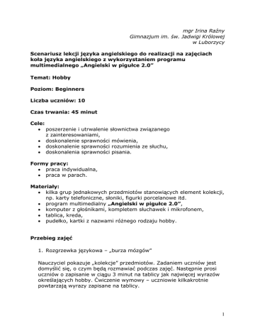 mgr Irina Raźny Gimnazjum im. św. Jadwigi Królowej w Luborzycy Scenariusz lekcji języka angielskiego do realizacji na zajęciach koła języka angielskiego z wykorzystaniem programu multimedialnego „Angielski w pigułce 2.0” Temat: Hobby Poziom: Beginners Liczba uczniów: 10 Czas trwania: 45 minut Cele: • poszerzenie i utrwalenie słownictwa związanego z zainteresowaniami, • doskonalenie sprawności mówienia, • doskonalenie sprawności rozumienia ze słuchu, • doskonalenia sprawności pisania. Formy pracy: • praca indywidualna, • praca w parach. Materiały: • kilka grup jednakowych przedmiotów stanowiących element kolekcji, np. karty telefoniczne, słoniki, figurki porcelanowe itd. • program multimedialny „Angielski w pigułce 2.0”, • komputer z głośnikami, kompletem słuchawek i mikrofonem, • tablica, kreda, • pudełko, kartki z nazwami różnego rodzaju hobby. Przebieg zajęć 1. Rozgrzewka językowa – „burza mózgów” Nauczyciel pokazuje „kolekcje” przedmiotów. Zadaniem uczniów jest domyślić się, o czym będą rozmawiać podczas zajęć. Następnie prosi uczniów o zapisanie w ciągu 3 minut na tablicy jak najwięcej wyrazów określających hobby. Ćwiczenie wymowy – uczniowie kilkakrotnie powtarzają wyrazy zapisane na tablicy. 1 2. Prezentacja nowego materiału – praca z programem multimedialnym • • • Nauczyciel uruchamia program i klika na link hobby, następnie – prezentacje. Klikając na głośnik w prawym górnym rogu odsłuchują i powtarzają wyrazy. Klikamy na rozpoznawanie. W prawym górnym rogu ukazuje się „start”. Zadaniem uczniów jest rozpoznać wyraz ze słuchu i kliknąć na odpowiedni obrazek. Czas na ćwiczenie sprawności pisania – przechodzimy do wpisywania. Klikając na „?” należy wpisać pasujący do obrazka wyraz lub wyrażenie. Praca w parach • • Link Dialogi. Uczniowie słuchają i powtarzają dialog za lektorem. Następnie nagrywają własne – doskonalenie sprawności mówienia. Dopasowywanie. W prawym górnym rogu ukazują się wyrazy. Uczniowie uzupełniają luki w tekście: klikają na odpowiednie słowa, „przeciągają” przy pomocy myszki i umieszczają we właściwym miejscu. To zadanie wygląda następująco: 2 3. Podsumowanie pracy Każdy uczeń wyciąga z pudełka, w którym mieszczą się kartki z nazwami różnego rodzaju hobby, pięć kartek. Następnie układa opowiadanie (pisemnie albo ustnie), w którym musi użyć wszystkich tych słów. Opowiadania są głośno odczytywane/prezentowane i cała grupa decyduje, które było najbardziej pomysłowe. 3