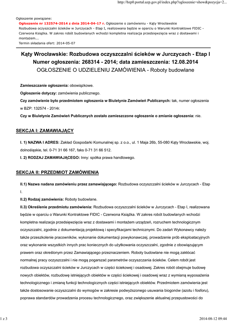 1z3 http://bzp0.portal.uzp.gov.pl/index.php?ogloszenie=show&pozycja=2... Ogłoszenie powiązane: Ogłoszenie nr 132574-2014 z dnia 2014-04-17 r. Ogłoszenie o zamówieniu - Kąty Wrocławskie Rozbudowa oczyszczalni ścieków w Jurczycach - Etap I, realizowana będzie w oparciu o Warunki Kontraktowe FIDIC Czerwona Książka. W zakres robót budowlanych wchodzi kompletna realizacja przedsięwzięcia wraz z dostawami i montażem... Termin składania ofert: 2014-05-07 Kąty Wrocławskie: Rozbudowa oczyszczalni ścieków w Jurczycach - Etap I Numer ogłoszenia: 268314 - 2014; data zamieszczenia: 12.08.2014 OGŁOSZENIE O UDZIELENIU ZAMÓWIENIA - Roboty budowlane Zamieszczanie ogłoszenia: obowiązkowe. Ogłoszenie dotyczy: zamówienia publicznego. Czy zamówienie było przedmiotem ogłoszenia w Biuletynie Zamówień Publicznych: tak, numer ogłoszenia w BZP: 132574 - 2014r. Czy w Biuletynie Zamówień Publicznych zostało zamieszczone ogłoszenie o zmianie ogłoszenia: nie. SEKCJA I: ZAMAWIAJĄCY I. 1) NAZWA I ADRES: Zakład Gospodarki Komunalnej sp. z o.o., ul. 1 Maja 26b, 55-080 Kąty Wrocławskie, woj. dolnośląskie, tel. 0-71 31 66 167, faks 0-71 31 66 512. I. 2) RODZAJ ZAMAWIAJĄCEGO: Inny: spółka prawa handlowego. SEKCJA II: PRZEDMIOT ZAMÓWIENIA II.1) Nazwa nadana zamówieniu przez zamawiającego: Rozbudowa oczyszczalni ścieków w Jurczycach - Etap I. II.2) Rodzaj zamówienia: Roboty budowlane. II.3) Określenie przedmiotu zamówienia: Rozbudowa oczyszczalni ścieków w Jurczycach - Etap I, realizowana będzie w oparciu o Warunki Kontraktowe FIDIC - Czerwona Książka. W zakres robót budowlanych wchodzi kompletna realizacja przedsięwzięcia wraz z dostawami i montażem urządzeń, rozruchem technologicznym oczyszczalni, zgodnie z dokumentacją projektową i specyfikacjami technicznymi. Do zadań Wykonawcy należy także przeszkolenie pracowników, wykonanie dokumentacji powykonawczej, prowadzenie prób eksploatacyjnych oraz wykonanie wszystkich innych prac koniecznych do użytkowania oczyszczalni, zgodnie z obowiązującym prawem oraz określonym przez Zamawiającego przeznaczeniem. Roboty budowlane nie mogą zakłócać normalnej pracy oczyszczalni i nie mogą pogarszać parametrów oczyszczania ścieków. Celem robót jest rozbudowa oczyszczalni ścieków w Jurczycach w części ściekowej i osadowej. Zakres robót obejmuje budowę nowych obiektów, rozbudowę istniejących obiektów w części ściekowej i osadowej wraz z wymianą wyposażenia technologicznego i zmianą funkcji technologicznych części istniejących obiektów. Przedmiotem zamówienia jest także dostosowanie oczyszczalni do wymogów w zakresie podwyższonego usuwania biogonów (azotu i fosforu), poprawa standardów prowadzenia procesu technologicznego, oraz zwiększenie aktualnej przepustowości do 2014-08-12 09:44 2z3 http://bzp0.portal.uzp.gov.pl/index.php?ogloszenie=show&pozycja=2... przepustowości Etap I - 2900 m3/dobę. Ponadto przedmiotem zamówienia jest przebudowa systemu ewakuacji i magazynowania osadu odwodnionego, zwiększenie niezawodności przebiegu procesu oczyszczania ścieków. W ramach rozbudowy oczyszczalni ścieków w Jurczycach przewidywana jest: Etap I - Rozbudowa i przebudowa obiektów umożliwiając oczyszczanie ścieków dopływających w wielkości do 2900 m3/d, 24500 RLM. 1) BUDYNEK TECHNICZNO-WIELOFUNKCYJNY - ISTNIEJĄCY, przewiduje się: - zmiana sposobu ewakuacji osadu odwodnionego, - montaż prasy skratek, - montaż mieszacza osadu z wapnem, - rozbudowę pomieszczenia stacji dmuchaw; 2) REAKTOR BEZTLENOWY - ISTNIEJĄCY, przewiduje się przebudowę układu odprowadzania osadu - zasuwy z napędem elektrycznym, ogrzewanie i ocieplenie rurociągu. 3) KOMORY ROZDZIAŁU - ISTNIEJĄCE, przewiduje się rozbiórkę istniejących komór rozdziału. 4) KOMORY ROZDZIAŁU BUDOWANE, przewiduje się budowę nowych 4 komór rozdziału o wymiarach 2,0x3,4 m oraz zamontowanie w nich zastawek regulacyjnych. 5) REAKTORY BIOLOGICZNE - ISTNIEJĄCE, przewiduje się przebudowę istniejących obiektów polegającą na zmianie proporcji komór denitryfikacyjnej i nitryfikacyjnej i wymianę pomp recyrkulacji wewnętrznej i układu napowietrzania ścieków. 6) REAKTOR BIOLOGICZNY - BUDOWANY, przewiduje się budowę nowego reaktora biologicznego o wymiarach 35,3x8,40 m, Hcz=4,5 m. 7) OSADNIKI WTÓRNE - BUDOWANE, przewiduje się budowę dwóch nowych, zblokowanych osadników wtórnych, każdy o wymiarach 30,2x4,90m, Hcz=2,6 m. 8) KOMORA POMIAROWA ŚCIEKÓW OCZYSZCZONYCH - ISTNIEJĄCA, przewiduje się wymianę pokrywy, przepływomierza i rurociągu na DN400. 9) ZBIORNIK OSADU I POMPOWNIA NADAWY - ISTNIEJĄCY, przewiduje się przebudowę do funkcji komory mieszania osadów i pompowni nadawy. 10) STANOWISKO PIX - ISTNIEJĄCE, przewiduje się przeniesienie i montaż zbiornika w nowym miejscu. 11) MAGAZYN OSADU ODWODNIONEGO - ISTNIEJĄCY, przewiduje się budowę zadaszenia istniejącego placu o powierzchni 247 m2. 12) MAGAZYN OSADU ODWODNIONEGO BUDOWANY, przewiduje się budowę zadaszonego i utwardzonego placu do gromadzenia odwodnionego osadu o powierzchni 250 m2. 13) POMPOWNIA PRZEWAŁOWA - BUDOWANA, przewiduje się budowę pompowni przewałowej ścieków oczyszczonych o wymiarach 2,9x5,2 m. 14) STACJA DMUCHAW (W BUDYNKU TECHNICZNOWIELOFUNKCYJNYM) Przewiduje się rozbudowę istniejącego pomieszczenia stacji dmuchaw do powierzchni ok. 56 m2 i wyposażenie go w nowe dmuchawy w obudowach dźwiękochłonnych. 15) STANOWISKO PRZYGOTOWANIA OSADU ODWODNIONEGO DO WYKORZYSTANIA ROLNICZEGO - BUDOWANE, przewiduje się budowę stanowiska w postaci szczelnej płyty betonowej, ograniczonej z trzech stron ściankami, o powierzchni około 433 m2. 16) KOMORA TLENOWEJ STABILIZACJI OSADU NADMIERNEGO - BUDOWANA, przewiduje się budowę komory o wymiarach 11,8x11,8 m, Hcz=4,5 m. 17) ZAGĘSZCZACZ OSADU WSTĘPNEGO - BUDOWANY, przewiduje się budowę zagęszczacza osadu wstępnego o średnicy 6,5 m, Hcz=2,9 m. 18) RENOWACJA KANAŁU OD