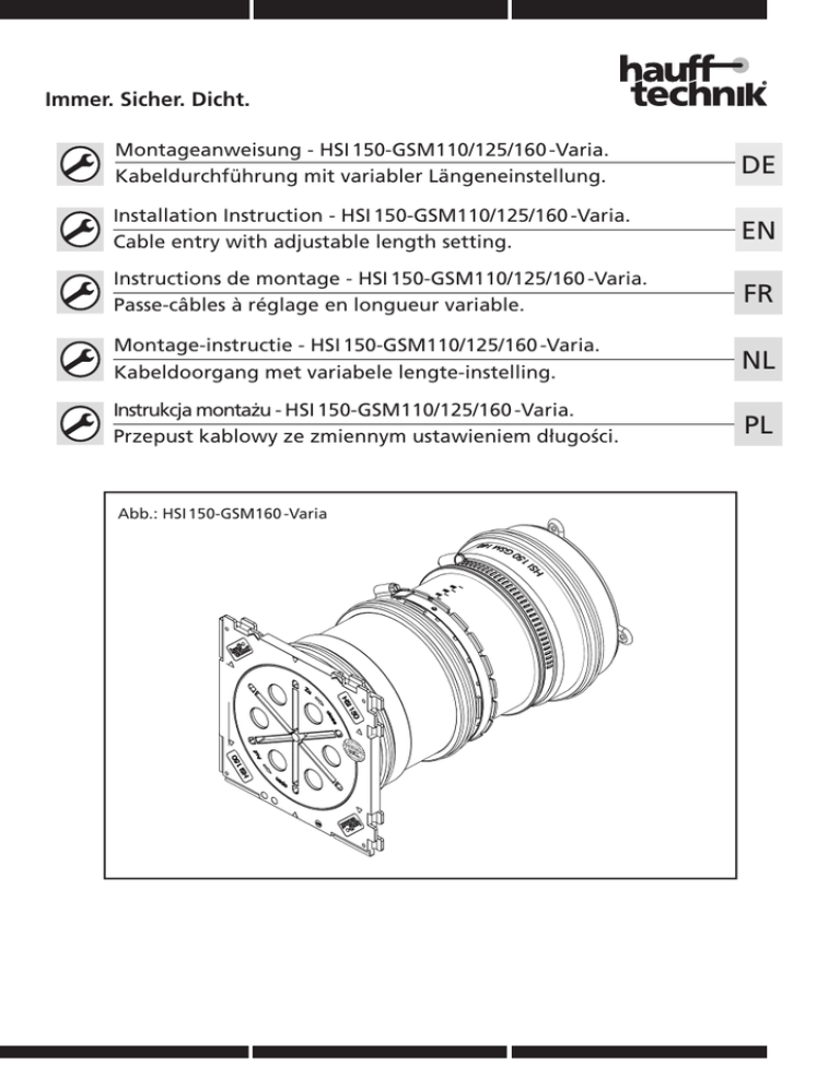 Immer. Sicher. Dicht. Montageanweisung - HSI 150-GSM110/125/160 -Varia. Kabeldurchführung mit variabler Längeneinstellung. Installation Instruction - HSI 150-GSM110/125/160 -Varia. DE Cable entry with adjustable length setting. EN Instructions de montage - HSI 150-GSM110/125/160 -Varia. Passe-câbles à réglage en longueur variable. FR Montage-instructie - HSI 150-GSM110/125/160 -Varia. Kabeldoorgang met variabele lengte-instelling. NL Instrukcja montażu - HSI 150-GSM110/125/160 -Varia. Przepust kablowy ze zmiennym ustawieniem długości. PL Abb.: HSI 150-GSM160 -Varia +49 7322 1 3 3 -0 3 HSI 150-GSM110/125/160 -Varia DE Inhalt 1 Allgemeines und Verwendungszweck 2 Allgemeine Hinweise/Sicherheitshinweise 3 Beschreibung 4 Lieferumfang 5 Benötigtes Werkzeug und Hilfsmittel 6 Montage 1 Allgemeines und Verwendungszweck Die HSI 150-GSM110/125/160 -Varia ist eine längenverstellbare Kabeldurchführung zum schalungsbündigen Einbetonieren. Mögliche Längenanpassungen vor Ort von 200 - 635 mm mit 4 Grundtypen für alle Ortbetonarten und geeignet für Elementbauweise. Zum Anschluss von glatten Kunststoffkabelschutzrohren mit �a = 110, 125 und 160 mm auf der Gebäude-/Schachtaußenseite und zum Anschluss von HSI 150 Systemdeckel und HRD150/160 Ringraumdichtungen. 2 Allgemeine Hinweise • • • • • • Bei den Betonierarbeiten sind die jeweiligen länderspezifischen Normen und Regelwerke zu beachten. Dies gilt insbesondere bei wasserundurchlässigen Betonbauteilen nach EN206-1, Elementbauweise oder Arbeiten mit selbstverdichtendem Beton. Fugenbereiche sind zu meiden. Bei Grobkörnungen > 16 mm ist der Abstandhalter HSI-AH 40 zu verwenden. Keine Schalungsabstandhalter/Spannstellen zwischen Pakete setzen. Bei Paketbildung von Rohranschlüssen �a = 160 mm sowie für eine optimierte Verdichtung des Betons und später die Verdichtung des Kabelschutzrohrgrabens (Achsmaßvergrößerung von 210 mm auf 250 mm) ist der Abstandhalter HSI-AH 40 zu verwenden. Weiteres Zubehör und Informationen unter www.hauff-technik.de und in den technischen Datenblättern. 2 Sicherheitshinweise • • • • Schützen Sie die Kabeldurchführung HSI 150-GSM110/125/160 -Varia bis zur Montage vor Beschädigungen, Feuchte und Verunreinigungen. Überprüfen Sie die Lieferung auf Vollständigkeit und alle Einzelteile und eventuelle Schäden. Es dürfen nur unbeschädigte Teile montiert werden. Bei der Installation müssen die entsprechenden Vorschriften der Berufsgenossenschaften, die VDE-Bestimmungen, die entsprechenden nationalen Sicherheits- und Unfallverhütungsvorschriften sowie die Richtlinien (Arbeits- und Verfahrensanweisungen) Ihres Unternehmens beachtet werden. Für die Reinigung der Kabeldurchführungen dürfen keine lösungsmittelhaltigen Reiniger verwendet werden. Wir empfehlen den Kabelreiniger KR M.T.X. Legende 1 Arbeitsschritte zu beachtende Hinweise 2 HSI 150-GSM110/125/160 -Varia DE 3 Beschreibung: Kabeldurchführung HSI 150-GSM110/125/160 -Varia Längenverstellbare Kabeldurchführung, von 200 bis 635 mm, zum Einbetonieren. Angeschlossen werden können auf der Gebäude-/Schachtaußenseite glatte Kunststoffkabelschutzrohre mit �a = 110, 125 und 160 mm und HSI 150 Systemdeckel sowie HRD150/160 Ringraumdichtungen auf der Gebäude-/Schachtinnenseite. Abb.: HSI 150-GSM160-Varia/320 - 425 Einschlagdeckel (für GSM160) Verlängerungsrohr mit Skala z.B. 320 - 425 mm Spannschlüssel Gummimanschette mit 3-Stegdichtung Längenverstelllung Spannband mit Loch Spannband +49 7322 1 Dreistegdichtungen 3 3 -0 3 Qualitätsssiegel Verschlussdeckel Anschlussseite Montagerahmen Bei Paketbildung können folgende Wandstärken und Rohranschlüsse abgedeckt werden: Bezeichnung für Schutzrohranschluss Geeignet für Wandstärke Achsmaße mit Abstandshalter ohne Abstandshalter HSI 150-GSM110 -Varia/200 - 260* � 110 200 - 260 mm (250 mm) 210 mm HSI 150-GSM110 -Varia/260 - 365* � 110 260 - 365 mm (250 mm) 210 mm HSI 150-GSM110 -Varia/365 - 470* � 110 365 - 470 mm (250 mm) 210 mm HSI 150-GSM110 -Varia/470 - 575 * � 110 470 - 575 mm (250 mm) 210 mm HSI 150-GSM125 -Varia/200 - 260* � 125 200 - 260 mm (250 mm) 210 mm HSI 150-GSM125 -Varia/260 - 365* � 125 260 - 365 mm (250 mm) 210 mm HSI 150-GSM125 -Varia/365 - 470* � 125 365 - 470 mm (250 mm) 210 mm HSI 150-GSM125 -Varia/470 - 575 � 125 470 - 575 mm (250 mm) 210 mm HSI 150-GSM160 -Varia/260 - 320 � 160 260 - 320 mm 250 mm - HSI 150-GSM160 -Varia/320 - 425 � 160 320 - 425 mm 250 mm - HSI 150-GSM160 -Varia/425 - 530 � 160 425 - 530 mm 250 mm - HSI 150-GSM160 -Varia/530 - 635 � 160 530 - 635 mm 250 mm - *Für Schutzrohranschlüsse � 110/125 mm empfehlen wir den Abstandshalter AH40 zu verwenden! 3 HSI 150-GSM110/125/160 -Varia DE 4 Lieferumfang Zum Lieferumfang der Kabeldurchführung HSI 150-GSM-Varia gehören: 1 Montagerahmen mit Dreistegdichtung 1 Verschlussdeckel 1 Einschlagdeckel (für GSM160) 1 PE-Verschlussdeckel (für GSM110/125) 2 Schutzfolien 1 Qualitätssiegel 1 Spannband mit Loch 1 Spannband (nur bei GSM 160 mm) 1 Spannschlüssel 1 Verlängerungsrohr mit Skala 1 Längenverstellung mit zusätzlicher Dreisteg- dichtung 5 Benötigtes Werkzeug und Hilfsmittel Für die ordnungsgemäße Montage der Kabeldurchführung HSI 150-GSM110/125/160 -Varia, benötigen Sie neben dem üblichen Standardwerkzeug (Hammer, Zange, Bolzenschneider, Rödeldraht) folgenden Werkzeuge und Hilfsmittel: - Gelenkstirnlochschlüssel SLS 6G bzw. SLS 6GD (für Wände mit Perimeterdämmung) Zubehör:Abstandhalter HSI-AH40 (VPE 2 St.) / Gleitmittel GMT (Art.Nr.: 2790009100) 6 1 Montage: Länge einstellen Kabeldurchführung auf eine Ebene stellen und anhand der Skala auf die gewünschte Länge bzw. auf den gewünschten Schalungsabstand (Wandstärke) einstellen. e in s te llb ar Darauf achten, dass die 3 Pfeile auf der Schutzfolie nach oben zeigen. Die eingestellte Wandstärke „X“ darf nicht kleiner sein als der Schalungsabstand. Die Maße sind vor dem Einbau zu kontrollieren