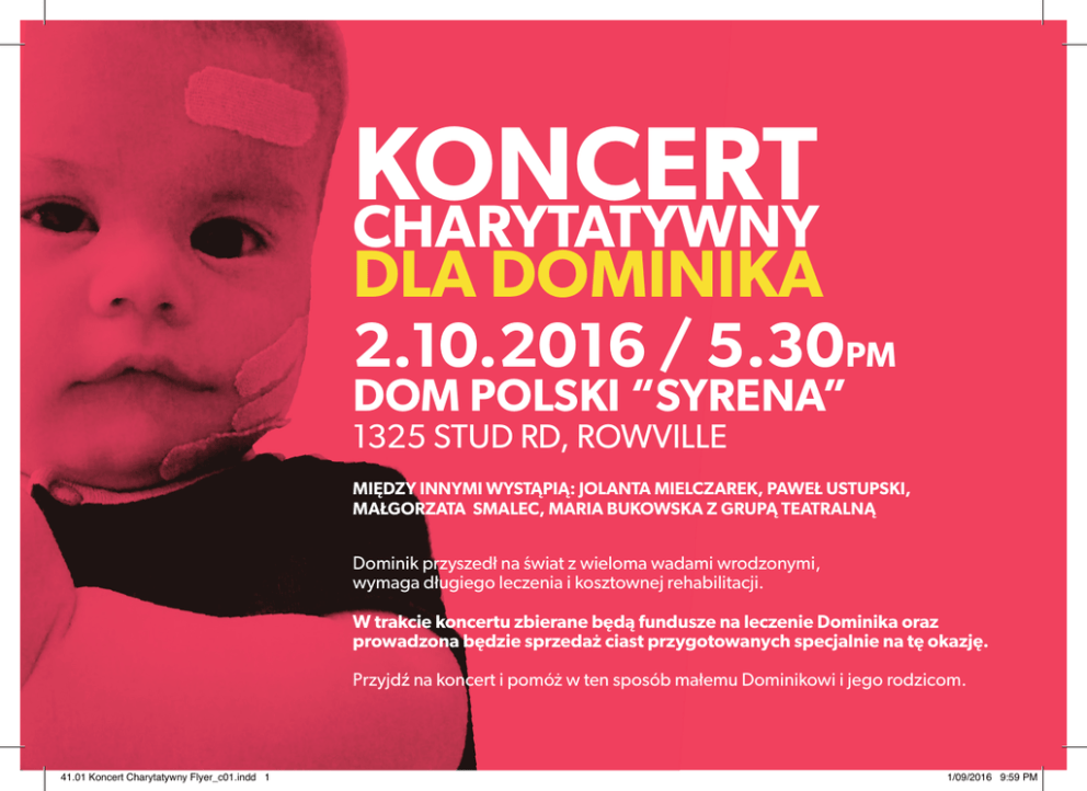 KONCERT CHARYTATYWNY DLA DOMINIKA 2.10.2016 / 5.30PM DOM POLSKI “SYRENA” 1325 STUD RD, ROWVILLE MIĘDZY INNYMI WYSTĄPIĄ: JOLANTA MIELCZAREK, PAWEŁ USTUPSKI, MAŁGORZATA SMALEC, MARIA BUKOWSKA Z GRUPĄ TEATRALNĄ Dominik przyszedł na świat z wieloma wadami wrodzonymi, wymaga długiego leczenia i kosztownej rehabilitacji. W trakcie koncertu zbierane będą fundusze na leczenie Dominika oraz prowadzona będzie sprzedaż ciast przygotowanych specjalnie na tę okazję. Przyjdź na koncert i pomóż w ten sposób małemu Dominikowi i jego rodzicom. 41.01 Koncert Charytatywny Flyer_c01.indd 1 1/09/2016 9:59 PM CHARITY C O N C E R T FOR DOMINIC 2.10.2016 / 5.30PM POLISH HOUSE “SYRENA” 1325 STUD RD, ROWVILLE WITH PERFORMANCES BY: JOLANTA MIELCZAREK, PAWEŁ USTUPSKI, MAŁGORZATA SMALEC, MARIA BUKOWSKA Z GRUPĄ TEATRALNĄ Sadly Dominic was born with many birth defects that require long periods of medical rehabilitation and treatment. This is a fundraising concert for Dominic’s treatments. You will have an opportunity to donate during the concert. The concert will be followed by a cake sale. Funds raised from the cake sale will also be donated to support Dominic and his parents. We invite you to attend the concert and in this way, help little Dominic and his family. 41.01 Koncert Charytatywny Flyer_c01.indd 2 1/09/2016 9:59 PM