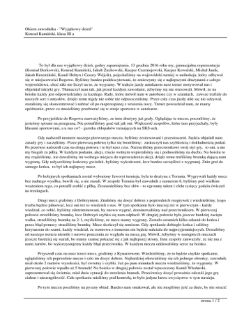 Okiem zawodnika - "Wyjątkowy dzień" Konrad Kamiński, klasa III a To był dla nas wyjątkowy dzień, godny zapamiętania. 13 grudnia 2016 roku my, gimnazjalna reprezentacja (Konrad Borkowski, Konrad Kamiński, Jakub Żuchowski, Kacper Czerniejewski, Kacper Kowalski, Michał Janik, Jakub Krzemiński, Kamil Hołtyn i Cezary Wójcik), pojechaliśmy na wojewódzki turniej w unihokeja, który odbywał się w miejscowości Rogowo. Byliśmy bardzo podekscytowani, że zmierzymy się z najlepszymi drużynami z całego województwa, choć nikt nie liczył na to, że wygramy. W trakcie jazdy autokarem nasz trener motywował nas i objaśniał taktyki gry. Tłumaczył nam tak, jak przed każdym zawodami, żebyśmy się nie stresowali. Mówił, że na boisku każdy jest odpowiedzialny za każdego. Rady, które mówił nam w autobusie czy w szatniach, zawsze trafiały do naszych serc i umysłów, dzięki temu nigdy nie sobie nie odpuszczaliśmy. Przez cały czas jazdy nikt się nie odzywał, staraliśmy się skoncentrować i nabrać sił po nieprzespanej z wrażenia nocy. Trener powiedział nam, że mamy opóźnienie, przez co musieliśmy przebierać się w stroje sportowe w autokarze. Po przyjeździe do Rogowa zauważyliśmy, ze inne drużyny już grały. Oglądając te mecze, poczuliśmy, że jesteśmy spisani na przegraną. Nie potrafiliśmy grać tak jak oni. Większość zespołów, które tam przyjechały, były klasami sportowymi, a u nas co? - garstka chłopaków trenujących na SKS-ach. Gdy nadszedł moment naszego pierwszego meczu, byliśmy zestresowani i przestraszeni. Sędzia objaśnił nam zasady gry i zaczęliśmy. Przez pierwszą połowę tylko się broniliśmy; zaskoczyli nas szybkością i dokładnością podań. Po przerwie nadszedł czas na drugą połowę i to był nasz czas. Narzuciliśmy przeciwnikowi swój styl gry, to oni, a nie my biegali za piłką. W każdym podaniu, akcji, rzucie wolnym wspieraliśmy się i podnosiliśmy na duchu. Na boisku to my rządziliśmy, nie dawaliśmy im wolnego miejsca do wprowadzenia akcji, dzięki temu trafiliśmy bramkę dającą nam wygraną. Gdy usłyszeliśmy końcowy gwizdek, byliśmy wykończeni, lecz bardzo szczęśliwi z wygranej. Żnin grał do samego końca, to był ich najlepszy mecz. Po kolejnych spotkaniach został wyłoniony faworyt turnieju, była to drużyna z Torunia. Wygrywali każdy mecz bez żadnego wysiłku, bawili się, a nie starali. W zespole Torunia był zawodnik z numerem 8, byliśmy pod wielkim wrażeniem tego, co potrafił zrobić z piłką. Zrozumieliśmy bez słów - to ogromny talent i efekt tysięcy godzin ćwiczeń na treningach. Drugi mecz graliśmy z Dobrzyniem. Znaliśmy się dosyć dobrze z poprzednich rozgrywek i wiedzieliśmy, kogo trzeba będzie pilnować, lecz oni też to wiedzieli o nas. W tym spotkaniu było inaczej niż w pierwszym - każdy wiedział, co robić, byliśmy zdeterminowani, by znowu wygrać, dominowaliśmy nad przeciwnikiem. W pierwszej połowie strzeliliśmy bramkę, lecz Dobrzyń szybko się nam odpłacił. W drugiej połowie była jeszcze bardziej zacięta walka, strzeliliśmy bramkę na 2-1, myśleliśmy, że mecz mamy wygrany. Zostało ostatnich kilka sekund do końca i przez błąd pomocy straciliśmy bramkę. Mecz skończył się remisem. Gdy spotkanie dobiegło końca i szliśmy korytarzem do szatni, każdy wiedział, że rozmowa z trenerem nie będzie należała do najprzyjemniejszych. Dostaliśmy od naszego trenera niemiłe i surowe pouczenia ze względu na naszą grę. Mówił, żebyśmy w następnych meczach jeszcze bardziej się starali, bo mamy szansę pokazać się z jak najlepszej strony. Inne zespoły zauważyły, że nie ma z nami żartów, bo wykorzystujemy każdy błąd przeciwnika. W każdym meczu oddawaliśmy serce na boisku. Przyszedł czas na nasz trzeci mecz, graliśmy z Rynarzewem. Wiedzieliśmy, że to będzie ciężkie spotkanie, oglądaliśmy ich poprzednie mecze i szło im dosyć dobrze. Najbardziej obawialiśmy się ich jednego obrońcy, zawodnik miał około 2 metrów wysokości, był zwrotny i szybki. Już po paru minutach meczu wiedzieliśmy, że wygramy. W pierwszej połowie wpadło aż 5 bramek! Na boisko w drugiej połowie został wpuszczony Kamil Włodarski, zaprezentował się świetnie, miał dużo sytuacji do strzelenia bramek. Przeciwnicy dosyć poważnie odczuli jego grę ciałem i nieustępliwość. Całe spotkanie mieliśmy pod kontrolą, to było jedyne łatwe zwycięstwo w tym turnieju. Po tym meczu poszliśmy na pyszny obiad. Bardzo nam smakował, ale nie mogliśmy jeść za dużo, by nie stracić strona 1 / 2 Okiem zawodnika - "Wyjątkowy dzień" Konrad Kamiński, klasa III a szybkości i zwrotności. Turniej się jeszcze nie skończył i zostały nam dwa najważniejsze mecze. Po obiedzie trener chciał z nami porozmawiać. Tłumaczył nam taktykę - abyśmy się ustawili na drugie miejsce, wtedy ,,zdjąłby” trzech głównych zawodników, aby nabrali sił na ostatni mecz. Gdy usłyszeliśmy, że trener chce się ,,podłożyć”, bardzo nas to rozwścieczyło, zdeterminowało i zmotywowało. Na środku boiska, tak jak przed każdym meczem, rozmawialiśmy. Teraz mówiliśmy tylko o grze do końca, nie ma poddawania się, gramy do ostatniego gwizdka. Widzieliśmy po zachowaniu przeciwników, faworytów z Torunia, że nie będą się zbytnio starać - są stuprocentowo pewni, że wygrają ten mecz. Od początku spotkania narzuciliśmy swój styl gry, nie dawaliśmy im wolnej przestrzeni do wprowadzenia akcji. Każdy zawodnik z naszej drużyny dawał z siebie wszystko. Chłopcy grali za trzech, wszędzie byliśmy pierwsi. Trafiliśmy w pierwszej połowie bramkę, zmieniając wynik na 1-0. Zawodnicy z Torunia byli bardzo zaskoczeni naszą grą. Nie mogli ,,przejść” naszych obrońców (K. Czerniejewski, K. Kowalski). W czasie przerwy trener był zaskoczony wynikiem i zadowolony z naszej gry. Cofnął słowa o ,,podkładaniu się”. Druga p
