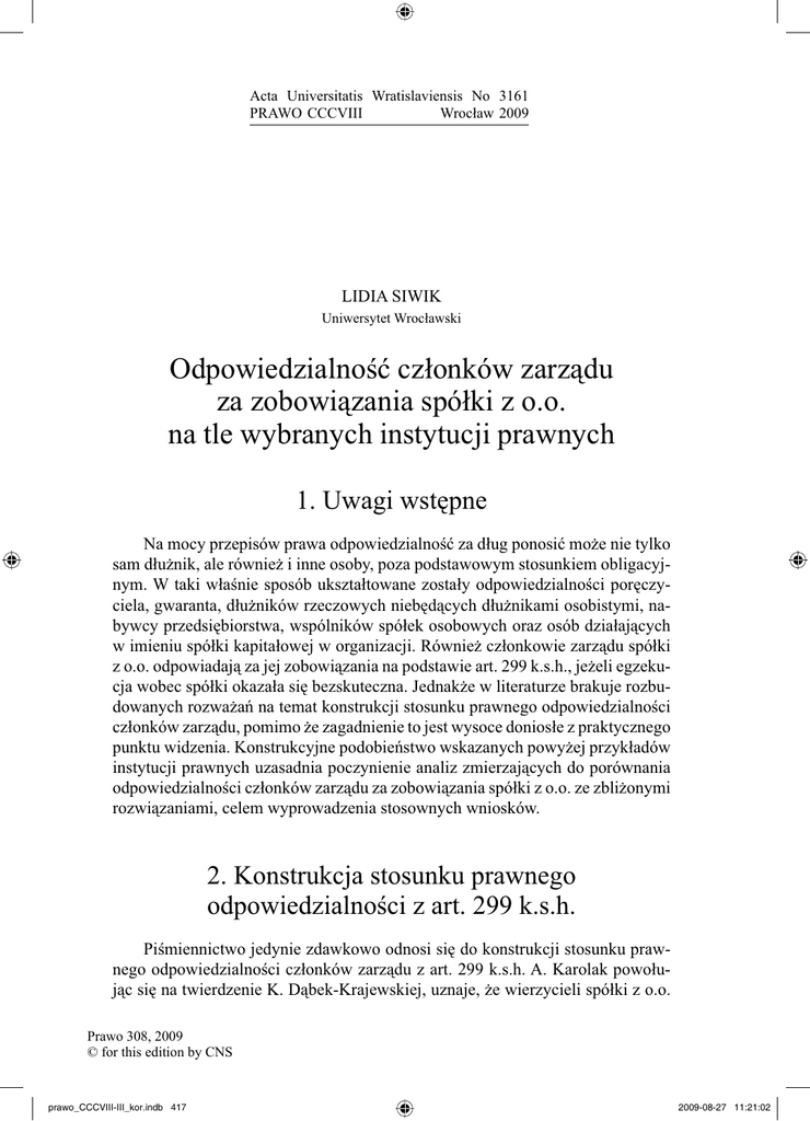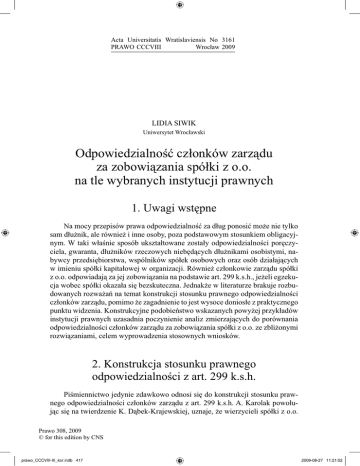 Acta Universitatis Wratislaviensis No 3161 PRAWO CCCVIII Wrocław 2009 LIDIA SIWIK Uniwersytet Wrocławski Odpowiedzialność członków zarządu za zobowiązania spółki z o.o. na tle wybranych instytucji prawnych 1. Uwagi wstępne Na mocy przepisów prawa odpowiedzialność za dług ponosić może nie tylko sam dłużnik, ale również i inne osoby, poza podstawowym stosunkiem obligacyjnym. W taki właśnie sposób ukształtowane zostały odpowiedzialności poręczyciela, gwaranta, dłużników rzeczowych niebędących dłużnikami osobistymi, nabywcy przedsiębiorstwa, wspólników spółek osobowych oraz osób działających w imieniu spółki kapitałowej w organizacji. Również członkowie zarządu spółki z o.o. odpowiadają za jej zobowiązania na podstawie art. 299 k.s.h., jeżeli egzekucja wobec spółki okazała się bezskuteczna. Jednakże w literaturze brakuje rozbudowanych rozważań na temat konstrukcji stosunku prawnego odpowiedzialności członków zarządu, pomimo że zagadnienie to jest wysoce doniosłe z praktycznego punktu widzenia. Konstrukcyjne podobieństwo wskazanych powyżej przykładów instytucji prawnych uzasadnia poczynienie analiz zmierzających do porównania odpowiedzialności członków zarządu za zobowiązania spółki z o.o. ze zbliżonymi rozwiązaniami, celem wyprowadzenia stosownych wniosków. 2. Konstrukcja stosunku prawnego odpowiedzialności z art. 299 k.s.h. Piśmiennictwo jedynie zdawkowo odnosi się do konstrukcji stosunku prawnego odpowiedzialności członków zarządu z art. 299 k.s.h. A. Karolak powołując się na twierdzenie K. Dąbek-Krajewskiej, uznaje, że wierzycieli spółki z o.o. Prawo 308, 2009 © for this edition by CNS prawo_CCCVIII-III_kor.indb 417 2009-08-27 11:21:02 418 LIDIA SIWIK z członkami zarządu nie łączy żaden stosunek prawny1. Jednakże już w innym miejscu zaprzecza wcześniej postawionej tezie i przyjmuje, że w sytuacji objętej hipotezą art. 299 k.s.h. zachodzi podmiotowa zmiana po stronie dłużnika, która nie ma charakteru następstwa prawnego, gdyż członkowie zarządu spółki z o.o. odpowiadają nie zamiast, lecz obok samej spółki2. Teza ta wydaje się przesądzać za opowiedzeniem się przez autora za konstrukcją kumulatywnego przystąpienia do długu. Zgodnie z tą koncepcją aprobowaną przez część doktryny członków zarządu uznaje się za podmioty kumulatywnie przystępujące do długu obciążającego spółkę, przy jednoczesnym braku zwolnienia z długu i odpowiedzialności dotychczasowego dłużnika, czyli spółki3. A. Śmieja przyjmuje natomiast, że w razie spełnienia się przesłanek określonych w art. 299 k.s.h. z mocy ustawy powstaje między członkiem zarządu a niezaspokojonym wierzycielem stosunek obligacyjny, w ramach którego członek zarządu występuje w roli dłużnika, a wierzyciel spółki w roli podmiotu uprawnionego do żądania określonego świadczenia4. Uznał on tym samym, że odpowiedzialność na podstawie art. 299 k.s.h. stanowi typ stosunku obligacyjnego, albowiem ustawodawca posłużył się w tym przepisie pojęciem „odpowiedzialność”, w odmiennym znaczeniu niż przymus zaspokojenia się uprawnionego z majątku osobistego osoby odpowiedzialnej5. Autor twierdzi, iż gdybyśmy odpowiedzialność, rozumianą jako obowiązek znoszenia, zaczęli traktować jako powinność czynnego zachowania, oznaczałoby to zerwanie z całym dotychczasowym dorobkiem cywilistycznym w tej dziedzinie6, a za traktowaniem członka zarządu jako dłużnika w jego ocenie przemawia również wykładnia systemowa. Jeżeli odpowiedzialność z art. 291–294 k.s.h. traktuje się jako obowiązek spełnienia określonego świadczenia, wynikającego z wykreowanego na podstawie tych przepisów stosunku zobowiązaniowego, nie można również art. 299 k.s.h. traktować w zupełnie inny sposób7. Podaje, że przepis art. 21 ust. 3 p.u.n., który nakłada na reprezentantów spółek zobowiązanie do spełnienia na rzecz wierzyciela określonego świadczenia, również posługuje się pojęciem „odpowiedzialność”8. Wywodzi stąd, że nie spo1 A. Karolak, [w:] A. Mariański, A. Karolak, Odpowiedzialność członków rządu za zobowiązania spółki z o.o. w świetle przepisów prawa handlowego i podatkowego, Warszawa 2004, s. 21; K. Dąbek-Krajewska, Przepis art. 298 k.h. jako podstawa odpowiedzialności członków zarządu spółki z o.o., „Rejent” 1999, nr 9, s. 30. 2 A. Mariański, A. Karolak, op. cit., s. 109. 3 Por. orzeczenie SN z 19 XI 1996 (III CZP 114/96) OSNC 1997/3/25 z glosą krytyczną J. Frąckowiaka, OSP 1997, nr 6, s. 298; T. Żyznowski, Odpowiedzialność cywilna w spółkach handlowych. Wybrane zagadnienia, PUG 1996, nr 5, s. 4; M. Radwan-Rohrenschef, Odpowiedzialność cywilna członków zarządu spółek kapitałowych, MoP 1999, nr 6, s. 18–19. 4 A. Śmieja, Charakter prawny odpowiedzialności z art. 299 k.s.h., [w:] Kodeks spółek handlowych po pięciu latach, Wrocław 2006, s. 850. 5 Ibidem, s. 849–850. 6 Ibidem, s. 849. 7 Ibidem. 8 Ibidem, s. 850. Prawo 308, 2009 © for this edition by CNS prawo_CCCVIII-III_kor.indb 418 2009-08-27 11:21:02 Odpowiedzialność członków zarządu za zobowiązania spółki z o.o. 419 sób przypuszczać, aby ustawodawca dla odpowiedzialności z art. 299 k.s.h. i 21 ust. 3 p.u.n. użył tego terminu w dwóch zupełnie różnych znaczeniach. Ponadto A. Śmieja wskazuje, że opowiedzenie się za stanowiskiem odpowiedzialności bez długu stanowiłoby wyzwanie dla sądu, albowiem polska nauka prawa cywilnego ani judykatura nie są w stanie ocenić w pełni dalszych konsekwencji takiej koncepcji9. Uznaje tym samym członka zarządu za odpowiedzialnego za cudzy dług w ramach własnego długu, podobnie jak w przypadku poręczenia, z tą tylko różnicą, że nie z mocy umowy, a z mocy ustawy10. Przyjmuje się, iż członkowie zarządu odpowiadają jedynie w takim zakresie, w jakim wierzyciela nie zaspokoiła sama spółka11