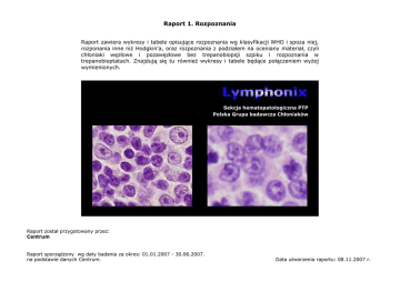 Raport 1. Rozpoznania Raport zawiera wykresy i tabele opisujące rozpoznania wg klasyfikacji WHO i spoza niej, rozponania inne niŜ Hodgkin'a, oraz rozpoznania z podziałem na oceniany materiał, czyli chłoniaki węzłowe i pozawęzłowe bez trepanobiopsji szpiku i rozpoznania w trepanobioptatach. Znajdują się tu równieŜ wykresy i tabele będące połączeniem wyŜej wymienionych. Sekcja hematopatologiczna PTP Polska Grupa badawcza Chłoniaków Raport został przygotowany przez: Centrum Raport sporządzony wg daty badania za okres: 01.01.2007 - 30.06.2007. na podstawie danych Centrum. Data utworzenia raportu: 08.11.2007 r. Sekcja hematopatologiczna PTP / Polska Grupa badawcza Chłoniaków Raport 1. Rozpoznania 1.1 Rozpoznane chłoniaki 95 % 5% Strona 2 z 25 Opis Rozpoznania wg klasyfikacji WHO Rozpoznania spoza klasyfikacji WHO Razem: Ilość 1968 110 2078 Procent 94,7 % 5,3 % 08.11.2007 r. Sekcja hematopatologiczna PTP / Polska Grupa badawcza Chłoniaków Raport 1. Rozpoznania 1.2a Rozpoznane chłoniaki wg klasyfikacji WHO - wykres 18 % 27 % 15 % 23 % 7% 5 % 5% CLL/SLL - Chronic lymphocytic leukaemia/small lymphocytic lymphoma Plasma cell myeloma MCL - Mantle cell lymphoma Pozostałe - poniŜej 3% Strona 3 z 25 DLBCL - Diffuse large B-cell lymphoma NSHL - Nodular sclerosis classical Hodgkin lymphoma FL - Follicular lymphoma 08.11.2007 r. Sekcja hematopatologiczna PTP / Polska Grupa badawcza Chłoniaków Raport 1. Rozpoznania 1.2a Rozpoznane chłoniaki wg klasyfikacji WHO - tabela Nazwa wg klasyfikacji WHO CLL/SLL - Chronic lymphocytic leukaemia/small lymphocytic lymphoma DLBCL - Diffuse large B-cell lymphoma Plasma cell myeloma NSHL - Nodular sclerosis classical Hodgkin lymphoma MCL - Mantle cell lymphoma FL - Follicular lymphoma Pozostałe - poniŜej 3 %: MALT - Extranodal marginal zone B-cell lymphoma of mucosa-associated lymphoid tissue (MALT-lymphoma) HCL - Hairy cell leukaemia CHL - Classical Hodgkin lymphoma MCHL - Mixed cellularity classical Hodgkin lymphoma PTCL-U - Peripheral T-cell lymphoma, unspecified ALCL - Anaplastic large cell lymphoma LDL - Lymphoplasmacytic lymphoma SMZL - Splenic marginal zone lymphoma MF - Mycosis fungoides LBL-B - Precursor B lymphoblastic leukaemia/lymphoma Burkitt lymphoma Med.-DLBCL - Mediastinal (thymic) large B-cell lymphoma NMZL - Nodal marginal zone B-cell lymphoma MGUS - Monoclonal gammopathy of undetermined significance AILT - Angioimmunoblastic T-cell lymphoma NLPHL - Nodular lymphocyte predominant Hodgkin lymphoma LBL-T - Precursor T lymphoblastic leukaemia/lymphoma LRHL - Lymphocyte-rich classical Hodgkin lymphoma PCFCL - Cutaneous follicle centre lymphoma LDHL - Lymphocyte-depleted classical Hodgkin lymphoma Enteropathy-type T-cell lymphoma Composite lymphoma Extranodal NK/T cell lymphoma, nasal type B-PLL - B-cell prolymphocytic leukaemia LCH - Langerhans cell histiocytosis Blastic NK cell lymphoma Cutaneous diffuse large B-cell lymphoma Cutaneous marginal zone B-cell lymphoma Strona 4 z 25 Ilość Procent1 Procent2 533 27,1 % 25,6 % 360 18,3 % 17,3 % 287 14,6 % 13,8 % 131 6,7 % 6,3 % 108 5,5 % 5,2 % 90 4,6 % 4,3 % 50 39 39 38 38 27 25 25 21 20 20 17 15 11 9 9 6 5 4 4 3 3 3 2 2 2 2 2 2,5 2,0 2,0 1,9 1,9 1,4 1,3 1,3 1,1 1,0 1,0 0,9 0,8 0,6 0,5 0,5 0,3 0,3 0,2 0,2 0,2 0,2 0,2 0,1 0,1 0,1 0,1 0,1 % % % % % % % % % % % % % % % % % % % % % % % % % % % % 2,4 1,9 1,9 1,8 1,8 1,3 1,2 1,2 1,0 1,0 1,0 0,8 0,7 0,5 0,4 0,4 0,3 0,2 0,2 0,2 0,1 0,1 0,1 0,1 0,1 0,1 0,1 0,1 % % % % % % % % % % % % % % % % % % % % % % % % % % % % 08.11.2007 r. Sekcja hematopatologiczna PTP / Polska Grupa badawcza Chłoniaków Nazwa wg klasyfikacji WHO Extraosseous plasmacytoma Lymphomatoid papulosis C-ALCL - Primary cutaneous anaplastic large cell lymphoma T-LGL - T-cell large granular lymphocytic leukaemia BL - Burkitt lymphoma/leukaemia ISM - Indolent systemic mastocytosis ATLL - Adult T-cell leukaemia/lymphoma LYG - Lymphomatoid granulomatosis Mast cell leukaemia Sezary syndrome Aggressive NK cell leukaemia Diffuse cutaneous mastocytosis Solitary plasmacytoma of bone Primary cutaneous small-medium CD4+ T-cell lymphoma Cutaneous adult T-cell leukaemia/lymphoma Extracutaneous mastocytoma Razem: Raport 1. Rozpoznania Ilość 2 2 1 1 1 1 1 1 1 1 1 1 1 1 1 1 1968 Procent1 Procent2 0,1 % 0,1 % 0,1 % 0,1 % 0,1 % 0,0 % 0,1 % 0,0 % 0,1 % 0,0 % 0,1 % 0,0 % 0,1 % 0,0 % 0,1 % 0,0 % 0,1 % 0,0 % 0,1 % 0,0 % 0,1 % 0,0 % 0,1 % 0,0 % 0,1 % 0,0 % 0,1 % 0,0 % 0,1 % 0,0 % 0,1 % 0,0 % 94,7 % Procent1 - określa udział procentowy chłoniaka wśród chłoniaków zaklasyfikowanych wg WHO Procent2 - określa udział procentowy chłoniaka wśród wszystkich chłoniaków Strona 5 z 25 08.11.2007 r. Sekcja hematopatologiczna PTP / Polska Grupa badawcza Chłoniaków Raport 1. Rozpoznania 1.2b Rozpoznane chłoniaki wg klasyfikacji WHO - jedynie NHL - wykres 31 % 21 % 16 % 21 % 6 % CLL/SLL - Chronic lymphocytic leukaemia/small lymphocytic lymphoma Plasma cell myeloma FL - Follicular lymphoma Strona 6 z 25 5 % DLBCL - Diffuse large B-cell lymphoma MCL - Mantle cell lymphoma Pozostałe - poniŜej 3% 08.11.2007 r. Sekcja hematopatologiczna PTP / Polska Grupa badawcza Chłoniaków Raport 1. Rozpoznania 1.2b Rozpoznane chłoniaki wg klasyfikacji WHO - jedynie NHL - tabela Nazwa wg klasyfikacji WHO CLL/SLL - Chronic lymphocytic leukaemia/small lymphocytic lymphoma DLBCL - Diffuse large B-cell lymphoma Plasma cell myeloma MCL - Mantle cell lymphoma FL - Follicular lymphoma Pozostałe - poniŜej 3 %: MALT - Extranodal marginal zone B-cell lymphoma of mucosa-associated lymphoid tissue (MALT-lymphoma) HCL - Hairy cell leukaemia PTCL-U - Peripheral T-cell lymphoma, unspecified ALCL - Anaplastic large cell lymphoma LDL - Lymphoplasmacytic lymphoma SMZL - Splenic marginal zone lymphoma MF - Mycosis fungoides LBL-B - Precursor B lymphoblastic leukaemia/lymphoma Burkitt lymphoma Med.-DLBCL - Mediastinal (thymic) large B-cell lymphoma NMZL - Nodal marginal zone B-cell lymphoma MGUS - Monoclonal gammopathy o