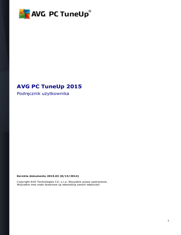 AVG PC TuneUp 2015 Podręcznik użytkownika Korekta dokumentu 2015.02 (8/13/2014) C opyright AVG Technologies C Z, s.r.o. Wszystkie prawa zastrzeżone. Wszystkie inne znaki towarowe są własnością swoich właścicieli. 1 Spis treści ........................................................................................................................ 4 1. Witamy w programie AVG PC TuneUp! .......................................................................................................... 4 1.1 Wymagania systemowe .......................................................................................................... 4 1.2 Pomoc i wsparcie ........................................................................................................................ 5 2. Start Center ........................................................................................................................ 8 3. Tryby komputera .......................................................................................................... 8 3.1 Tryb Ekonomiczny .......................................................................................................... 12 3.2 Tryb Standardowy .......................................................................................................... 12 3.3 Tryb Turbo ........................................................................................................................ 17 4. Tryb samolotowy ........................................................................................................................ 18 5. Możliwości optymalizacji ........................................................................................................................ 20 6. Pasek menu ........................................................................................................................ 21 7. Tablica przyrządów .......................................................................................................... 23 7.1 Utrzymanie systemu .......................................................................................................... 25 7.2 Zwiększanie wydajności .......................................................................................................... 27 7.3 Naprawianie problemów 28 7.4 Ochrona.......................................................................................................... systemu ........................................................................................................................ 31 8. Optymalizacja .......................................................................................................... 32 8.1 Zmniejszanie obciążenia systemu .......................................................................................................... 44 8.2 Optymalizacja rejestru i wydajności ........................................................................................................................ 56 9. Oczyszczanie .......................................................................................................... 57 9.1 Sprzątanie systemu Windows i programów .......................................................................................................... 59 9.2 Czyszczenie danych przeglądarki .......................................................................................................... 61 9.3 Usuwanie niedziałających skrótów .......................................................................................................... 62 9.4 Dezaktywacja funkcji systemu Windows .......................................................................................................... 63 9.5 Wyszukiwanie i usuwanie zduplikowanych plików .......................................................................................................... 64 9.6 Wyszukiwanie i usuwanie dużych plików .......................................................................................................... 69 9.7 Bezpieczne usuwanie danych 72 10......................................................................................................................... Napraw problemy .......................................................................................................... 73 10.1 Naprawianie typowych problemów 2 .......................................................................................................... 74 10.2 Wyszukaj błędy na dysku .......................................................................................................... 76 10.3 Przywracanie usuniętych plików .......................................................................................................... 79 10.4 Zarządzanie uruchomionymi procesami .......................................................................................................... 81 10.5 Wyświetl informacje o systemie 83 11......................................................................................................................... Personalizuj .......................................................................................................... 84 11.1 Personalizacja opcji i zachowań .......................................................................................................... 105 11.2 Personalizacja wyglądu systemu Windows ........................................................................................................................ 118 12. Wszystkie funkcje .......................................................................................................... 123 12.1 Edytowanie rejestru .......................................................................................................... 124 12.2 Sprawdzanie aktualizacji .......................................................................................................... 125 12.3 Wyświetlanie Raportu optymalizacji AVG ........