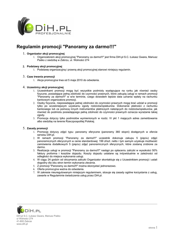 Regulamin promocji "Panoramy za darmo!!!" 1. Organizator akcji promocyjnej 1. Organizatorem akcji promocyjnej "Panoramy za darmo!!!" jest firma DiH.pl S.C. Łukasz Gwara, Mariusz Paśko z siedzibą w Zabrzu, ul. Wolności 274 2. Podstawy akcji promocyjnej 1. Podstawę organizacyjną i prawną akcji promocyjnej stanowi niniejszy regulamin. 3. Czas trwania promocji 1. Akcja promocyjna trwa od 5 maja 2010 do odwołania. 4. Uczestnicy akcji promocyjnej 1. Uczestnikami promocji mogą być wszystkie podmioty występujące na rynku jak również osoby fizyczne, posiadające pełną zdolność do czynności prawnych, które zakupią usługi w ramach promocji "Panoramy za darmo!!!" w w/w terminie, czego dowodem będzie data uznania wpłaty na rachunku bankowym organizatora promocji. 2. Osoby fizyczne, nieposiadające pełnej zdolności do czynności prawnych mogą brać udział w promocji tylko po wcześniejszym uzyskaniu zgody rodziców/opiekunów. Dokonanie płatności z rachunku bankowego lub za pomocą innych instrumentów płatniczych należących do rodziców/opiekunów, jak również do podmiotu posiadającego pełną zdolność do czynności prawnych oznacza wyrażanie takiej zgody. 3. Promocja dotyczy tylko podmiotów wymienionych w rozdz. IV pkt 1 mających adres zameldowania albo siedzibę na terenie Rzeczpospolitej Polskiej. 5. Zasady promocji 1. Promocja dotyczy zdjęć typu: panoramy sferyczne (panoramy 360 stopni) dostępnych w ofercie serwisu DiH.pl. 2. W ramach promocji "Panoramy za darmo!!!" uczestnik dokonuje zakupu 5 (pięciu) zdjęć panoramicznych sferycznych w cenie standardowej: 199 zł/szt. netto i tym samym uzyskuje możliwość zamówienia dodatkowych 5 (pięciu) zdjęć panoramicznych sferycznych, które zostaną zrobione za darmo. 3. Realizacja usługi w promocji "Panoramy za darmo!!!" nastąpi po opłaceniu zaliczki w wysokości 50% faktury proforma i kosztów dojazdu. Koszty dojazdu ustalane są indywidualnie w zależności od odległości do miejsca wykonania usługi. 4. W ciągu 24 godzin od otrzymania zaliczki Organizator skontaktuje się z Uczestnikiem promocji i ustali dogodny dla obu stron termin wykonania zlecenia. 5. Z promocji "Panoramy za darmo!!!" można skorzystać jednorazowo. 6. Oferta promocyjna ważna do odwołania. 7. W zakresie nieuregulowanym niniejszym regulaminem, stosuje się zasady ogólne korzystania z usług, zawarte w Regulaminie świadczenia usług przez DiH.pl. DiH.pl S.C. Łukasz Gwara, Mariusz Paśko ul Wolności 274 41-800 Zabrze www.dih.pl strona 1