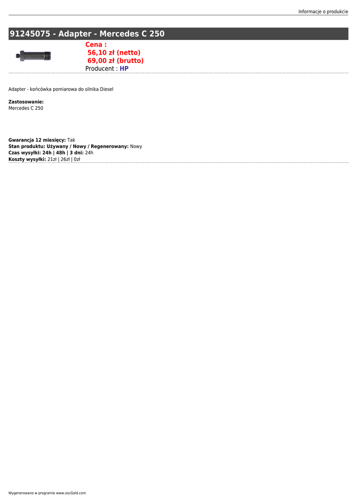 Informacje o produkcie 91245075 - Adapter - Mercedes C 250 Cena : 56,10 zł (netto) 69,00 zł (brutto) Producent : HP Adapter - końcówka pomiarowa do silnika Diesel Zastosowanie: Mercedes C 250 koncowka, końcowka, koncówka, Diesla Gwarancja 12 miesięcy: Tak Stan produktu: Używany / Nowy / Regenerowany: Nowy Czas wysyłki: 24h | 48h | 3 dni: 24h Koszty wysyłki: 21zł | 26zł | 0zł Wygenerowano w programie www.oscGold.com