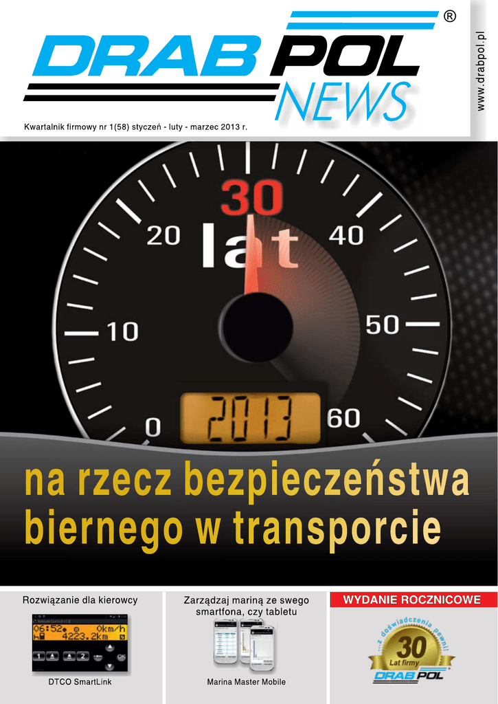 AKTUALNOŚCI • WYDARZENIA Nadtytuł PODTYTUŁ Od redakcji S P I S T R E ŚC I Akt u al n o ś c i G azel a B iz n e s u 2 D rabpol - „ B e z tr z y ma n ki ” 2 Bal Lotn ik ó w 3 G ratulacje d la fir my S o lar i s 3 Tema t n u m e r u M am y ju ż 3 0 la t! 4 Dzi ał lą d o wy Z wi z y tą n a P o d la s iu 7 D TC O Sma r tL in k 7 Klucz DLK P RO 9 Pierw s z y a u to k a r z F u n t or o 9 Prezentu je my fir mę Z i- C o 10 N ow ośc i w te le ma ty c e 11 Sy s tem h a mu lc o wy A T E 13 Prz egląd k lima ty z a c ji 13 Tachogr a fy b e z ta je mn ic 14 Dzi ał lo t n i c z y Konwencja A E A 15 N ow ośc i w r e tr o fita c h 16 Łącz noś ć b e z z a k łó c e ń 17 Prezentu je my fir mę IBE X 19 Sukc es Biu r a PA RT 2 1 21 Dzi ał mo r s k i N ow a sie d z ib a Od z ia łu M ar i ne 22 Targi Wia tr i W o d a 2 0 1 3 22 M ari na Ma s te r Mo b ile 23 M obilna p o mp a 24 Sterownik Se ijs e n e r 25 K ącik te c h n ic z n o - s e r w i s ow y 26 Napi s al i o n a s 26 Wydawnictwo firmy DRABPOL Wydawca: Drabpol sp. jawna P. Drabczyński i Wspólnik 42-233 Mykanów, ul. Akacjowa 24/26 tel.0-34 366 00 22, fax 0-34 366 01 02 [email protected], www.drabpol.pl 1 Szanowni Państwo! Drodzy Czytelnicy! Otwieramy pierwszy, tegoroczny numer Drabpol Newsa. Ten rok jest dla naszej firmy szczególnie ważny, świętujemy bowiem okrągły jubileusz - trzydziestolecia działalności na polskim rynku. Na przestrzeniu tylu lat firma nasza przeszła istną metamorfozę od małego Zakładu Napraw Sprzętu i Elektroniki do firmy, będącej przedstawicielem wielu światowych koncernów, zatrudniającej blisko 80 pracowników. Cieszymy się, że udało nam się wypracować stabilną i mocną pozycję na rynku i że przez naszych klientów i partnerów postrzegani jesteśmy jako wiarygodny i solidny partner w interesach. Mamy nadzieję, że tegoroczne numery naszego wydawnictwa dostarczą Państwu wielu, nowych, ciekawych informacji. Chcielibyśmy również poznać opinie naszych Czytelników na temat naszej gazety. Umożliwią nam one spojrzenie na nasz kwartalnik z innej strony i dopracowanie go tak, by jeszcze lepiej służył Państwu za źródło ciekawych informacji. Wszelkie sugestie prosimy kierować na adres: [email protected] Wa rto przeczyt ać! Z nowym rokiem w ofercie wielu firm często pojawiają się produktowe nowości. Nie zabrakło ich również w naszej firmie. W pierwszym, naszym wydaniu w 2013r. przedstawiamy ciekawe, nowe rozwiązania, zarówno z zakresu telematyki, jak i te, związane z tachografami, czy rynkiem marine, a także zupełnie nowe - jak systemy hamulcowe ATE. Na uwagę zasługuje produkt, dedykowany po raz pierwszy specjalnie dla kierowcy– DTCO SmartLink - który śmiało można nazwać przełomowym. Ciekawymi spostrzeżeniami z rynku drogowego oraz lotniczego podzielili się z nami nasi Klienci i Partnerzy; polecamy rozmowy z nimi i życzymy miłej lektury. Produkty HR-Smith Trailer Tracking str. 12 str. 17 AKTUALNOŚCI • WYDARZENIA GAZELA BIZNESU Już po raz kolejny firma nasza znalazła się w gronie laureatów ogólnopolskiego rankingu najdynamiczniej rozwijających się małych i średnich przedsiębiorstw. Tym samym otrzymała tytuł Gazeli Biznesu. Ranking Gazele Biznesu organizowany jest od 2000 roku przez redakcję dziennika Puls Biznesu. W tegorocznym plebiscycie zweryfiko- O tytuł Gazeli Biznesu 2012 mogły ubiegać się przedsiębiorstwa, które podczas minionych trzech lat zanotowały stały wzrost przychodów ze sprzedaży i ani razu nie zarejestrowały straty. wane zostały osiągnięcia z okresu 2009 – 2010 - 2011. O możliwości zakwalifikowania się do rankingu decyduje także przejrzystość działania, przejawiająca się publikowaniem własnych wyników finansowych. Firma nasza zanotowała 123% wzrostu przychodów w porównaniu do roku 2011. W czasie uroczystej Gali, podczas której wręczano Gazele Biznesu firmę naszą reprezentował Bartosz Drabczyński - Dyrektor ds. administracji (drugi z prawej). Już po raz kolejny uhonorowani zostaliśmy tytułem Gazela Biznesu. Cieszy nas fakt, że mimo niełatwej sytuacji na rynku udaje nam się co roku rozwijać swoją działalność i poszerzać ofertę produktową, by jak najlepiej zaspokoić potrzeby naszych Klientów. A przełożenie tego na zwiększone obroty daje nam tym bardziej powód do zadowolenia. Jest nam naprawdę miło, że nasze starania są doceniane, o czym świadczy tytuł Gazeli Biznesu – mówi Prezes Paweł Drabczyński. Ranking Gazele Biznesu to najbardziej prestiżowa i znana tego typu lista w naszym kraju. Z uwagi na swoją tradycję zestawienie zapewnia uznanie wśród konsumentów i przedsiębiorstw, dla których tytuł „Gazela Biznesu” świadczy o dobrej kondycji i uczciwości wyróżnionych firm. Uroczysta Gala wręczenia Gazel Biznesu dla firm z województwa śląskiego, a więc i dla naszej miała miejsce w Sosnowcu dnia 23 stycznia. Wszystkim laureatom serdecznie gratulujemy i życzymy dalszych sukcesów w ich codziennej działalności. AKTUALNOŚCI • WYDARZENIA W g r onie najdy namicznie j rozwija j ą c y c h s i ę fi r m D r a bpol par t ne rem progra mu BE Z T RZ Y MANKI WSPÓLNIE DLA BEZPIECZEŃSTWA NA DROGACH Z początkiem nowego roku firma nasza została partnerem programu BEZ Trzymanki. To nowy program, w którym Mariusz Sokołowski - rzecznik KGP i Alvin Gajadhur - rzecznik GITD piętnują naganne zachowania kierowców na polskich drogach. W programie wykorzystywane są nagrania wykroczeń zarejestrowane przez wideorejestratory Policji i Inspekcji Transportu Drogowego, jak i te nadsyłane przez internautów. Program dostępny jest na portalu gazeta.tv, jak i na naszym kanale youtube. W ostatnich odcinkach prezentowane były tak drastyczne naruszenia zasad bezpieczeństwa, jak wyprzedzanie na pasach, mijanie rowerzysty przez tira w odległości zaledwie kilku centymetrów, brawuro- wa jazda motocyklem na jednym kole przed radiowozem policyjnym
