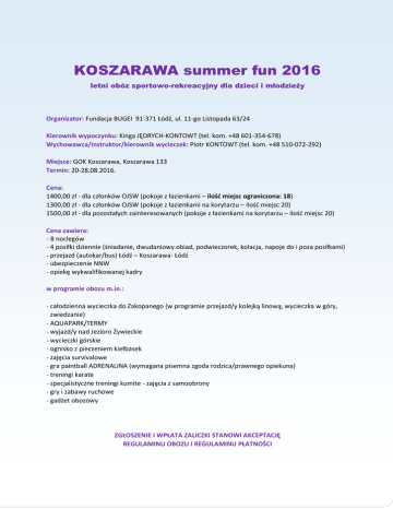 KOSZARAWA summer fun 2016 letni obóz sportowo-rekreacyjny dla dzieci i młodzieży Organizator: Fundacja BUGEI 91-371 Łódź, ul. 11-go Listopada 63/24 Kierownik wypoczynku: Kinga JĘDRYCH-KONTOWT (tel. kom. +48 601-354-678) Wychowawca/instruktor/kierownik wycieczek: Piotr KONTOWT (tel. kom. +48 510-072-292) Miejsce: GOK Koszarawa, Koszarawa 133 Termin: 20-28.08.2016. Cena: 1400,00 zł - dla członków OJSW (pokoje z łazienkami – ilość miejsc ograniczona: 18) 1300,00 zł - dla członków OJSW (pokoje z łazienkami na korytarzu – ilość miejsc 20) 1500,00 zł - dla pozostałych zainteresowanych (pokoje z łazienkami na korytarzu – ilość miejsc 20) Cena zawiera: - 8 noclegów - 4 posiłki dziennie (śniadanie, dwudaniowy obiad, podwieczorek, kolacja, napoje do i poza posiłkami) - przejazd (autokar/bus) Łódź – Koszarawa- Łódź - ubezpieczenie NNW - opiekę wykwalifikowanej kadry w programie obozu m.in.: - całodzienna wycieczka do Zakopanego (w programie przejazd/y kolejką linową, wycieczka w góry, zwiedzanie) - AQUAPARK/TERMY - wyjazd/y nad Jezioro Żywieckie - wycieczki górskie - ognisko z pieczeniem kiełbasek - zajęcia survivalowe - gra paintball ADRENALINA (wymagana pisemna zgoda rodzica/prawnego opiekuna) - treningi karate - specjalistyczne treningi kumite - zajęcia z samoobrony - gry i zabawy ruchowe - gadżet obozowy ZGŁOSZENIE I WPŁATA ZALICZKI STANOWI AKCEPTACJĘ REGULAMINU OBOZU I REGULAMINU PŁATNOŚCI