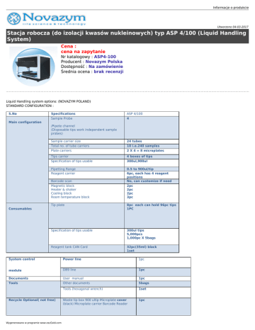 Informacje o produkcie Utworzono 04-03-2017 Stacja robocza (do izolacji kwasów nukleinowych) typ ASP 4/100 (Liquid Handling System) Cena : cena na zapytanie Nr katalogowy : ASP4-100 Producent : Novazym Polska Dostępność : Na zamówienie Średnia ocena : brak recenzji Liquid Handling system options: (NOVAZYM POLAND) STANDARD CONFIGURATION : S.No Specifications Sample Probe ASP 4/100 4 Main configuration /Pipete channel (Disposable tips work independent sample probes) Sample carrier size Total no. of tube carriers Plate carriers 24 tubes 10 i.e.240 samples 2 X 4 = 8 microplates Tips carrier Specification of tips usable 4 boxes of tips 300ul,900ul Pipetting Range Reagent carrier 0.5 to 900ul/tip 6pc, each has 4 reagent positions No, can customize if need 2pc 2pc 2pc 3pc Barcode scan Magnetic block Heater & shaker Cooling block Room temperature block Tip plate 8pc each can hold 96pc tips 1PC Specification of tips usable 300ul tips 5,000pcs 1,000pc X 5bags Reagent tank CAN Card 32pc(35ml) black 1set Consumables System control Power line 1pc module DB9 line 1pc Documents Tools User manual Other documents 1pc 5bags Tools (hexagonal wrench) 1set Waste tip box 900 ultip Microplate cover (black) Microplate carrier Barcode Reader 1pc Recycle Optional( not free) Wygenerowano w programie www.oscGold.com Functions of liquid handling Pipetting, distribution, dilution, aggregation, Liquid level monitoring, clot monitoring Tip monitoring Real-time procedure monitoring, HIS/LIS