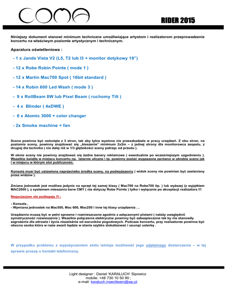 RIDER 2015 Niniejszy dokument stanowi minimum techniczne umożliwiające artystom i realizatorom przeprowadzenie koncertu na właściwym poziomie artystycznym i technicznym. Aparatura oświetleniowa : - 1 x Jands Vista V2 (L5, T2 lub I3 + monitor dotykowy 19”) - 12 x Robe Robin Pointe ( mode 1 ) - 12 x Martin Mac700 Spot ( 16bit standard ) - 14 x Robin 600 Led Wash ( mode 3 ) - 9 x RollBeam 8W lub Pixel Beam ( ruchomy Tilt ) - 4 x Blinder ( 4xDWE ) - 6 x Atomic 3000 + color changer - 2x Smoke machine + fan Scena powinna być osłonięta z 3 stron, tak aby tylna wysłona nie przeszkadzała w pracy urządzeń. Z obu stron, na poziomie sceny, powinny znajdować się „kieszenie” minimum 2x2m – z jednej strony dla monitorowca zespołu, z drugiej dla technika ( nie dalej niż w 1/3 głębokości sceny patrząc od przodu ). W oknie sceny nie powinny znajdować się żadne banery reklamowe ( ewentualnie po wcześniejszym uzgodnieniu ). Wszelkie światła w miejscu koncertu np. latarnie uliczne i tp. powinny zostać wygaszone zarówno w obrębie sceny jak i w miejscu w którym stoi publiczność. Konsola musi być ustawiona naprzeciwko środka sceny, na podwyższeniu ( widok sceny nie powinien być zasłaniany przez widzów ). Zmiana jednostek jest możliwa jedynie na sprzęt tej samej klasy ( Mac700 na Robe700 itp. ) lub wyższej (z wyjątkiem MAC2000 ), z systemem mieszania barw CMY ( nie dotyczy Robe Pointe ) tylko i wyłącznie po akceptacji realizatora !!! Negocjacjom nie podlegają !!! : - Konsola , - Wymiana jednostek na Mac500, Mac 600, Mac250 i inne tej klasy urządzenia … Urządzenia muszą być w pełni sprawne i rozmieszczone zgodnie z załączonymi plotami ( należy uwzględnić symetryczność rozwieszenia ). Wszelkie połączenia elektryczne powinny być zabezpieczone tak by nie stanowiły zagrożenia dla zdrowia i życia niezależnie od warunków pogodowych. Podczas koncertu, przy realizatorze powinna być obecna osoba która w razie awarii będzie w stanie szybko zlokalizować i usunąć usterkę . W przypadku problemu z wypożyczeniem stołu istnieje możliwość jego odpłatnego dostarczenia – w tej sprawie proszę o kontakt telefoniczny. Light designer : Daniel ‘KARALUCH’ Sipowicz mobile: +48 730 10 50 90 ; e-mail: [email protected]