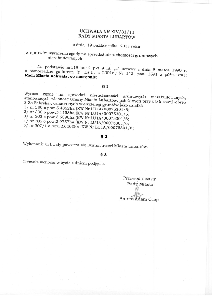 UCHWAŁA NR XIV/81/ 11 RADY MIASTA LUBARTÓW z dnia 19 października 2011 roku w sprawie: wyrażenia zgody na sprzedaż nieruchomości gruntowych niezabudowanych Na podstawie art.18 ust.2 pkt 9 lit. "a" ustawy z dnia 8 marca 1990 r. o samorządzie gminnym (tj. Dz.U. z 2001r., Nr 142, poz. 1591 z późno zm.); Rada Miasta uchwala, co następuje: §1 Wyraża zgodę na sprzedaż nieruchomości gruntowych niezabudowanych, stanowiących własność Gminy Miasto Lubartów, położonych przy ul.Gazowej (obręb 8-Za Fabryką), oznaczonych w ewidencji gruntów jako działki: 1/ nr 299 o pow.5.4352ha (KWNr LU1A/00075301/6; 2/ nr 300 o pow.5.1158ha (KWNr LU1A/0007530 1/6; 3/ nr 303 o pow.3.6390ha (KWNr LU1A/00075301/6; 4/ nr 305 o pow.2.9757ha (KWNr LU1A/00075301/6; 5/ nr 307/1 o pow.2.6103ha (KWNr LU1A/00075301/6; §2 Wykonanie uchwały powierza się Burmistrzowi Miasta Lubartów. §3 Uchwała wchodzi w życie z dniem podjęcia. Przewodniczący Rad 1 Miasta