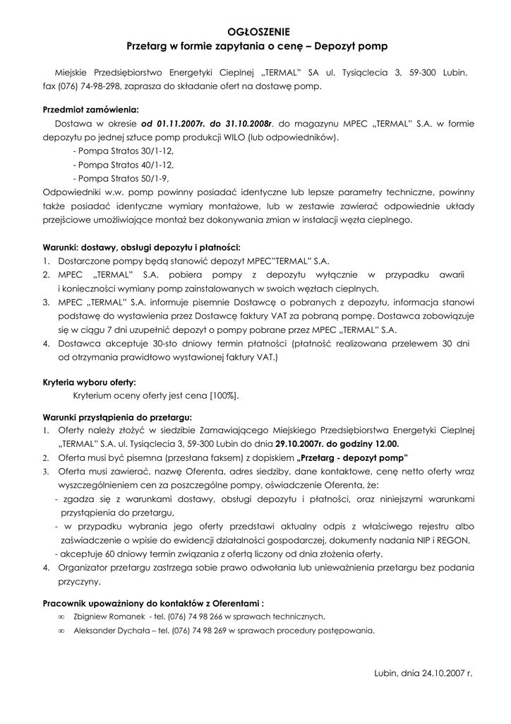 OGŁOSZENIE Przetarg w formie zapytania o cenę – Depozyt pomp Miejskie Przedsiębiorstwo Energetyki Cieplnej „TERMAL” SA ul. Tysiąclecia 3, 59-300 Lubin, fax (076) 74-98-298, zaprasza do składanie ofert na dostawę pomp. Przedmiot zamówienia: Dostawa w okresie od 01.11.2007r. do 31.10.2008r. do magazynu MPEC „TERMAL” S.A. w formie depozytu po jednej sztuce pomp produkcji WILO (lub odpowiedników). - Pompa Stratos 30/1-12, - Pompa Stratos 40/1-12, - Pompa Stratos 50/1-9, Odpowiedniki w.w. pomp powinny posiadać identyczne lub lepsze parametry techniczne, powinny także posiadać identyczne wymiary montażowe, lub w zestawie zawierać odpowiednie układy przejściowe umożliwiające montaż bez dokonywania zmian w instalacji węzła cieplnego. Warunki: dostawy, obsługi depozytu i płatności: 1. Dostarczone pompy będą stanowić depozyt MPEC”TERMAL” S.A. 2. MPEC „TERMAL” S.A. pobiera pompy z depozytu wyłącznie w przypadku awarii i konieczności wymiany pomp zainstalowanych w swoich węzłach cieplnych. 3. MPEC „TERMAL” S.A. informuje pisemnie Dostawcę o pobranych z depozytu, informacja stanowi podstawę do wystawienia przez Dostawcę faktury VAT za pobraną pompę. Dostawca zobowiązuje się w ciągu 7 dni uzupełnić depozyt o pompy pobrane przez MPEC „TERMAL” S.A. 4. Dostawca akceptuje 30-sto dniowy termin płatności (płatność realizowana przelewem 30 dni od otrzymania prawidłowo wystawionej faktury VAT.) Kryteria wyboru oferty: Kryterium oceny oferty jest cena [100%]. Warunki przystąpienia do przetargu: 1. Oferty należy złożyć w siedzibie Zamawiającego Miejskiego Przedsiębiorstwa Energetyki Cieplnej „TERMAL” S.A. ul. Tysiąclecia 3, 59-300 Lubin do dnia 29.10.2007r. do godziny 12.00. 2. Oferta musi być pisemna (przesłana faksem) z dopiskiem „Przetarg - depozyt pomp” 3. Oferta musi zawierać, nazwę Oferenta, adres siedziby, dane kontaktowe, cenę netto oferty wraz wyszczególnieniem cen za poszczególne pompy, oświadczenie Oferenta, że: - zgadza się z warunkami dostawy, obsługi depozytu i płatności, oraz niniejszymi warunkami przystąpienia do przetargu, - w przypadku wybrania jego oferty przedstawi aktualny odpis z właściwego rejestru albo zaświadczenie o wpisie do ewidencji działalności gospodarczej, dokumenty nadania NIP i REGON, - akceptuje 60 dniowy termin związania z ofertą liczony od dnia złożenia oferty. 4. Organizator przetargu zastrzega sobie prawo odwołania lub unieważnienia przetargu bez podania przyczyny. Pracownik upoważniony do kontaktów z Oferentami : • Zbigniew Romanek - tel. (076) 74 98 266 w sprawach technicznych, • Aleksander Dychała – tel. (076) 74 98 269 w sprawach procedury postępowania. Lubin, dnia 24.10.2007 r.
