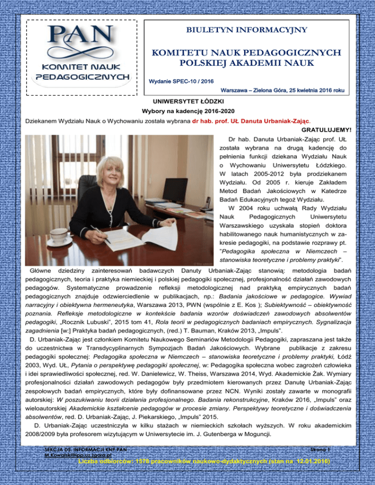BIULETYN INFORMACYJNY KOMITETU NAUK PEDAGOGICZNYCH POLSKIEJ AKADEMII NAUK Wydanie SPEC-10 / 2016 Warszawa – Zielona Góra, 25 kwietnia 2016 roku UNIWERSYTET ŁÓDZKI Wybory na kadencję 2016-2020 ewnie Dziekanem Wydziału Nauk o Wychowaniu została wybrana dr hab. prof. UŁ Danuta Urbaniak-Zając. GRATULUJEMY! Dr hab. Danuta Urbaniak-Zając prof. UŁ została wybrana na drugą kadencję do pełnienia funkcji dziekana Wydziału Nauk o Wychowaniu Uniwersytetu Łódzkiego. W latach 2005-2012 była prodziekanem Wydziału. Od 2005 r. kieruje Zakładem Metod Badań Jakościowych w Katedrze Badań Edukacyjnych tegoż Wydziału. W 2004 roku uchwałą Rady Wydziału Nauk Pedagogicznych Uniwersytetu Warszawskiego uzyskała stopień doktora habilitowanego nauk humanistycznych w zakresie pedagogiki, na podstawie rozprawy pt. ”Pedagogika społeczna w Niemczech – stanowiska teoretyczne i problemy praktyki”. Główne dziedziny zainteresowań badawczych Danuty Urbaniak-Zając stanowią: metodologia badań pedagogicznych, teoria i praktyka niemieckiej i polskiej pedagogiki społecznej, profesjonalność działań zawodowych pedagogów. Systematyczne prowadzenie refleksji metodologicznej nad praktyką empirycznych badań pedagogicznych znajduje odzwierciedlenie w publikacjach, np.: Badania jakościowe w pedagogice. Wywiad narracyjny i obiektywna hermeneutyka, Warszawa 2013, PWN (wspólnie z E. Kos ); Subiektywność – obiektywność poznania. Refleksje metodologiczne w kontekście badania wzorów doświadczeń zawodowych absolwentów pedagogiki, „Rocznik Lubuski”, 2015 tom 41, Rola teorii w pedagogicznych badaniach empirycznych. Sygnalizacja zagadnienia [w:] Praktyka badań pedagogicznych, (red.) T. Bauman, Kraków 2013, „Impuls”. D. Urbaniak-Zając jest członkiem Komitetu Naukowego Seminariów Metodologii Pedagogiki, zapraszana jest także do uczestnictwa w Transdycyplinarnych Sympozjach Badań Jakościowych. Wybrane publikacje z zakresu pedagogiki społecznej: Pedagogika społeczna w Niemczech – stanowiska teoretyczne i problemy praktyki, Łódź 2003, Wyd. UŁ, Pytania o perspektywę pedagogiki społecznej, w: Pedagogika społeczna wobec zagrożeń człowieka i idei sprawiedliwości społecznej, red. W. Danielewicz, W. Theiss, Warszawa 2014, Wyd. Akademickie Żak. Wymiary profesjonalności działań zawodowych pedagogów były przedmiotem kierowanych przez Danutę Urbaniak-Zając zespołowych badań empirycznych, które były dofinansowane przez NCN. Wyniki zostały zawarte w monografii autorskiej: W poszukiwaniu teorii działania profesjonalnego. Badania rekonstrukcyjne, Kraków 2016, „Impuls” oraz wieloautorskiej Akademickie kształcenie pedagogów w procesie zmiany. Perspektywy teoretyczne i doświadczenia absolwentów, red. D. Urbaniak-Zając, J. Piekarskiego, „Impuls” 2015. D. Urbaniak-Zając uczestniczyła w kilku stażach w niemieckich szkołach wyższych. W roku akademickim 2008/2009 była profesorem wizytującym w Uniwersytecie im. J. Gutenberga w Moguncji. SEKCJA DS. INFORMACJI KNP PAN [email protected] Strona 1 Liczba odbiorców: 1578 pracowników naukowo-dydaktycznych (stan na 12.01.2016)