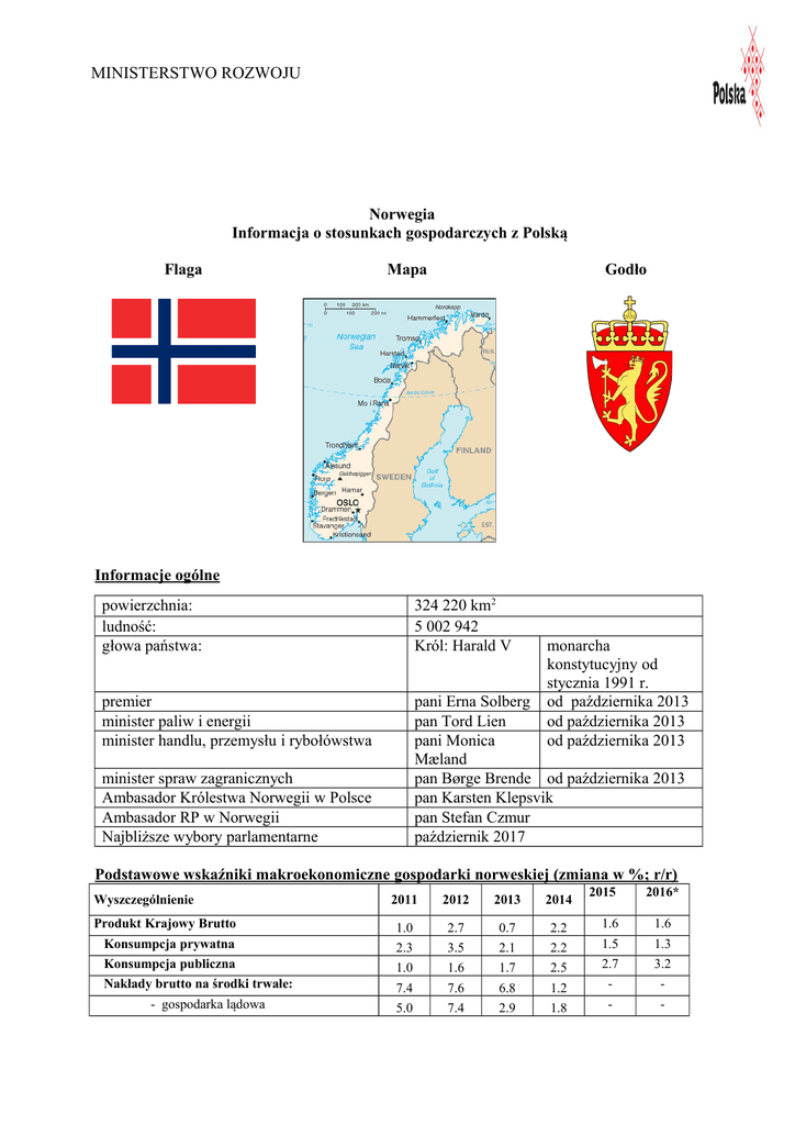 MINISTERSTWO ROZWOJU Norwegia Informacja o stosunkach gospodarczych z Polską Flaga Mapa Godło Informacje ogólne powierzchnia: ludność: głowa państwa: 324 220 km2 5 002 942 Król: Harald V premier minister paliw i energii minister handlu, przemysłu i rybołówstwa pani Erna Solberg pan Tord Lien pani Monica Mæland pan Børge Brende od października 2013 pan Karsten Klepsvik pan Stefan Czmur październik 2017 minister spraw zagranicznych Ambasador Królestwa Norwegii w Polsce Ambasador RP w Norwegii Najbliższe wybory parlamentarne monarcha konstytucyjny od stycznia 1991 r. od października 2013 od października 2013 od października 2013 Podstawowe wskaźniki makroekonomiczne gospodarki norweskiej (zmiana w %; r/r) Wyszczególnienie Produkt Krajowy Brutto Konsumpcja prywatna Konsumpcja publiczna Nakłady brutto na środki trwałe: - gospodarka lądowa 2015 2016* 2011 2012 2013 2014 1.0 2.3 2.7 3.5 0.7 2.1 2.2 2.2 1.6 1.5 1.6 1.3 1.0 7.4 1.6 7.6 1.7 6.8 2.5 1.2 2.7 - 3.2 - 5.0 7.4 2.9 1.8 - - - sektor ropy i gazu Eksport ogółem: 11.3 -0.8 15.1 1.4 17.1 -3.0 0.0 1.7 2.9 3.3 -5.6 -0.1 0.5 -0.2 -7.6 1.0 0.9 2.7 - - Import ogółem: w tym: - towary tradycyjne 4.0 4.6 3.1 2.6 4.3 3.2 1.6 0.0 1.7 - 2.9 - Zatrudnienie Stopa bezrobocia 1.5 3.2 2.1 3.5 1.2 3.6 1.1 3.7 0.6 4.4 0.6 3.6 2.0 2.1 2.1 w tym: - ropa i gaz - towary tradycyjne Inflacja (CPI) 1.2 0.8 2.1 Żródła danych: Statistics Norway, * Dane za 2016 r. są danymi prognozowanymi 1. Podstawowe informacje, sytuacja gospodarcza Norwegia jest dziedziczną monarchią konstytucyjną. Głową państwa jest Król Harald V. Władza ustawodawcza należy do 169 – osobowego parlamentu (Storting), wybieranego w głosowaniu powszechnym na 4-letnią kadencję. Władza wykonawcza należy do Króla i rządu, zwanego Radą Stanu, na czele którego stoi premier. Norwegia jest wysoko rozwiniętym krajem przemysłowym. Gospodarka oparta jest w głównej mierze o bogactwa naturalne, takie jak ropa naftowa i gaz, których złoża odkryto w 1977 r. na szelfie Morza Norweskiego i Północnego oraz ryby. Najważniejsi partnerzy handlowi Norwegii to: Wielka Brytania, Holandia, Francja, Niemcy, Szwecja, USA i Kanada (główni odbiorcy norweskiej ropy i gazu). Norwegia jest siódmym na świecie eksporterem ropy naftowej i plasuje się na drugim miejscu na świecie jeśli chodzi o eksport gazu. 2. Polityka gospodarcza Po 2,2% przyroście PKB w 2014 r.- według wstępnych danych Norweskiego Urzędu Statystycznego w 2015 r. norweska gospodarka odnotowała tempo wzrostu gospodarczego na poziomie 1,6%. Należy zaznaczyć, że wynik ten został osiągnięty przy trudnych warunkach ekonomicznych w otoczeniu gospodarczym Norwegii, w postaci znaczącego spadku ceny ropy naftowej. Wśród kluczowych składowych wzrostu gospodarczego Norwegii w 2015 r. największy wpływ na jego skalę miał popyt wewnętrzny, którego kontrybucja we wzrost PKB wyniosła 1,0 pkt. Proc. Głównym czynnikiem pro-wzrostowym w tej kategorii była konsumpcja prywatna i publiczna – odpowiadające za ponad 60% wartości PKB ogółem, które wzrosły w analizowanym okresie odpowiednio o 2%. Popyt inwestycyjny – odpowiadający za niemalże 30% norweskiego PKB spadł o 4%. Popyt zagraniczny tj. bilans handlowy (eksport – import) wykazał się 0,4 pkt. proc. wkładu we wzrost gospodarczy Norwegii w 2015 r. osiągając wartość 112,0 mln NOK. Inflacja w 2015 r. nie stanowiła zagrożenia dla stabilności norweskiej gospodarki zarówno pod względem zakresu zmienności jak i samej wartości wskaźnika. Prognozy przychodów budżetowych Norwegii z sektora paliwowego na rok 2016 wskazują ogólne tendencje z jakimi będziemy mieli do czynienia w tej branży w najbliższej przyszłości. Negatywne trendy w sektorze offshore wspierane będą prognozowanym utrzymaniem niskich cen ropy i gazu przy stabilnym poziomie wydobycia węglowodorów w Norwegii, które wg Norweskiego Urzędu ds. Ropy i gazu w najbliższym okresie oscylować będzie w okolicach 220 mln m³ ekwiwalentu ropy. Brak możliwości szybkiego zwiększenia wydobycia węglowodorów, które mogłoby po części zrekompensować spadki cen ropy i gazu, znajdzie z pewnością swoje odzwierciedlenie w dalszym pogorszeniu podstawowych wskaźników finansowych w sektorze. Przy zmniejszonych przepływach kapitałowych, norweskie firmy coraz częściej decydują się na restrukturyzację poprzez ograniczanie wydatków inwestycyjnych oraz kadrowych. 2 Pozytywnie na bilans budżetu państwa w 2015 r. wpłynął znaczący spadek wartości norweskiej korony, co spowodowało wzrost wartości dywidend i innych płatności przekazywanych do Norweskiego Funduszu Emerytalnego. 3. Podstawy prawno-traktatowe polsko-norweskiej współpracy gospodarczej Od momentu wejścia Polski do UE, tj. od 1 maja 2004r. współpraca gospodarcza realizowana jest na podstawie Porozumienia o Europejskim Obszarze Gospodarczym (EOG) wraz z poprawkami wynikającymi z rozszerzenia EOG o 10 krajów nowo przystępujących (Protokół do EOG w sprawie rozszerzenia wszedł w życie 6 grudnia 2005r.) oraz Umowy między Europejską Wspólnotą Gospodarczą (EWG) a Królestwem Norwegii o wolnym handlu, podpisanej 14 maja 1973 r. Od 1 stycznia 2007r. obowiązuje prowizorycznie Protokół do EOG w sprawie rozszerzenia EOG o Republikę Bułgarii i Rumunię. Nie straciły ważności bilateralne umowy między Polską a Norwegią , których nie obejmuje kompetencja Wspólnoty, w tym: Konwencja między RP a Królestwem Norwegii w sprawie unikania podwójnego opodatkowania i zapobiegania uchylaniu się od opodatkowania w zakresie podatków od dochodu, podpisana we wrześniu 2009r. Nowa umowa została ratyfikowana i weszła w życie w maju 2010r. z zastosowaniem do dochodów osiągniętych od 1 stycznia 2011r. Umowa o wzajemnym popieraniu i ochronie inwestycji, z maja 1990r. 4. Polsko-norweskie obroty towarowe w mln EUR 2012 2013 Eksport Import 2 439,4 2 200,8 3 080,3 2 927,8 2 781,4 2