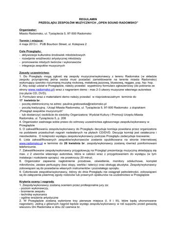 REGULAMIN PRZEGLĄDU ZESPOŁÓW MUZYCZNYCH „OPEN SOUND RADOMSKO” Organizator: Miasto Radomsko, ul. Tysiąclecia 5, 97-500 Radomsko Termin i miejsce: 4 maja 2013 r. PUB Bourbon Street, ul. Kolejowa 2 Cele Przeglądu: - aktywizacja kulturalna środowisk młodzieżowych - rozwijanie wrażliwości artystycznej młodzieży - promowanie młodych twórców i wykonawców - integracja zespołów muzycznych Zasady uczestnictwa: 1. Do Przeglądu mogą zgłosić się zespoły muzyczne/wykonawcy z terenu Radomska (w składzie zespołu przynajmniej jedna osoba musi posiadać zameldowanie na terenie miasta Radomsko) wykonujący szeroko rozumianą muzykę rockową, metalową jazzową, bluesową, reggae, pop, hip- hop. 2. Aby wziąć udział w Przeglądzie, należy przesłać wypełniony formularz zgłoszeniowy (do pobrania ze strony www.radomsko.pl) wraz z nagraniem demo - max 2-3 utwory muzyczne własnego autorstwa (na płycie CD, DVD). 3. Formularz wraz z materiałami demo należy przesłać w nieprzekraczalnym terminie do 17 kwietnia br. - pocztą elektroniczną na adres: [email protected] - pocztą tradycyjną : Urząd Miasta Radomska, ul. Tysiąclecia 5, 97-500 Radomsko z dopiskiem „Przegląd zespołów muzycznych” - lub dostarczyć osobiście do siedziby Organizatora: Wydział Kultury i Promocji Urzędu Miasta Radomska, ul. Tysiąclecia 5, p. 208 4. Organizator zastrzega sobie prawo do odmowy uczestnictwa zgłoszonego zespołu/wykonawcy w Przeglądzie 5. O zakwalifikowaniu zespołu/wykonawcy do Przeglądu decyduje komisja powołana przez organizatora na podstawie przesłuchań nagrań nadesłanych na płytach CD/DVD. Decyzja komisji jest ostateczna i nieodwołalna. O kolejności występu zespołu/wykonawcy podczas Przeglądu zadecyduje losowanie; 6. Lista zakwalifikowanych zespołów/wykonawców zostanie opublikowana na stronie internetowej www.radomsko.pl w terminie do 26 kwietnia br. zespoły/wykonawcy zostaną również poinformowani telefonicznie. 7. Zakwalifikowane zespoły/wykonawcy przygotowują na Przegląd prezentację muzyczną składającą się max. z 2 utworów własnego autorstwa, która w całości wraz z przygotowaniem do występu (w tym instalacja i rozłożenie sprzętu) nie przekroczy 20 minut; 8. Organizator zapewnia nagłośnienie przodowe, oświetlenie, monitory odsłuchowe, komplet mikrofonów, zestaw perkusyjny (bez stopy, werbla i talerzy) oraz obsługę akustyka. Zespoły/wykonawcy zobowiązani są do posiadania własnych instrumentów i pozostałego sprzętu. 9. Członkowie zespołów/wykonawcy, którzy do dnia Przeglądu nie osiągnęli pełnoletności, zobowiązani są do załączenia pisemnej zgody rodziców lub prawnych opiekunów na uczestnictwo w Przeglądzie Kryteria oceny i nagrody 1. Zespoły/wykonawcy zostaną ocenieni przez profesjonalne jury za: - poziom wykonawczy, - brzmienie zespołu - technikę wykonania - ogólne wrażenie artystyczne 2. W Przeglądzie zostaną wyłonione trzy pierwsze miejsca (I, II i III), które będą uhonorowane nagrodami. Jedną z głównych nagród będzie występ zespołu/wykonawcy w roli supportu przed gwiazdą wieczoru Dni Radomska w dniu 22 czerwca br. 3. Oficjalne ogłoszenie wyników Przeglądu nastąpi niezwłocznie po zakończeniu obrad jury. 4. Dodatkowo na specjalnie przygotowanych kuponach, publiczność będzie mogła wybrać swojego laureata. Ustalenia końcowe 1.Organizator nie zwraca nadesłanych przez zespoły materiałów demo 2.Wykonawcy, których zachowanie przed lub w trakcie występu wykazywać będzie stan nietrzeźwości lub odurzenia zostaną wykluczeni z Przeglądu. 3.Wykonawcy zobowiązani są do przestrzegania na scenie i poza nią ogólnie przyjętych zasad dobrych obyczajów oraz unikania wypowiedzi lub gestów mogących wywołać zbiorową dezaprobatę lub niepokój publiczności. Za ewentualne nieodpowiednie zachowanie odpowiadać będą sami Wykonawcy. 4. Każdy z uczestników musi wyrazić zgodę na: − wykorzystanie nadesłanych materiałów muzycznych do celów promocyjnych Przeglądu − zamieszczenie materiałów w całości lub dowolnych jego fragmentów na stronie internetowej Organizatora 5.Zgłoszenie do konkursu jest równoznaczne z akceptacją regulaminu. Organizator zastrzega sobie prawo do dokonania zmian w niniejszym regulaminie 6. Wszelkie kwestie nie ujęte w regulaminie rozstrzyga Organizator ZAPRASZAMY