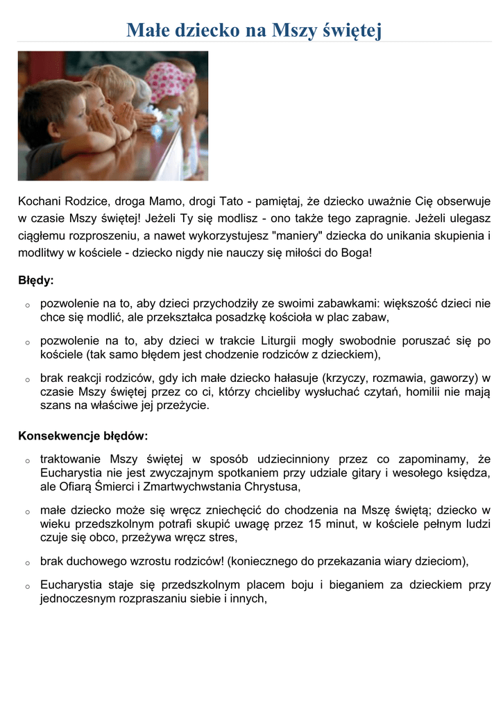 Małe dziecko na Mszy świętej Kochani Rodzice, droga Mamo, drogi Tato - pamiętaj, że dziecko uważnie Cię obserwuje w czasie Mszy świętej! Jeżeli Ty się modlisz - ono także tego zapragnie. Jeżeli ulegasz ciągłemu rozproszeniu, a nawet wykorzystujesz "maniery" dziecka do unikania skupienia i modlitwy w kościele - dziecko nigdy nie nauczy się miłości do Boga! Błędy: o pozwolenie na to, aby dzieci przychodziły ze swoimi zabawkami: większość dzieci nie chce się modlić, ale przekształca posadzkę kościoła w plac zabaw, o pozwolenie na to, aby dzieci w trakcie Liturgii mogły swobodnie poruszać się po kościele (tak samo błędem jest chodzenie rodziców z dzieckiem), o brak reakcji rodziców, gdy ich małe dziecko hałasuje (krzyczy, rozmawia, gaworzy) w czasie Mszy świętej przez co ci, którzy chcieliby wysłuchać czytań, homilii nie mają szans na właściwe jej przeżycie. Konsekwencje błędów: o traktowanie Mszy świętej w sposób udziecinniony przez co zapominamy, że Eucharystia nie jest zwyczajnym spotkaniem przy udziale gitary i wesołego księdza, ale Ofiarą Śmierci i Zmartwychwstania Chrystusa, o małe dziecko może się wręcz zniechęcić do chodzenia na Mszę świętą; dziecko w wieku przedszkolnym potrafi skupić uwagę przez 15 minut, w kościele pełnym ludzi czuje się obco, przeżywa wręcz stres, o brak duchowego wzrostu rodziców! (koniecznego do przekazania wiary dzieciom), o Eucharystia staje się przedszkolnym placem boju i bieganiem za dzieckiem przy jednoczesnym rozpraszaniu siebie i innych, W sprawie Mszy z udziałem dzieci i innych Mszy świętych o ze Mszy świętej z udziałem dzieci niektórzy uczynili "ankietę" na najbardziej wyluzowanego księdza w okolicy, który podczas rozmowy z dziećmi w czasie kazania wyciąga z najmłodszych zabawne historie i anegdoty nigdy nie dotykając spraw ważnych, którymi na co dzień żyją dorośli, o Msza święta "dla dzieci" staje się w wielu miejscach najkrótszą Eucharystią w parafii, bez stawiania wymagań, gdzie wszyscy mile spędzili czas, gdzie "nikt się nie czepiał, że nie udaje się nam żyć Ewangelią w życiu codziennym; nikt nie wspomniał, że wiara nie ma przełożenia w sprawach zawodowych, rodzinnych, wszyscy na nowo dowiedzieli się, że Pan Bóg nas wszystkich kocha i dlatego dzieci powinny słuchać rodziców...". A kiedy rodzice dowiedzą się, że muszą bardziej słuchać Pana Boga? Jak uniknąć błędów? o Ucz dziecko szacunku do miejsca świętego. Pójdź z nim w wolnym czasie do kościoła, aby nie tylko pokazać świątynię, ale i nauczyć pobytu w sakralnej przestrzeni. Jeżeli celem rodziców zachodzących do kościoła będzie modlitwa, a nie muzealna przechadzka - dziecko szybko to zauważy. o Przed pójściem z dzieckiem na Eucharystię warto wcześniej przyprowadzić je do kościoła poza Mszą świętą. Jeżeli potrafi zachować odpowiednie skupienie - jest to sygnał, że można je zabierać na Mszę świętą. . W czasie Mszy świętej dziecko powinno siedzieć między rodzicami. o Jeżeli dziecko w wieku przedszkolnym wymaga tak wielkiego wysiłku w pilnowaniu go na Eucharystii, że rozprasza rodziców lub innych wiernych, zostawcie dziecko pod właściwą opieką w domu lub wymieniajcie się w pilnowaniu dziecka - zachowując przy tym niedzielny obowiązek uczestniczenia w Eucharystii - dziecko ma taki obowiązek dopiero od 7 roku życia. o Zabierajcie czasem dziecko na Mszę świętą dla dorosłych. Wbrew pozorom dzieci lubią tradycyjne pieśni liturgiczne i szybko się ich uczą. Potrafią się też zachwycić atmosferą skupienia "dorosłej" Liturgii. Dodatkowo, gdy brak "nakręcających" ich rówieśników, zachowują się spokojniej. o Bądźcie wrażliwi na potrzeby duchowe dziecka. Niektóre dzieci tak bardzo pragną osobistego spotkania z Chrystusem, że warto posłać je do wczesnej Komunii Świętej. o Szacunek do Eucharystii uczy szacunku do własnych rodziców i dzieci! Autor: Bogna Białecka, tekst artykułu pochodzi z "Maryjna Wspólnota" nr 8/2008 Jak sobie radzić? Rodzice najmłodszych dzieci zadają sobie często pytania: jak poradzić sobie z kręcącym się maluchem, co zrobić, gdy przedszkolaka (lub jeszcze młodszego dziecka) nie mamy z kim zostawić w domu, a chcemy uczestniczyć całą rodziną w niedzielnej Eucharystii. Odpowiedzi na te pytania można szukać tylko wtedy, gdy do problemu sięgniemy głębiej. Najpierw my, dorośli Najpierw powinniśmy my, dorośli, uświadamiać sobie, czym jest Msza Święta. Wiemy wszyscy, że to spotkanie z Bogiem, ofiara i uczta, centrum i najważniejszy moment niedzieli - jej sens. Ale czym dla mnie osobiście ona jest? Spełnieniem obowiązku czy autentycznym wewnętrznym przeżyciem. To osobny temat, który warto rozważać. Jednak w tej perspektywie należy też widzieć miejsce małego dziecka w kościele podczas Eucharystii. Pan Jezus powiedział: Pozwólcie dzieciom przyjść do mnie i jeszcze: Jeśli się nie staniecie jak dzieci, nie wejdziecie do Królestwa Niebieskiego. Nie powiedział jednak: Niech dzieci robią, co chcą, niech wchodzą na ławki, biegają po kościele, bawią się, piją, jedzą ciasteczka, ciągną kapłana za ornat. Pomóżmy rodzicom Wielu rodziców bardzo dobrze radzi sobie ze swym małym dzieckiem w czasie Mszy Świętej: potrafi je wyciszyć, zainteresować, dyskretnie wytłumaczyć, co dzieje się w prezbiterium, w odpowiednim momencie wziąć na ręce (np. gdy dziecko szykuje się do biegu...), wyjść na chwilę, gdy głośno kaprysi. Problem czasami dotyczy zaledwie kilkorga dzieci, których rodzice są bezradni. Co powinniśmy robić? Pomóc tym rodzicom i reagować. Ostatnio na Mszy Świętej jedno z dzieci urządzało sobie wędrówki, "tor przeszkód", zachowywało się głośno. Na prośby rodziców nie reagowało. Gdy dziewczynka zbliżyła się do mojej ławki, z uśmiechem, spokojnie, ale stanowczo powiedziałam: Nie wolno 