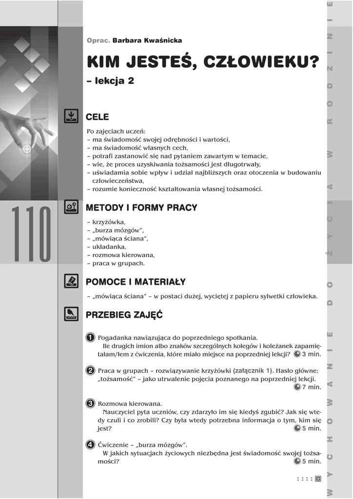 E I N O D – lekcja 2 I KIM JESTEŚ, CZŁOWIEKU? Z Oprac. Barbara Kwaśnicka Ż Y – krzyżówka, – „burza mózgów“, – „mówiąca ściana“, – układanka, – rozmowa kierowana, – praca w grupach. – „mówiąca ściana“ – w postaci dużej, wyciętej z papieru sylwetki człowieka. Praca w grupach – rozwiązywanie krzyżówki (załącznik 1). Hasło główne: & „tożsamość” – jako utrwalenie pojęcia poznanego na poprzedniej lekcji. % 7 min. – „burza mózgów”. ( Ćwiczenie W jakich sytuacjach życiowych niezbędna jest świadomość swojej tożsamości? % 5 min. :::: H Nauczyciel pyta uczniów, czy zdarzyło im się kiedyś zgubić? Jak się wtedy czuli i co zrobili? Czy była wtedy potrzebna informacja o tym, kim się jest? % 5 min. O W ' Rozmowa kierowana. N Ile drugich imion albo znaków szczególnych kolegów i koleżanek zapamiętałam/łem z ćwiczenia, które miało miejsce na poprzedniej lekcji? % 3 min. A $ Pogadanka nawiązująca do poprzedniego spotkania. I E PRZEBIEG ZAJĘĆ C # D O POMOCE I MATERIAŁY Y " A C METODY I FORMY PRACY W 110 ! I Po zajęciach uczeń: – ma świadomość swojej odrębności i wartości, – ma świadomość własnych cech, – potrafi zastanowić się nad pytaniem zawartym w temacie, – wie, że proces uzyskiwania tożsamości jest długotrwały, – uświadamia sobie wpływ i udział najbliższych oraz otoczenia w budowaniu człowieczeństwa, – rozumie konieczność kształtowania własnej tożsamości. W R CELE S C E N A R I U S Z E K I M J E S T E Ś , C Z Ł O W I E K U ? Z A J Ę Ć Praca indywidualna – „mówiąca ściana”. Nauczyciel rozdaje uczniom karteczki samoprzylepne i prosi o zapisanie tych cech, które charakteryzują nas jako ludzi. Proponuje skupienie się tylko na pozytywnej stronie człowieka. ! Uczniowie zapisują u góry karteczki pytanie: „Kim jest człowiek?” " Zapisane (np. w punktach) wypowiedzi przyklejają na wyciętej z papieru sylwetce człowieka. # Nauczyciel umieszcza „mówiącą ścianę” w widocznym miejscu, odczytuje prace uczniów i dokonuje podsumowania. $ 15 min. % Ćwiczenie – „burza mózgów”. ! Uczniowie spontanicznie wypowiadają się na pytanie: „Kto ma najwięk- D L A szy wpływ na to, kim jesteśmy?“ Grupowanie haseł; analiza. " # Podsumowanie. $ 10 min. S Z K O Ł Y 111 P O D S T A W O W E J I S P E C J A L N E J :::: 112