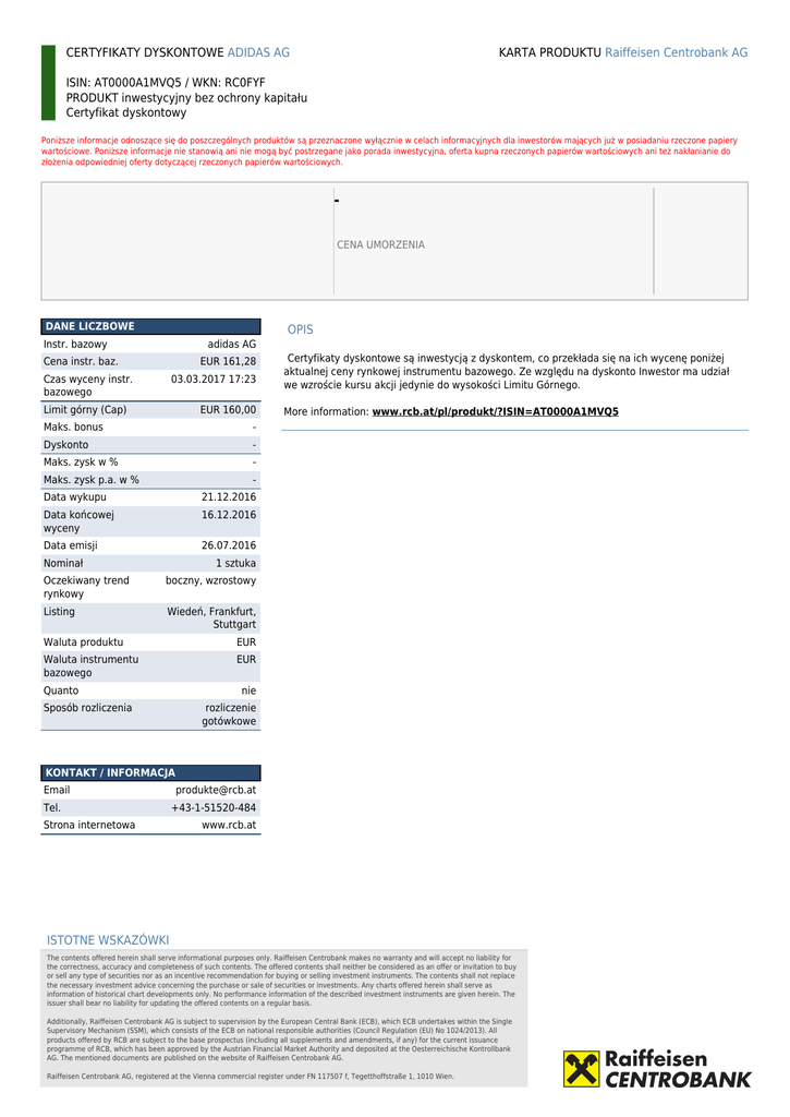KARTA PRODUKTU Raiffeisen Centrobank AG CERTYFIKATY DYSKONTOWE ADIDAS AG ISIN: AT0000A1MVQ5 / WKN: RC0FYF PRODUKT inwestycyjny bez ochrony kapitału Certyfikat dyskontowy Poniższe informacje odnoszące się do poszczególnych produktów są przeznaczone wyłącznie w celach informacyjnych dla inwestorów mających już w posiadaniu rzeczone papiery wartościowe. Poniższe informacje nie stanowią ani nie mogą być postrzegane jako porada inwestycyjna, oferta kupna rzeczonych papierów wartościowych ani też nakłanianie do złożenia odpowiedniej oferty dotyczącej rzeczonych papierów wartościowych. CENA UMORZENIA DANE LICZBOWE OPIS Instr. bazowy adidas AG Cena instr. baz. EUR 161,28 Czas wyceny instr. bazowego 03.03.2017 17:23 Limit górny (Cap) EUR 160,00 Maks. bonus - Dyskonto - Maks. zysk w % - Maks. zysk p.a. w % Certyfikaty dyskontowe są inwestycją z dyskontem, co przekłada się na ich wycenę poniżej aktualnej ceny rynkowej instrumentu bazowego. Ze względu na dyskonto Inwestor ma udział we wzroście kursu akcji jedynie do wysokości Limitu Górnego. More information: www.rcb.at/pl/produkt/?ISIN=AT0000A1MVQ5 - Data wykupu 21.12.2016 Data końcowej wyceny 16.12.2016 Data emisji 26.07.2016 Nominał 1 sztuka Oczekiwany trend rynkowy boczny, wzrostowy Listing Wiedeń, Frankfurt, Stuttgart Waluta produktu EUR Waluta instrumentu bazowego EUR Quanto nie Sposób rozliczenia rozliczenie gotówkowe KONTAKT / INFORMACJA Email Tel. Strona internetowa [email protected] +43-1-51520-484 www.rcb.at ISTOTNE WSKAZÓWKI The contents offered herein shall serve informational purposes only. Raiffeisen Centrobank makes no warranty and will accept no liability for the correctness, accuracy and completeness of such contents. The offered contents shall neither be considered as an offer or invitation to buy or sell any type of securities nor as an incentive recommendation for buying or selling investment instruments. The contents shall not replace the necessary investment advice concerning the purchase or sale of securities or investments. Any charts offered herein shall serve as information of historical chart developments only. No performance information of the described investment instruments are given herein. The issuer shall bear no liability for updating the offered contents on a regular basis. Additionally, Raiffeisen Centrobank AG is subject to supervision by the European Central Bank (ECB), which ECB undertakes within the Single Supervisory Mechanism (SSM), which consists of the ECB on national responsible authorities (Council Regulation (EU) No 1024/2013). All products offered by RCB are subject to the base prospectus (including all supplements and amendments, if any) for the current issuance programme of RCB, which has been approved by the Austrian Financial Market Authority and deposited at the Oesterreichische Kontrollbank AG. The mentioned documents are published on the website of Raiffeisen Centrobank AG. Raiffeisen Centrobank AG, registered at the Vienna commercial register under FN 117507 f, Tegetthoffstraße 1, 1010 Wien. Powered by TCPDF (www.tcpdf.org)