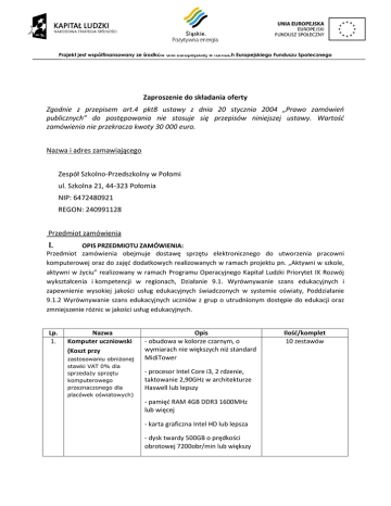 Projekt jest współfinansowany ze środków Unii Europejskiej w ramach Europejskiego Funduszu Społecznego Zaproszenie do składania oferty Zgodnie z przepisem art.4 pkt8 ustawy z dnia 20 stycznia 2004 „Prawo zamówień publicznych” do postępowania nie stosuje się przepisów niniejszej ustawy. Wartość zamówienia nie przekracza kwoty 30 000 euro. Nazwa i adres zamawiającego Zespół Szkolno-Przedszkolny w Połomi ul. Szkolna 21, 44-323 Połomia NIP: 6472480921 REGON: 240991128 Przedmiot zamówienia I. OPIS PRZEDMIOTU ZAMÓWIENIA: Przedmiot zamówienia obejmuje dostawę sprzętu elektronicznego do utworzenia pracowni komputerowej oraz do zajęć dodatkowych realizowanych w ramach projektu pn. „Aktywni w szkole, aktywni w życiu” realizowany w ramach Programu Operacyjnego Kapitał Ludzki Priorytet IX Rozwój wykształcenia i kompetencji w regionach, Działanie 9.1. Wyrównywanie szans edukacyjnych i zapewnienie wysokiej jakości usług edukacyjnych świadczonych w systemie oświaty, Poddziałanie 9.1.2 Wyrównywanie szans edukacyjnych uczniów z grup o utrudnionym dostępie do edukacji oraz zmniejszenie różnic w jakości usług edukacyjnych. Lp. 1. Nazwa Komputer uczniowski (Koszt przy zastosowaniu obniżonej stawki VAT 0% dla sprzedaży sprzętu komputerowego przeznaczonego dla placówek oświatowych) Opis - obudowa w kolorze czarnym, o wymiarach nie większych niż standard MidiTower - procesor Intel Core i3, 2 rdzenie, taktowanie 2,90GHz w architekturze Haswell lub lepszy - pamięć RAM 4GB DDR3 1600MHz lub więcej - karta graficzna Intel HD lub lepsza - dysk twardy 500GB o prędkości obrotowej 7200obr/min lub większy Ilość/komplet 10 zestawów Projekt jest współfinansowany ze środków Unii Europejskiej w ramach Europejskiego Funduszu Społecznego - karta sieciowa Gigabit Ethernet - minimum 2 porty USB, z czego minimum 1x USB 3.0 - wyjście VGA + DVI lub VGA + HDMI - wbudowany czytnik kart pamięci SD - klawiatura + mysz przewodowa USB lub PS/2 - napęd optyczny DVD+- RW z interfejsem SATA - gwarancja producenta na komputer: 30 miesięcy lub dłuższa, realizowana w systemie OnSite (u klienta, najpóźniej 48 godzin po zgłoszeniu usterki) - monitor LCD z podświetleniem LED, minimum 18,5”, rozdzielczość minimum HD (1366x768), złącze VGA - gwarancja producenta na monitor: minimum 36 miesięcy 2. 3. Oprogramowanie Serwer nauczycielski (Koszt przy zastosowaniu obniżonej stawki VAT (0%) dla sprzedaży sprzętu komputerowego przeznaczonego dla placówek oświatowych) - system operacyjny Windows 7 Professional PL 64bit. Jeżeli dostarczony będzie system Windows 8 PRO, wymagane jest przeprowadzenie downgrade do wersji 7. - obudowa w kolorze czarnym, o wymiarach nie większych niż standard MidiTower - procesor Intel Core i3, 2 rdzenie, taktowanie 2,90GHz w architekturze Haswell lub lepszy - pamięć RAM 8GB DDR3 1600MHz lub więcej - karta graficzna Intel HD lub lepsza - dysk twardy 500GB o prędkości obrotowej 7200obr/min lub większy 10 sztuk 1 zestaw Projekt jest współfinansowany ze środków Unii Europejskiej w ramach Europejskiego Funduszu Społecznego - karta sieciowa Gigabit Ethernet - wbudowany w obudowę czytnik kart SD - minimum 2 porty USB, z czego minimum 1x USB 3.0 - wyjście VGA + DVI lub VGA + HDMI - klawiatura + mysz przewodowa USB lub PS/2 - napęd optyczny DVD+- RW z interfejsem SATA - gwarancja producenta na komputer: 30 miesięcy lub dłuższa, realizowana w systemie OnSite (u klienta, najpóźniej 48 godzin po zgłoszeniu usterki) - monitor LCD z podświetleniem LED, minimum 21,5”, rozdzielczość minimum Full HD (1920x1080), złącze VGA - gwarancja producenta na monitor: minimum 36 miesięcy 4. 5. Oprogramowanie - system operacyjny Windows 7 Professional PL 64bit. Jeżeli dostarczony będzie system Windows 8 PRO, wymagane jest przeprowadzenie downgrade do wersji 7. Drukarka laserowa (koszt nie może być równy lub wyższy niż 350 zł brutto za sztukę, koszt przy zastosowaniu - technologia druku: laser, bez funkcji kolor (czarno-biala) obniżonej stawki VAT 0% dla sprzedaży sprzętu komputerowego przeznaczonego dla - złącze USB placówek oświatowych) - wbudowany skaner z funkcją ksero bez potrzeby włączania komputera - minimalna rozdzielczość skanowania: 1200x1200dpi - minimalna rozdzielczość druku: 1200x1200dpi 1 szt. 2 szt. Projekt jest współfinansowany ze środków Unii Europejskiej w ramach Europejskiego Funduszu Społecznego - format papieru: A4 - minimalna pojemność pojemnika na papier: 150 arkuszy - minimalna pojemność odbiornika na papier: 100 arkuszy - minimalne miesięczne obciążenie deklarowane przez producenta urządzenia: 10000 stron/miesiąc 6. Drukarka do drukowania zdjęć (koszt nie może być równy lub wyższy niż 350 zł za sztukę brutto, koszt przy zastosowaniu obniżonej stawki VAT 0% dla sprzedaży sprzętu komputerowego przeznaczonego dla placówek oświatowych) . - rozdzielczość max.9600x2400 dpi, 1 szt. - technologia oddzielnych zbiorników z atramentem, - drukowanie dwustronne dla formatów A4, B5, A5 i Letter, - drukowanie bezpośrednie z aparatów zgodnych ze standardem PictBridge, - szybkość druku: mono ok. 11obr./min, kolor ok.9obr./min 7. Oprogramowanie antywirusowe – licencja na 11 stanowisk - oprogramowanie zgodne z Windows 7 x64 1szt - produkt w wersji BOX (wymagany nośnik instalacyjny, drukowana instrukcja oraz drukowana licencja) - produkt musi oferować narzędzie umożliwiające zarządzanie wszystkimi licencjami z jednego miejsca 8. Oprogramowanie biurowe – licencja – - kompatybilne z Windows 7 x64 - natywna obsługa formatów DOC, DOCX, ODF, XLS - dożywotnia licencja nieograniczona czasowo - produkt w języku polskim 11 szt Projekt jest współfinansowany ze środków Unii Europejskiej w ramach Europejskiego Funduszu Społecznego - pakiet musi zawierać edytor tekstu, arkusz kalkulacyjny, oprogramowanie do tworzenia prezentacji multimedialnych oraz klienta poc