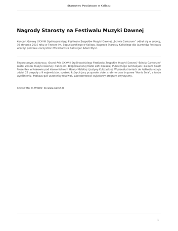 Starostwo Powiatowe w Kaliszu Nagrody Starosty na Festiwalu Muzyki Dawnej Koncert Galowy XXXVIII Ogólnopolskiego Festiwalu Zespołów Muzyki Dawnej „Schola Cantorum” odbył się w sobotę, 30 stycznia 2016 roku w Teatrze im. Bogusławskiego w Kaliszu. Nagrodę Starosty Kaliskiego dla laureatów festiwalu wręczył podczas uroczystości Wicestarosta Kaliski Jan Adam Kłysz. Tegorocznym zdobywcą Grand Prix XXXVIII Ogólnopolskiego Festiwalu Zespołów Muzyki Dawnej "Schola Cantorum" został Zespół Muzyki Dawnej i Tańca im. Błogosławionej Matki Zofii Czeskiej Publicznego Gimnazjum i Liceum Sióstr Prezentek w Krakowie pod kierownictwem Hanny Malskiej i Justyny Kulczyckiej. W przesłuchaniach do festiwalu wzięły udział 22 zespoły z 9 województw, spośród których jury przyznało złote, srebrne oraz brązowe "Harfy Eola", a także wyróżnienia. Podczas gali uczestnicy festiwalu zaprezentowali wyjątkowy program artystyczny. Tekst/Foto: M.Wolarz za www.kalisz.pl 1