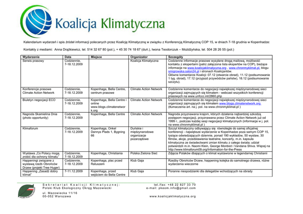 Kalendarium wydarzeń i spis źródeł informacji polecanych przez Koalicję Klimatyczną w związku z Konferencją Klimatyczną COP 15, w dniach 7-18 grudnia w Kopenhadze: Kontakty z mediami: Anna Drążkiewicz, tel. 514 32 67 80 (pol.), + 45 30 74 18 67 (duń.), Iwona Teodorczuk – Możdżyńska, tel. 504 28 26 55 (pol.) Wydarzenie Serwis prasowy Data Codziennie, 7-18.12.2009 Miejsce Organizator Koalicja Klimatyczna Szczegóły Codzienne informacje prasowe wysyłane drogą mailową, możliwość kontaktu z ekspertami (patrz załączona lista ekspertów na COP), bieżące informacje na www.koalicjaklimatyczna.org , www.chronmyklimat.pl, blogu smigrowska.salon24.pl i stronach Koalicjantów. Główne komentarze Koalicji: 07.12 (otwarcie obrad), 11.12 (podsumowanie 1 tyg. obrad), 17.12 (przyjazd przywódców państw), 18.12 (podsumowanie szczytu). Konferencje prasowe Climate Action Network Codziennie, 7-18.12.2009 Kopenhaga, Bella Centre, centrum prasowe Climate Action Network Biuletyn negocjacji ECO Codziennie, 7-18.12.2009 Climate Action Network Nagroda Skamielina Dnia (photo opportunity) Codziennie, 7-18.12.2009 Kopenhaga, Bella Centre i online www.blogs.climatenetwor k.org Kopenhaga, Bella Centre Codzienne komentarze do negocjacji największej międzynarodowej sieci organizacji zajmujących się klimatem - webcast wszystkich konferencji prasowych na www.unfccc.int/2860.php Codzienne komentarze do negocjacji największej międzynarodowej sieci organizacji zajmujących się klimatem www.blogs.climatenetwork.org (tłumaczenia art. na j. pol. na www.chronmyklimat.pl ) Klimaforum Codziennie, 7-18.12.2009 Kopenhaga, Onkel Dannys Plads 1, Bygning 66 Duńskie i międzynarodowe organizacje pozarządowe Wystawa „Co Polacy mogą zrobić dla ochrony klimatu” Happeningi związane z wystawą rzeźb Obrońców Drzew (projekt Tree Huger) Happening „Zasadź dobry klimat” Codziennie, 7-18.12.2009 Codziennie, 7-18.12.2009 Kopenhaga, Christiania Polska Zielona Sieć Kopenhaga, plac przed Ratuszem Klub Gaja Rzeźby Obrońców Drzew, happening kolejka do samotnego drzewa, różne wydarzenia wieczorne 7-11.12.2009 Kopenhaga, przed wejściem do Bella Centre Klub Gaja Poranne niespodzianki dla delegatów wchodzących na obrady Climate Action Network Nagroda przyznawana krajom, których działania najbardziej szkodzą postępom negocjacji, przyznawana przez Climate Action Network już od 1999 r., podczas każdej sesji negocjacji klimatycznych (informacje w j. pol. na www.chronmyklimat.pl ) Szczyt klimatyczny odbywający się równolegle do samej oficjalnej konferencji - największe wydarzenie w Kopenhadze poza samym COP 15, tysiące odwiedzających dziennie, ponad 190 wykładów, 50 wystaw, 30 filmów, akcje, przedstawienia teatralne, koncerty, m.in. kapsuła klimatyczna ze świadectwami zmian klimatu z całego świata; udział potwierdzili m.in. Naomi Klein, George Monbiot i Vandana Shiva. Więcej na http://www.klimaforum09.org/Information-for-the-Press Zdjęcia Polaków dbających o klimat wystawione w legendarnej Christianii _______________________________________________________________________________________________________________ Sekretariat Koalicji Klimatycznej: tel./fax: +48 22 827 33 70 Polski Klub Ekologiczny Okręg Mazowiecki e-mail: [email protected] ul. Mazowiecka 11/16 00-052 W arszawa www.koalicjaklimatyczna.org Konferencja prasowa „O lepszy klimat dla Polski. Dalsza redukcja emisji szansą dla innowacyjności i modernizacji gospodarki” Photo opportunity dot. „Rozgniewanej syrenki” Konferencja prasowa nt. „Raportu 40%” 08.12.2009, 11.00 Warszawa, Centrum Prasowe Foksal Greenpeace w imieniu Koalicji Klimatycznej Konferencja nt. rzeczywistego potencjału redukcji emisji w Polsce. 08.12.2009 Kopenhaga, Przed wejściem do Bella Centre Kopenhaga, Bella Centre Friends of the Earth Akcja w związku z przyznaniem Nagrody Rozgniewanej Syrenki (15.12) Prezentacja raportu nt. ograniczenia emisji w Unii Europejskiej o co najmniej 40% do roku 2020 Akcja “Powódź dla Sprawiedliwości Klimatycznej” w ramach Światowego Dnia Akcji dla Klimatu Marsz dla Klimatu w ramach Światowego Dnia Akcji dla Klimatu 12.12.2009, 10.00 – 12.00 Friends of the Earth, Stokholm Environment Institute Friends of the Earth International Kościelne dzwony dla sprawiedliwości klimatycznej 13.12.2009 Kopenhaga, Kościoły duńskie, w tym katedra kopenhaska Światowa Rada Kościołów, organizacją 350.org Nagroda Rozgniewanej Syrenki (Angry Mermaid Award) 15.12.2009, 16.00 Kopenhaga, Onkel Dannys Plads 1, Bygning 66 (Klimaforum) Friends of the Earth International, Corporate Europe Observatory, Spin Watch, Focus on the Global South i Attac Denmark 09.12.2009 12.12.2009, od 12.00 Kopenhaga, z Halmtorvet (blisko budynku Klimaforum) do Placu Parlamentu (Christiansborg) Kopenhaga, z Placu Parlamentu (Christiansborg) do Bella Centre Duński Ruch Klimatyczny Cztery tysiące ubranych na niebiesko osób z całego świata „zaleje” ulice centrum Kopenhagi, aby domagać się sprawiedliwości klimatycznej. Demonstracja zakończy się krótkim przedstawieniem ulicznego teatru na Placu Parlamentu (Christiansborg). Więcej na http://copenhagenflood.org/en Najważniejsze wydarzenie Światowego Dnia Akcji dla Klimatu, ulicami miasta przejdą członkowie organizacji walczących o ochronę klimatu, zachęcając światowych przywódców do działania. Wsparcie Marszu ogłosiło już ponad 350 organizacji i koalicji z 54 państw. Więcej informacji na: www.12dec09.dk O godzinie 15 dzwon kopenhaskiej katedry zabije 350 razy, nawiązując do uznanego przez naukowców za bezpieczny poziomu ustabilizowania koncentracji CO2 w atmosferze, czyli 350 ppm. Więcej informacji: www.oikoumene.org Nagroda dla korporacji, której działania lobbingowe najbardziej szkodziły zawarciu w Kopenhadze sprawiedliwego porozumienia (więcej na www.youtube.com/watch?v=7df0w56AbNg, głosowanie http://www.angrymermaid.org/) ________________________