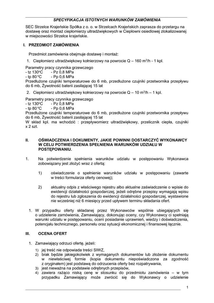 ___________________________________________________________________________ SPECYFIKACJA ISTOTNYCH WARUNKÓW ZAMÓWIENIA SEC Strzelce Krajeńskie Spółka z o. o. w Strzelcach Krajeńskich zaprasza do przetargu na dostawę oraz montaż ciepłomierzy ultradźwiękowych w Ciepłowni osiedlowej zlokalizowanej w miejscowości Strzelce krajeńskie. I. PRZEDMIOT ZAMÓWIENIA Przedmiot zamówienia obejmuje dostawę i montaż: 1. Ciepłomierz ultradźwiękowy kołnierzowy na powrocie Q – 160 m3/h - 1 kpl. Parametry pracy czynnika grzewczego - tz 130oC - Pz 0,8 MPa - tp 80 oC - Pp 0,6 MPa Przedłużone czujniki temperaturowe do 6 mb, przedłużone czujniki przetwornika przepływu do 6 mb, Żywotność baterii zasilającej 15 lat 2. Ciepłomierz ultradźwiękowy kołnierzowy na powrocie Q – 10 m3/h – 1 kpl. Parametry pracy czynnika grzewczego - tz 130oC - Pz 0,8 MPa - tp 80 oC - Pp 0,6 MPa Przedłużone czujniki temperaturowe do 6 mb, przedłużone czujniki przetwornika przepływu do 6 mb, Żywotność baterii zasilającej 15 lat W skład kpl. ma wchodzić : przepływomierz ultradźwiękowy, przelicznik ciepła, czujniki x 2 szt. II. OŚWIADCZENIA I DOKUMENTY, JAKIE POWINNI DOSTARCZYĆ WYKONAWCY W CELU POTWIERDZENIA SPEŁNIENIA WARUNKÓW UDZIAŁU W POSTĘPOWANIU. 1. Na potwierdzenie spełnienia warunków udziału w postępowaniu Wykonawca zobowiązany jest złożyć wraz z ofertą: 1) oświadczenie o spełnienie warunków udziału w postępowaniu (zawarte w treści formularza oferty cenowej); 2) aktualny odpis z właściwego rejestru albo aktualne zaświadczenie o wpisie do ewidencji działalności gospodarczej, jeżeli odrębne przepisy wymagają wpisu do rejestru lub zgłoszenia do ewidencji działalności gospodarczej, wystawione nie wcześniej niż 6 miesięcy przed upływem terminu składania ofert. 1. W przypadku oferty składanej przez Wykonawców wspólnie ubiegających się o udzielenie zamówienia, Zamawiający, dokonując oceny, czy Wykonawcy ci spełniają warunki udziału w postępowaniu, oceni posiadanie uprawnień, wiedzy i doświadczenia, potencjału technicznego, personelu oraz sytuacji ekonomicznej i finansowej łącznie. III. OCENA OFERT 1. Zamawiający odrzuci ofertę, jeżeli: 1) jej treść nie odpowiada treści SIWZ, 2) brak będzie jakiegokolwiek z wymaganych dokumentów lub złożenie dokumentu w niewłaściwej formie (kopia dokumentu niepoświadczona za zgodność z oryginałem) jest podstawą do odrzucenia oferty bez rozpatrywania, 3) jest nieważna na podstawie odrębnych przepisów, 4) zawiera rażąco niską cenę w stosunku do przedmiotu zamówienia – w tym przypadku Zamawiający może zwrócić się do Wykonawcy o udzielenie ________________________________________________________________________ 1 ___________________________________________________________________________ w określonym terminie stosownych wyjaśnień odnośnie podanej ceny. Brak w/w wyjaśnień w stosownym terminie spowoduje odrzucenie oferty. 2. Ocenie w ramach kryteriów oceny ofert będą podlegać wyłącznie oferty niepodlegające odrzuceniu. IV. TERMINY REALIZACJI PRZEDMIOTU ZAMÓWIENIA Przewidywany termin realizacji przedmiotu zamówienia: 1. Dostawa ciepłomierzy do 30.09.2016 r. 2. Montaż ciepłomierzy do 30.09.2016 r. V. ZASADY OBOWIĄZUJĄCE PRZY PRZYGOTOWANIU OFERT 1. Wykonawca ma prawo złożyć tylko jedną ofertę. 2. Oferta powinna być zgodna z wymogami określonymi w niniejszej specyfikacji. 3. Cena ofertowa winna być podana zgodnie ze wzorem formularza ofertowego stanowiącego załącznik nr 1 do SIWZ. Należy podać cenę netto oraz deklarowany termin rękojmi. 4. Formularz ofertowy musi być podpisany przez osoby upoważnione do reprezentowania oferenta w obrocie prawnym. 5. Zamawiający udzieli wyjaśnień treści specyfikacji Wykonawcom, którzy pobrali SIWZ, jeżeli zapytanie wpłynie do Zamawiającego na nie mniej niż 7 dni roboczych przed terminem składania ofert. 6. Oferty otrzymane przez Zamawiającego po terminie zostaną zwrócone Wykonawcom nie otwarte. Decydujące znaczenie dla oceny zachowania powyższego terminu ma data i godzina wpływu oferty do siedziby Zamawiającego. VI. SPOSÓB, MIEJSCE I TERMIN SKŁADANIA OFERT 1. Wykonawca winien zamieścić ofertę w zamkniętej, zabezpieczonej kopercie. 2. Koperta powinna być zaadresowana i opisana w sposób następujący: Ciepłomierz ultradźwiękowy kołnierzowy na powrocie Q – 160 m3/h - 1 kpl. Ciepłomierz ultradźwiękowy kołnierzowy na powrocie Q – 10 m3/h – 1 kpl. Nie otwierać przed godz. 1215, dnia 06.06.2015 roku i złożona do dnia 06.06.2016 r. do godz.1200 w SEC Strzelce Krajeńskie Sp. z o. o. ul. Wyzwolenia 18, w sekretariacie spółki. 3. Komisyjne otwarcie ofert nastąpi tego samego dnia o godz.1215 w siedzibie spółki przy ul. Wyzwolenia 18 w Strzelcach Krajeńskich. 4. Zamawiający zastrzega, że w trakcie wyboru ofert może zażądać dostarczenia dodatkowych dokumentów, a Wykonawca obowiązany jest dostarczyć je w trybie pilnym. ________________________________________________________________________ 2 ___________________________________________________________________________ Oferta winna zawierać: - ofertę cenową sporządzoną na formularzu stanowiącym załącznik nr 1 do specyfikacji, VII. POSTĘPOWANIE O PRZYZNANIE ZAMÓWIENIA 1. Postępowanie zostanie przeprowadzone przez Komisję przetargową SEC Strzelce Krajeńskie Sp. z o. o. 2. Postępowanie toczyć się będzie z podziałem na część jawną i niejawną. Oferenci mogą uczestniczyć w części jawnej. 3. Zamawiający może żądać udzielenia przez Wykonawców wyjaśnień dotyczących treści złożonych ofert oraz dokonać poprawek oczywistych omyłek w treści oferty niezwłocznie zawiadamiając o tym Wykonawcę. 4. Zamawiający powiadomi o wyniku przetargu telefonicznie lub elektronicznie mailem. 5. W postępowaniu o przyznanie zamówienia stosuje się przepisy Kodeksu Cywilnego. 6. Wykonawcy będą związani 