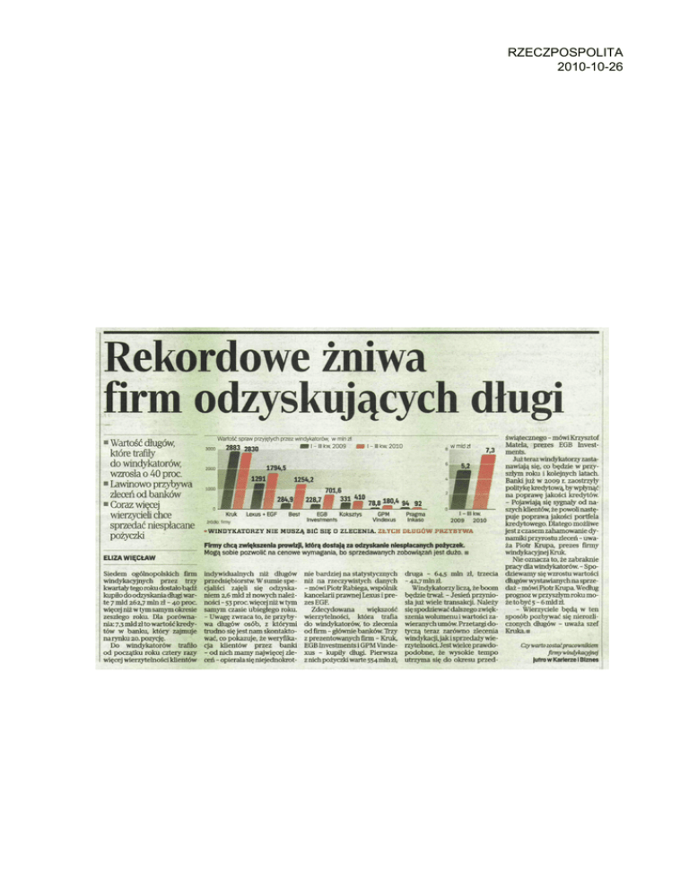 RZECZPOSPOLITA 2010-10-26 Rekordowe żniwa firm odzyskujących długi • Wartość długów, które trafiły do windykatorów, wzrosła o 40 proc. • Lawinowo przybywa zleceń od banków • Coraz więcej wierzycieli chce sprzedać niespłacane pożyczki ELIZA WIĘCŁAW Siedem ogólnopolskich firm windykacyjnych przez trzy kwartały tego roku dostało bądź kupiło do odzyskania długi war te 7 mld 262,7 rnln zł - 40 proc. więcej niż w tym samym okresie zeszłego roku. Dla porówna nia: 7,3 mld zl to wartość kredy tów w banku, który zajmuje na rynku 20. pozycję. Do windykatorów trafiło od początku roku cztery razy więcej wierzytelności klientów 3000 Wartość spraw przyjętych przez windykatorów, w mln zt 2883 2830 • I - III kw. 2009 I W J Kruk wmldzt I - III kw. 2010 1291 am • Lexus + EGF L 5,2 179*1,5 1254,2 284,9 Best źródto: firmy 228,7 331 " 0 EGB Koksztys Investments GPM Vindexus Pragma Inkaso I - III kw. 2009 2010 WINDYKATORZY NIE M U S Z Ą BIĆ SIĘ O ZLECENIA. ZŁYCH DŁUGÓW PRZYBYWA Firmy chcą zwiększenia prowizji, którą dostają za odzyskanie niespłacanych pożyczek. Mogą sobie pozwolić na cenowe wymagania, bo sprzedawanych zobowiązań jest dużo. • indywidualnych niż długów przedsiębiorstw. W sumie spe cjaliści zajęli się odzyska niem 2,6 mld zł nowych należ ności -53 proc. więcej niż w tym samym czasie ubiegłego roku. - Uwagę zwraca to, że przyby wa długów osób, z którymi trudno się jest nam skontakto wać, co pokazuje, że weryfika cja klientów przez banki - od nich mamy najwięcej zle ceń - opierała się niejednokrot nie bardziej na statystycznych niż na rzeczywistych danych - mówi Piotr Rabiega, wspólnik kancelarii prawnej Lexus i pre zes EGF. Zdecydowana większość wierzytelności, która trafia do windykatorów, to zlecenia od firm - głównie banków. Trzy z prezentowanych firm - Kruk, EGB Investments i GPM Vindexus - kupiły długi. Pierwsza z nich pożyczki warte 554 mln zł, druga - 64,5 mln zł, trzecia -42,7 mln zł. Windykatorzy liczą, że boom będzie trwaŁ - Jesień przynio sła już wiele transakcji. Należy się spodziewać dalszego zwięk szenia wolumenu i wartości za wieranych umów. Przetargi do tyczą teraz zarówno zlecenia windykacji, jak i sprzedaży wie rzytelności Jest wielce prawdo podobne, że wysokie tempo utrzyma się do okresu przed świątecznego - mówi Krzysztof Matela, prezes EGB Invest ments. Już teraz windykatorzy zasta nawiają się, co będzie w przy szłym roku i kolejnych latach. Banki już w 2009 r. zaostrzyły politykę kredytową, by wpłynąć na poprawę jakości kredytów. - Pojawiają się sygnały od na szych klientów, że powoli nastę puje poprawa jakości portfela kredytowego. Dlatego możliwe jest z czasem zahamowanie dy namiki przyrostu zleceń - uwa ża Piotr Krup,], prezes firmy windykacyjnej Kruk. Nie oznacza to, że zabraknie pracy dla windykatorów. - Spo dziewamy się wzrostu wartości długów wystawianych na sprze daż - mówi Piotr Krupa. Według prognoz w przyszłym roku mo że to być 5 - 6 mld zł. - Wierzyciele będą w ten sposób pozbywać się nierozli czonych długów - uważa szef Kruka. • Czy warto zostać pracownikiem firmy windykacyjnej jutro w Karierze I Biznes