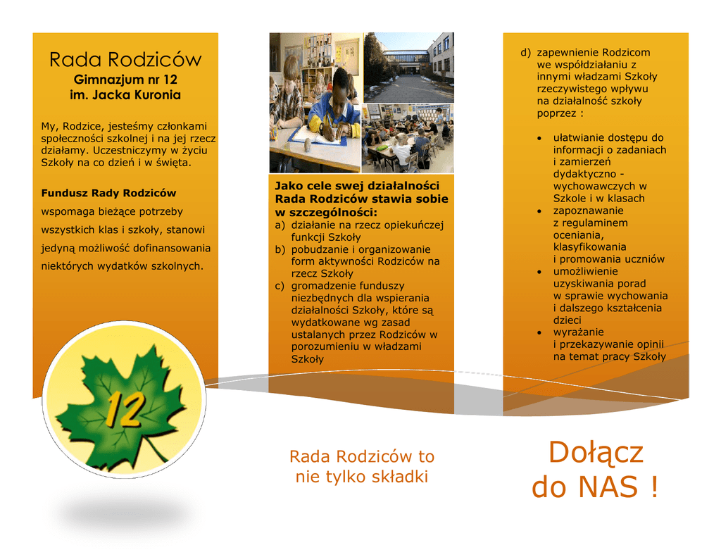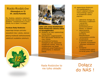 d) zapewnienie Rodzicom we współdziałaniu z innymi władzami Szkoły rzeczywistego wpływu na działalność szkoły poprzez : Rada Rodziców Gimnazjum nr 12 im. Jacka Kuronia My, Rodzice, jesteśmy członkami społeczności szkolnej i na jej rzecz działamy. Uczestniczymy w życiu Szkoły na co dzień i w święta. Fundusz Rady Rodziców wspomaga bieżące potrzeby wszystkich klas i szkoły, stanowi jedyną możliwość dofinansowania niektórych wydatków szkolnych. Jako cele swej działalności Rada Rodziców stawia sobie w szczególności: a) działanie na rzecz opiekuńczej funkcji Szkoły b) pobudzanie i organizowanie form aktywności Rodziców na rzecz Szkoły c) gromadzenie funduszy niezbędnych dla wspierania działalności Szkoły, które są wydatkowane wg zasad ustalanych przez Rodziców w porozumieniu w władzami Szkoły Rada Rodziców to nie tylko składki ułatwianie dostępu do informacji o zadaniach i zamierzeń dydaktyczno wychowawczych w Szkole i w klasach zapoznawanie z regulaminem oceniania, klasyfikowania i promowania uczniów umożliwienie uzyskiwania porad w sprawie wychowania i dalszego kształcenia dzieci wyrażanie i przekazywanie opinii na temat pracy Szkoły Dołącz do NAS ! Twoja Pomoc Też jest Potrzebna ! Zajęcia lekcyjne, zajęcia pozalekcyjne, kółka zainteresowań, praca na rzecz osób potrzebujących (weekendy) – to często zajęcia trwające więcej niż 10 godzin dziennie. Pomóż poprzez współdziałanie w Radzie Rodziców stworzyć lepsze warunki dla naszych dzieci, bo kto jak nie Rodzice wiedzą co jest najlepsze dla naszych pociech. W bieżącym roku szkolnym Rodzice, poprzez działalność Rady Rodziców sfinansowali m.in.: 1. 2. 3. 4. 5. 6. 7. 8. przedstawienie szkolne o szkodliwości dopalaczy; choinkę szkolną z ozdobami; loterię mikołajkową z cennymi nagrodami takimi jak odtwarzacz MP4, MP3, gry, słodycze; częściowe koszty organizacji dyskotek szkolnych; słodycze "na Mikołaja" dla wszystkich uczniów; nagrody dla zwycięzców comiesięcznej edycji konkursu “Liga Klas”; magnesy do tablic dla wszystkich klas; wpisowe na zawody dla szkolnej drużyny koszykarek; 9. 10. 11. 12. 13. 14. 15. zakup książek (lektur) do biblioteki szkolnej oraz prenumeratę czasopisma popularnonaukowego; zakup antyram dla stałej szkolnej ekspozycji plakatów filmowych ; lizaki na walentynki; konkursy z nagrodami na dyskotece szkolnej; nagrody dla wszystkich I klas na otrzęsiny; środki pomocy dla uczniów w indywidualnych przypadkach losowych; część kosztów wycieczek klasowych.