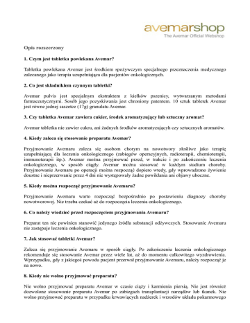 Opis rozszerzony 1. Czym jest tabletka powlekana Avemar? Tabletka powlekana Avemar jest środkiem spożywczym specjalnego przeznaczenia medycznego zalecanego jako terapia uzupełniająca dla pacjentów onkologicznych. 2. Co jest składnikiem czynnym tabletki? Avemar pulvis jest specjalnym ekstraktem z kiełków pszenicy, wytwarzanym metodami farmaceutycznymi. Sosób jego pozyskiwania jest chroniony patentem. 10 sztuk tabletek Avemar jest równe jednej saszetce (17g) granulatu Avemar. 3. Czy tabletka Avemar zawiera cukier, środek aromatyzujący lub sztuczny aromat? Avemar tabletka nie zawier cukru, ani żadnych środków aromatyzującyh czy sztucznych aromatów. 4. Kiedy zaleca się stosowanie preparatu Avemar? Przyjmowanie Avemaru zaleca się osobom chorym na nowotwory złośliwe jako terapię uzupełniającą dla leczenia onkologicznego (zabiegów operacyjnych, radioterapii, chemioterapii, immunoterapii itp.). Avemar można przyjmować przed, w trakcie i po zakończeniu leczenia onkologicznego, w sposób ciągły. Avemar można stosować w każdym stadium choroby. Przyjmowanie Avemaru po operacji można rozpocząć dopiero wtedy, gdy wprowadzono żywienie doustne i nieprzerwanie przez 4 dni nie występowały żadne powikłania ani objawy uboczne. 5. Kiedy można rozpocząć przyjmowanie Avemaru? Przyjmowanie Avemaru warto rozpocząć bezpośrednio po postawieniu diagnozy choroby nowotworowej. Nie trzeba czekać aż do rozpoczęcia leczenia onkologicznego. 6. Co należy wiedzieć przed rozpoczęciem przyjmowania Avemaru? Preparat ten nie powinien stanowić jedynego źródła substancji odżywczych. Stosowanie Avemaru nie zastępuje leczenia onkologicznego. 7. Jak stosować tabletki Avemar? Zaleca się przyjmowanie Avemaru w sposób ciągły. Po zakończeniu leczenia onkologicznego rekomenduje się stosowanie Avemar przez wiele lat, aż do momentu całkowitego wyzdrowienia. Wprzypadku, gdy z jakiegoś powodu pacjent przerwał przyjmowanie Avemaru, należy rozpocząć je na nowo. 8. Kiedy nie wolno przyjmować preparatu? Nie wolno przyjmować preparatu Avemar w czasie ciąży i karmienia piersią. Nie jest również dozwolone stosowanie preparatu Avemar po zabiegach transplantacji narządów lub tkanek. Nie wolno przyjmować preparatu w przypadku krwawiących nadżerek i wrzodów układu pokarmowego (żołądka i opuszki dwunastnicy), niespecyficznych zapaleń jelit (colitis ulcerosa) oraz zespołu złego wchłaniania. Nie zaleca się jego stosowania w przypadku nietolerancji fruktozy, alergii na białka pszenicy i/lub nadwrażliwości na którykolwiek ze składników preparatu. 9. Kiedy należy robić czasową przerwę w stosowaniu tabletek Avemar? W przypadku konieczności wykonania badań kontrastowych przewodu pokarmowego (na przykład badania diagnostyczne rtg żołądka i jelit z wykorzystaniem siarczanu baru), zaleca się przerwanie stosowania preparatu Avemar dwa dni przed badaniem i kontynuowanie jego przyjmowania dopiero następnego dnia po badaniu. W każdym przypadku należy ściśle przestrzegać zaleceń lekarskich. Jeśli jakiekolwiek badania oraz zabiegi są wykonywane na czczo, nie należy przyjmować preparatu Avemar. 10. Czy dzieci mogą przyjmować Avemar? Preparat przeznaczony jest dla dorosłych i dzieci powyżej 14 roku życia. 11. Jakie mogą wystąpić działania niepożądane w trakcie stosowania preparatu Avemar? W trakcie stosowania Avemaru bardzo rzadko obserwowano występowanie jakichkolwiek objawów ubocznych. Mogą jednak wystąpić luźne stolce (biegunka), nudności, wymioty. 12. Czy można przyjmować Avemar jednocześnie z innymi lekami lub preparatami? Avemar może być przyjmowany z innymi lekami, nie należy jednak przyjmować różnych preparatów jednoczasowo. Zaleca się zachowanie 2-godzinnego odstępu pomiędzy przyjmowaniem preparatu Avemar a zażywaniem leków, zawierających Witaminę C. 13. Jaka jest zalecana dzienna dawka i kiedy należy ją przyjmować? Zaleca się przyjmowanie tabletek powlekanych Avemar w następujących dawkach: poniżej 50 kg masy ciała - 2 x 4 tabletki na dobę, 50-90 kg masy ciała - 2 x 5 tabletek na dobę, powyżej 90 kg masy ciała - 2 x 7 tabletek na dobę. Zaleca się zażywać połowę dziennej dawki rano, a drugą połowę wieczorem. 14. Jak przechowywać i przewozić Avemar? Chronić przed ciepłem/nagrzaniem i przechowywać w temperaturze pokojowej (poniżej 22°C). W przypadku temperatury w pomieszczeniu powyżej 22 °C preparat należy przechowywać w lodówce. Chronić przed dziećmi! Należy uważać, żeby podczas przewozu preparat nie został wystawiony przez dłuższy okres na działanie podwyższonej temperatury (ciepła)! 15. Czy granulat Avemar i tabletki powlekane Avemar są produkowane przez tego samego producenta? Tak. Obydwa produkty są wytwarzane przez spółkę. Biropharma z.o.o. Składnik czynny tzw. Avemar pulvis jest uzyskiwany identycznymi metodami, z użyciem identycznych składników.