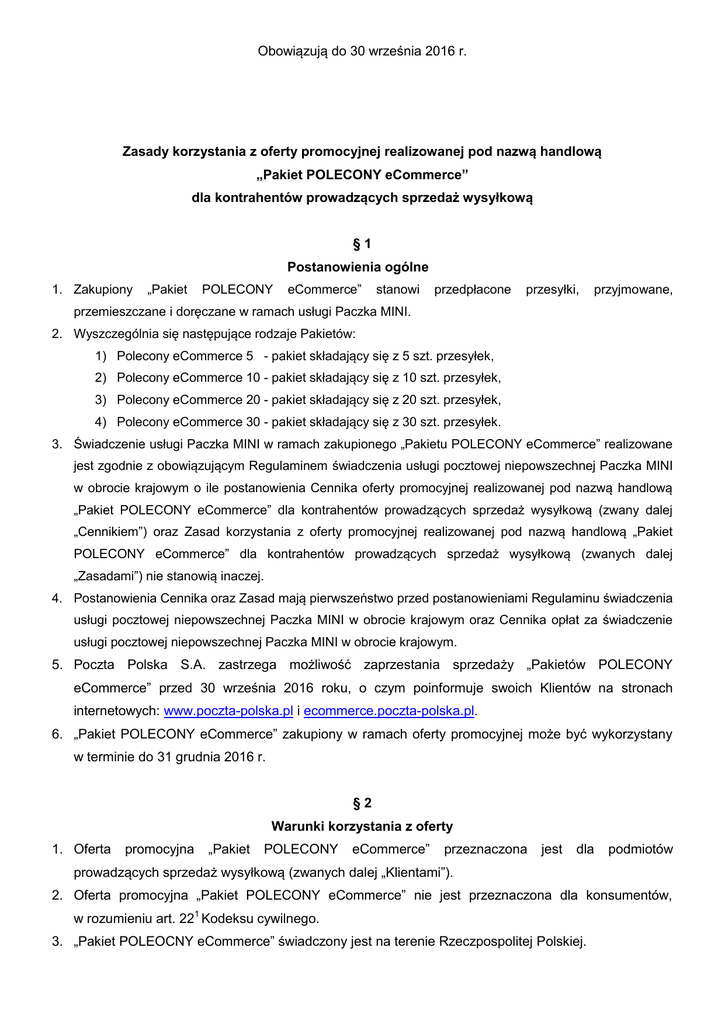 Obowiązują do 30 września 2016 r. Zasady korzystania z oferty promocyjnej realizowanej pod nazwą handlową „Pakiet POLECONY eCommerce” dla kontrahentów prowadzących sprzedaż wysyłkową §1 Postanowienia ogólne 1. Zakupiony „Pakiet POLECONY eCommerce” stanowi przedpłacone przesyłki, przyjmowane, przemieszczane i doręczane w ramach usługi Paczka MINI. 2. Wyszczególnia się następujące rodzaje Pakietów: 1) Polecony eCommerce 5 - pakiet składający się z 5 szt. przesyłek, 2) Polecony eCommerce 10 - pakiet składający się z 10 szt. przesyłek, 3) Polecony eCommerce 20 - pakiet składający się z 20 szt. przesyłek, 4) Polecony eCommerce 30 - pakiet składający się z 30 szt. przesyłek. 3. Świadczenie usługi Paczka MINI w ramach zakupionego „Pakietu POLECONY eCommerce” realizowane jest zgodnie z obowiązującym Regulaminem świadczenia usługi pocztowej niepowszechnej Paczka MINI w obrocie krajowym o ile postanowienia Cennika oferty promocyjnej realizowanej pod nazwą handlową „Pakiet POLECONY eCommerce” dla kontrahentów prowadzących sprzedaż wysyłkową (zwany dalej „Cennikiem”) oraz Zasad korzystania z oferty promocyjnej realizowanej pod nazwą handlową „Pakiet POLECONY eCommerce” dla kontrahentów prowadzących sprzedaż wysyłkową (zwanych dalej „Zasadami”) nie stanowią inaczej. 4. Postanowienia Cennika oraz Zasad mają pierwszeństwo przed postanowieniami Regulaminu świadczenia usługi pocztowej niepowszechnej Paczka MINI w obrocie krajowym oraz Cennika opłat za świadczenie usługi pocztowej niepowszechnej Paczka MINI w obrocie krajowym. 5. Poczta Polska S.A. zastrzega możliwość zaprzestania sprzedaży „Pakietów POLECONY eCommerce” przed 30 września 2016 roku, o czym poinformuje swoich Klientów na stronach internetowych: www.poczta-polska.pl i ecommerce.poczta-polska.pl. 6. „Pakiet POLECONY eCommerce” zakupiony w ramach oferty promocyjnej może być wykorzystany w terminie do 31 grudnia 2016 r. §2 Warunki korzystania z oferty 1. Oferta promocyjna „Pakiet POLECONY eCommerce” przeznaczona jest dla podmiotów prowadzących sprzedaż wysyłkową (zwanych dalej „Klientami”). 2. Oferta promocyjna „Pakiet POLECONY eCommerce” nie jest przeznaczona dla konsumentów, w rozumieniu art. 221 Kodeksu cywilnego. 3. „Pakiet POLEOCNY eCommerce” świadczony jest na terenie Rzeczpospolitej Polskiej. 4. Aby skorzystać z oferty promocyjnej „Pakiet POLECONY eCommerce” należy złożyć zamówienie na stronie internetowej ecommerce.poczta-polska.pl. 5. Złożenie zamówienia na „Pakiet POLECONY eCommerce” stanowi potwierdzenie, iż Klient zapoznał się i akceptuje Cennik oraz Zasady, co potwierdza na złożonym Formularzu zamówienia. 6. Klient może zamówić „Pakiet POLECONY eCommerce” całodobowo przez 7 dni w tygodniu na stronie internetowej ecommerce.poczta-polska.pl poprzez wypełnienie Formularza zamówienia, z zastrzeżeniem, że zamówienia złożone w dniu roboczym po godzinie 15:00, w sobotę albo w dni ustawowo wolne od pracy traktowane są jak złożone w następnym dniu roboczym. 7. Po złożeniu zamówienia i dokonaniu wpłaty przelewem elektronicznym za wybrany „Pakiet POLECONY eCommerce” (dokonanie wpłaty jest jednym z elementów zamówienia; po dokonaniu przelewu Klient jest automatycznie przekierowany na stronę ecommerce.poczta-polska.pl celem zakończenia zamówienia), zamówienie zostaje przyjęte do realizacji. 8. Umowę zakupu „Pakietu POLECONY eCommerce” uważa się za zawartą z chwilą zaksięgowania na koncie bankowym Poczty Polskiej S.A. wpłaty w wysokości odpowiadającej cenie za zamówiony „Pakiet Polecony eCommerce”. 9. Poczta Polska S.A. po otrzymaniu opłaty za „Pakiet POLECONY eCommerce” wystawi fakturę VAT, zgodnie z obowiązującymi przepisami prawa w zakresie podatku od towarów i usług. 10. Klient otrzymuje fakturę VAT wraz ze zrealizowanym zamówieniem. 11. Po stwierdzeniu przez Pocztę Polską S.A. dokonania wpłaty za „Pakiet POLECONY eCommerce”, w ciągu 2 dni roboczych, zostanie nadana do Klienta przesyłka zawierająca wykupiony „Pakiet POLECONY eCommerce” z opakowaniami firmowymi Paczki MINI, przy czym każde opakowanie będzie oznaczone nadrukiem „POLECONY eCommerce”. 12. „Pakiet POLECONY eCommerce” będzie wysyłany do Klienta bez pobierania dodatkowej opłaty. 13. Klient w ramach jednego zamówienia może zamówić dowolną liczbę „Pakietów POLECONY eCommerce” oraz różne ich rodzaje. 14. W okresie trwania oferty promocyjnej, Klient ma możliwość wielokrotnego zakupu „Pakietu POLECONY eCommerce”. 15. Wszelkie nieprawidłowości dotyczące zakupu „Pakietu POLECONY eCommerce” należy zgłaszać drogą elektroniczną na adres [email protected], w temacie wiadomości wpisując: „Zamówienie nr …….................. Pakiet Polecony eCommerce …”. §3 Warunki dodatkowe Cena za daną przesyłkę wystawioną na platformie sprzedażowej/w sklepie internetowym przez Klienta, nie może być wyższa niż cena jednostkowa przesyłki w ramach zakupionego przez Klienta Pakietu. -2- §4 1. W przypadku przekazania do przemieszczenia i doręczenia przesyłki w ramach usługi Paczka MINI o masie przekraczającej 1 000 g, Poczta Polska S.A. powiadomi o tym fakcie Klienta telefonicznie albo e-mailem celem uiszczenia przez niego gotówką dodatkowej opłaty zgodnie z Cennikiem. 2. W przypadku odmowy uiszczenia opłaty, Poczta Polska S.A. odstąpi od realizacji usługi Paczka MINI z przyczyn leżących po stronie Klienta. 3. W przypadku, o którym mowa w ust. 2, Klient zobowiązany jest do odbioru przesyłki w terminie 3 dni roboczych od dnia powiadomienia, bez prawa dochodzenia odszkodowania lub zwrotu poniesionych kosztów. 4. W przypadku niezgłoszenia się Klienta po odbiór przesyłki w terminie 3 dni roboczych, od dnia powiadomienia, Poczta Polska S.A. postępuje zgodnie z przepisami art. 33 ustawy z dnia 23 l