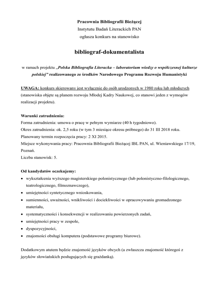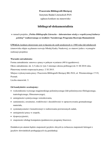 Pracownia Bibliografii Bieżącej Instytutu Badań Literackich PAN ogłasza konkurs na stanowisko bibliograf-dokumentalista w ramach projektu „Polska Bibliografia Literacka – laboratorium wiedzy o współczesnej kulturze polskiej” realizowanego ze środków Narodowego Programu Rozwoju Humanistyki UWAGA: konkurs skierowany jest wyłącznie do osób urodzonych w 1980 roku lub młodszych (stanowiska objęte są planem rozwoju Młodej Kadry Naukowej, co stanowi jeden z wymogów realizacji projektu). Warunki zatrudnienia: Forma zatrudnienia: umowa o pracę w pełnym wymiarze (40 h tygodniowo). Okres zatrudnienia: ok. 2,5 roku (w tym 3 miesiące okresu próbnego) do 31 III 2018 roku. Planowany termin rozpoczęcia pracy: 2 XI 2015. Miejsce wykonywania pracy: Pracownia Bibliografii Bieżącej IBL PAN, ul. Wieniawskiego 17/19, Poznań. Liczba stanowisk: 5. Od kandydatów oczekujemy: wykształcenia wyższego magisterskiego polonistycznego (lub polonistyczno-filologicznego, teatrologicznego, filmoznawczego), umiejętności syntetycznego wnioskowania, sumienności, uważności, wnikliwości i dociekliwości w opracowywaniu gromadzonego materiału, systematyczności i konsekwencji w realizowaniu powierzonych zadań, umiejętności pracy w zespole, dyspozycyjności, znajomości obsługi komputera (podstawowe programy biurowe). Dodatkowym atutem będzie znajomość języków obcych (a zwłaszcza znajomość któregoś z języków słowiańskich posługujących się grażdanką). Zakres obowiązków: zbieranie, opracowywanie (analiza merytoryczna) i wprowadzanie do elektronicznej bazy Polska Bibliografia Literacka materiałów książkowych i czasopiśmienniczych, opatrywanie ich syntetycznymi adnotacjami, przeprowadzanie korekt materiału bibliograficznego zgromadzonego w bazie PBL, udział w delegacjach do bibliotek na terenie kraju w celu uzupełniania zasobów bibliograficznych, wykonywanie obowiązków organizacyjno-technicznych związanych z pracą nad Polską Bibliografią Literacką (m.in. kwerendy biblioteczne, systematyzacja materiałów bibliograficznych, wypożyczanie i przynoszenie z bibliotek do Pracowni oraz odnoszenie książek i czasopism, pełnienie dyżurów w Pracowni). Oferujemy: pracę w doświadczonym zespole, szkolenie wstępne do pracy bibliograficznej. Procedura: Konkurs przeprowadzi komisja, w skład której wejdą: Kierownik Projektu, Kierownik Pracowni Bibliografii Bieżącej oraz przedstawiciele zespołu PBL. Kierownik Projektu zastrzega sobie prawo do nierozstrzygnięcia konkursu lub nieobsadzenia wszystkich stanowisk. Wybrane osoby zaprosimy na rozmowę kwalifikacyjną (19 X 2015) w siedzibie Pracowni Bibliografii Bieżącej, podczas której poprosimy o wykonanie zadania analitycznego sprawdzającego umiejętności kandydatów. Wymagane dokumenty: 1. list motywacyjny (do 500 słów) świadczący o świadomym zamiarze pracy przy opracowywaniu Polskiej Bibliografii Literackiej, 2. CV. Dokumenty należy przesyłać wyłącznie drogą elektroniczną na adres: [email protected] w nieprzekraczalnym terminie do 11 X 2015. Do CV prosimy dołączyć klauzulę: „Wyrażam zgodę na przetwarzanie moich danych osobowych dla potrzeb niezbędnych do realizacji procesu rekrutacji (zgodnie z Ustawą z dnia 29.08.1997 roku o Ochronie Danych Osobowych; tekst jednolity: Dz. U. z 2002 r. Nr 101, poz. 926 ze zm.)”.