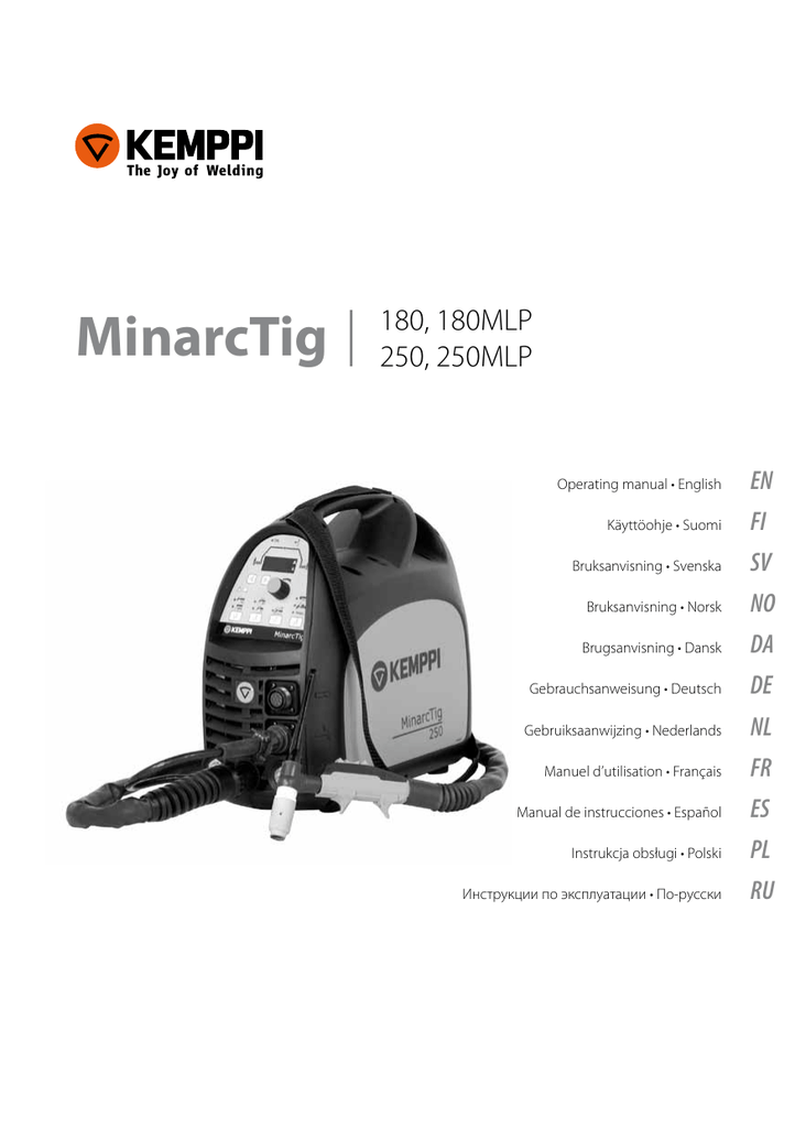 MinarcTig 180, 180MLP 250, 250MLP Operating manual • English Käyttöohje • Suomi EN FI Bruksanvisning • Svenska SV Bruksanvisning • Norsk NO Brugsanvisning • Dansk DA Gebrauchsanweisung • Deutsch DE Gebruiksaanwijzing • Nederlands NL Manuel d’utilisation • Français FR Manual de instrucciones • Español ES Instrukcja obsługi • Polski PL Инструкции по эксплуатации • По-русски RU Instrukcja obsługi Polski PL MinarcTig / © Kemppi Oy / 1117 MinarcTig / © Kemppi Oy / 1117 SPIS TREŚCI 1.WSTĘP........................................................................................................................ 3 1.1 1.2 1.3 Informacje ogólne................................................................................................... 3 Informacje o produkcie........................................................................................ 3 Metody spawania..................................................................................................... 3 2.Obsługa urządzenia...................................................................... 4 2.1 2.2 2.3 2.4 2.5 2.6 Przed rozpoczęciem pracy.................................................................................. 4 Główne elementy urządzenia........................................................................... 5 Sieć zasilająca............................................................................................................. 6 Podłączanie kabli..................................................................................................... 6 Wybór mocy spawania i elektrod................................................................... 8 Regulacja parametrów i kontrolki.................................................................. 9 2.6.1 2.6.2 2.6.3 2.6.4 Zadawanie prądu spawania i zdalne sterowanie............................. 10 Ustawienia spawania metodą MMA..................................................... 10 Funkcje spawania metodą TIG................................................................ 10 Funkcje dodatkowe modeli MLP............................................................ 12 3.Ustawienia instalacyjne....................................................... 13 4.Kody błędów............................................................................................. 14 5.Konserwacja............................................................................................ 14 5.1 5.2 Codzienna konserwacja.................................................................................... 15 Utylizacja zużytego urządzenia.................................................................... 15 6.Numery do zamówienia.......................................................... 15 7.Rozwiązywanie problemów............................................ 17 8.Dane techniczne ................................................................................ 17 PL 2 WSTĘP 1.1 Informacje ogólne Gratulujemy zakupu urządzenia spawalniczego MinarcTig. Produkty Kemppi pozwalają zwiększyć wydajność pracy i z powodzeniem służą przez wiele lat, o ile tylko są prawidłowo używane. Niniejsza instrukcja obsługi zawiera ważne informacje o bezpiecznym użytkowaniu i konserwowaniu produktu Kemppi. Dane techniczne podano na końcu instrukcji. Przed pierwszym użyciem urządzenia należy dokładnie przeczytać instrukcję. Dla bezpieczeństwa własnego i środowiska pracy należy zwracać szczególną uwagę na podane zalecenia dotyczące bezpieczeństwa. Więcej informacji na temat produktów Kemppi można uzyskać od firmy Kemppi Oy lub autoryzowanego dystrybutora Kemppi oraz na stronie internetowej www. kemppi.com. Dane techniczne przedstawione w instrukcji mogą ulec zmianie bez powiadomienia. MinarcTig / © Kemppi Oy / 1117 1. Ważne Fragmenty instrukcji, które wymagają szczególnej uwagi w celu zminimalizowania ewentualnych szkód i obrażeń są wyróżnione oznaczeniem UWAGA!. Sekcje te należy uważnie przeczytać i postępować zgodnie z zaleceniami. 1.2 Informacje o produkcie MinarcTig posiada zwartą budowę, zaprojektowany aby wydajnie i sprawnie spawać prądem stałym przy użyciu metod MMA oraz TIG. Bardzo lekki w stosunku do swojej mocy. Urządzenie można łatwo przenosić z miejsca na miejsce pracy zarówno dzięki wbudowanej rączce do przenoszenia lub paskowi do noszenia na ramię. Modele 180 i 180 MLP mogą pracować z gniazdem jednofazowym. Natomiast modele 250 i 250 MLP wymagają pracy z gniazdami trójfazowymi. 1.3 Metody spawania MinarcTig zapewnia wysoką jakość rezultatów spawania, zapewniając wielokrotne przeprowadzanie następujących procedur operacyjnych. Jakość spawania nie zależy tylko od samego urządzenia. Osobiste doświadczenie, materiał dodatkowy i zużycie odgrywają równie ważną rolę, podobnie jak odpowiednie zabezpieczenie sieci zasilającej. Spawanie następuje wówczas, gdy łuk elektryczny tworzy się pomiędzy elektrodą spawalniczą, a materiałem spawanym. Spawanie jest możliwe tylko wtedy, jeśli 3 PL MinarcTig / © Kemppi Oy / 1117 urządzenie jest właściwie podłączone, razem z kablem masy przyczepionym do materiału spawanego. Kable tworzą obwód spawalniczy, który pozwala na swobodny przepływ prądu. Należy zawsze sprawdzić czy zacisk kabla jest dobrze przymocowany do materiału spawanego, oraz ich powierzchnię styku, która musi być czysta i wolna od farby. Spawanie MMA Spawanie metodą MMA jest łatwym procesem spawalniczym. Stapianie elektrody otulonej odbywa się wskutek energii łuku elektrycznego, a przejście płynnego metalu do jeziorka powoduje zwarcia. Otulina wokół elektrody spala się tworząc ochronną powłokę gazową i żużel, który bezpośrednio ochrania płynne jeziorko spawalnicze przed zanieczyszczeniami z atmosfery. Żużel ulatuje nad jeziorko spawalnicze i krzepnie na jego powierzchni, tworząc zakrzep