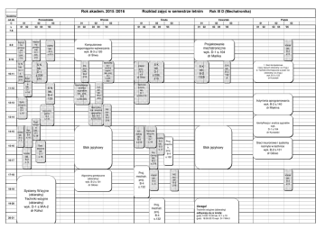 Rok akadem. 2015 /2016 Godzina od-do C L 7-8 8-9 9-10 10-11 01 01 02 11-12 12-13 Algoryt my genetyc zne D-1 209, 210 Algoryt my genetyc zne D-1 209, 210 SN lab. D-1 s. 209 210 Poniedziałek 02 03 03 04 '05 Syst. wizyjn e lab. D-1 s.18 SN lab. D-1 s.209 210 Syst. wizyjne lab. D-1 s.18 KWW lab. B-3 s. 8 Algorytmy genet. B-4 s.133 19-20 20-21 '05 KWW lab. B-3 s. 8 Syst. wizyjne lab. D-1 s.18 Identyfika cja i analiza sygna. lab, proj B-2 s.320, 322 02 03 04 03 '05 Identyfika cja i analiza sygnałów lab. B-2 s.320,322 01 01 02 Czwartek 02 03 03 04 '05 Projektowanie mechatroniczne wyk. D-1 s.104 dr Mańka SK lab. D-1 s.209, 210 KWW proj. B-3 s.8 dr Śliwa SK lab. B-2 132A SK lab. B-2 132 A Piątek 01 01 02 02 03 04 03 '05 KWW lab. B-2 219 1. Sieci komputerowe i bazy danych (obieralny; co 2 tyg.) 2. Techniki informatyczne w prakt. inż. (obieralny; co 2 tyg.) wyk. B-2 s.123 dr Kurowski Techniki inform. lab. D-1 s.209,210 Inż. opr. lab. B-2 218 Inżynieria oprogramowania wyk. B-2 s.140 dr Miękina Inż. opr. lab. B-2 218 Inż. oprog. lab. B-2 s.218 Techniki wizyjne lab. D-1 s.18 Blok językowy Identyfikacja i analiza sygnałów wyk. D-1 s.104 dr Kurowski KWW B-3 Proj. lab. mecha B-3 tr. s. 8 Inż. Oprog lab. B-2 s.218 Algorytmy genetyczne (obieralny) wyk. B-2 s.101 dr Gibiec Systemy Wizyjne (obieralny) Techniki wizyjne (obieralny) wyk. D-1 s.WA-2 dr Kohut 01 01 02 Komputerowe wspomaganie wytwarzania wyk. B-3 s.120 dr Śliwa Identyfikacja i analiza sygnałów lab., proj. B-2 s.320,322 Rok III D (Mechatronika) Środa 03 s.133 17-18 18-19 02 03 04 Syst. wizyjn e Algo. lab. Genet D-1 B-4 s.18 15-16 16-17 Wtorek 01 01 02 Inż. opro Lab. B-2 218 SN lab. B-4 133 13-14 14-15 KWW lab. B-3 s.219 Rozkład zajęć w semestrze letnim Proj. mechatr. proj. B-4 s.132 KWW lab. B-3 s. 8 Proj. mechatr. proj. B-4 s.132 Blok językowy proj. B-4 s.132 Inż. opr. lab. B-2 218 Sieci neuronowe i systemy rozmyte w technice wyk. B-2 s.101 dr Gibiec KWW lab. B-2 219 Uwaga! Techniki wizyjne (obieralny) odbywają się w środę: godz.14:00-15:30 lab. D-1 s.18 godz. 18:00-20:15 wyk. D-1 WA-3