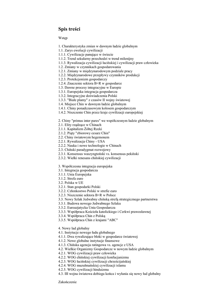 Spis treści Wstęp 1. Charakterystyka zmian w dawnym ładzie globalnym 1.1. Zarys ewolucji cywilizacji 1.1.1. Cywilizacje panujące w świecie 1.1.2. Trend sekularny przechodzi w trend milenijny 1.1.3. Rywalizacja cywilizacji łacińskiej i cywilizacji praw człowieka 1.2. Zmiany w czynnikach gospodarowania 1.2.1. Zmiany w międzynarodowym podziale pracy 1.2.2. Międzynarodowe przepływy czynników produkcji 1.2.3. Protekcjonizm gospodarczy 1.2.4. Znaczenie sektora B+R w gospodarce 1.3. Dawne procesy integracyjne w Europie 1.3.1. Europejska integracja gospodarcza 1.3.2. Integracyjne doświadczenia Polski 1.3.3. "Białe plamy" z czasów II wojny światowej 1.4. Miejsce Chin w dawnym ładzie globalnym 1.4.1. Chiny ponadczasowym kolosem gospodarczym 1.4.2. Niszczenie Chin przez kraje cywilizacji europejskiej 2. Chiny "primus inter pares" we współczesnym ładzie globalnym 2.1. Elity rządzące w Chinach 2.1.1. Kapitalizm Żółtej Rzeki 2.1.2. Piąty "zbiorowy cesarz Chin" 2.2. Chiny światowym hegemonem 2.2.1. Rywalizacja Chiny - USA 2.2.2. Nauka i nowe technologie w Chinach 2.3. Chiński paradygmat rozwojowy 2.3.1. Konsensus waszyngtoński vs. konsensus pekiński 2.3.2. Wielki renesans chińskiej cywilizacji 3. Współczesna integracja europejska 3.1. Integracja gospodarcza 3.1.1. Unia Europejska 3.1.2. Strefa euro 3.2. Polska w UE 3.2.1. Stan gospodarki Polski 3.2.2. Członkostwo Polski w strefie euro 3.2.3. Niszczenie sektora B+R w Polsce 3.3. Nowy Szlak Jedwabny chińską strefą strategicznego partnerstwa 3.3.1. Budowa nowego Jedwabnego Szlaku 3.3.2. Euroazjatycka Unia Gospodarcza 3.3.3. Współpraca Kościoła katolickiego i Cerkwi prawosławnej 3.3.4. Współpraca Chin z Polską 3.3.5. Współpraca Chin z krajami "ABC" 4. Nowy lad globalny 4.1. Instytucje nowego ładu globalnego 4.1.1. Dwa rywalizujące bloki w gospodarce światowej 4.1.2. Nowe globalne instytucje finansowe 4.1.3. Chińska agencja ratingowa vs. agencje z USA 4.2. Wielkie Organizmy Gospodarcze w nowym ładzie globalnym 4.2.1. WOG cywilizacji praw człowieka 4.2.2. WOG chińskiej cywilizacji konfucjanizmu 4.2.3. WOG łacińskiej cywilizacji chrześcijańskiej 4.2.4. WOG muzułmańskiej cywilizacji islamu 4.2.5. WOG cywilizacji hinduizmu 4.3. III wojna światowa dobiega końca i wyłania się nowy ład globalny Zakończenie Bibliografia ISBN: 978-83-64614-22-4