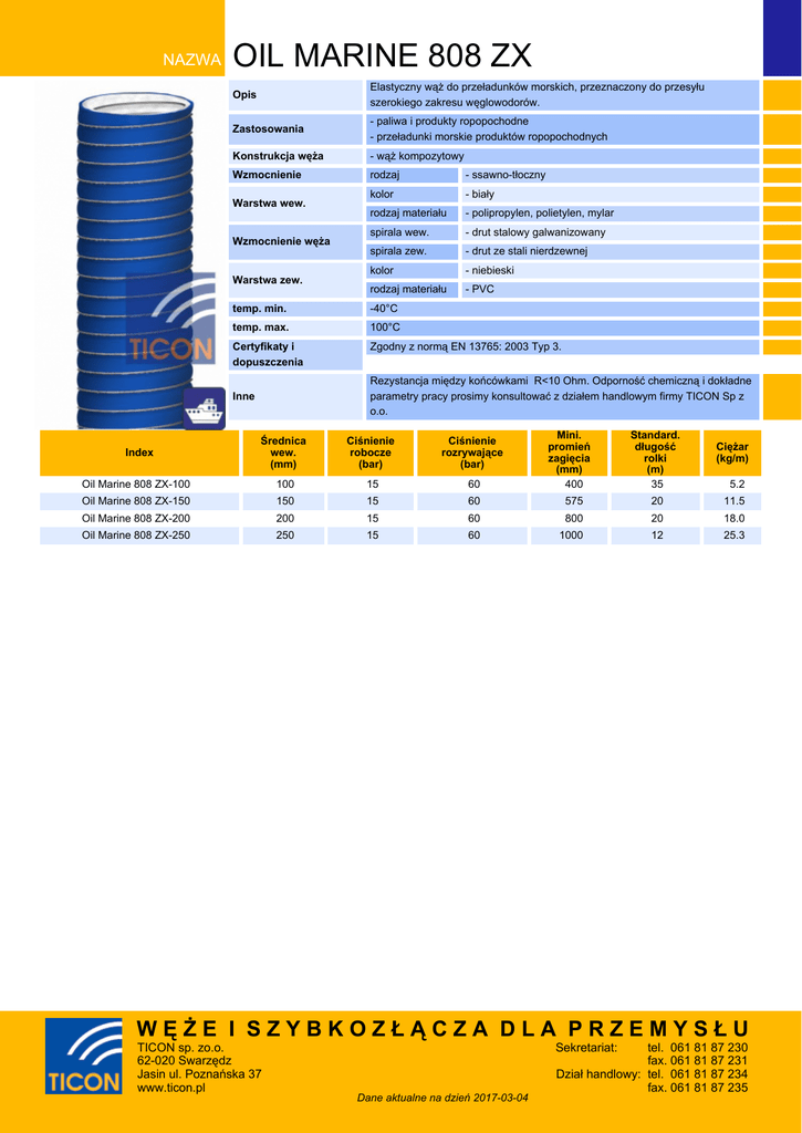 NAZWA OIL MARINE 808 ZX Opis Elastyczny wąż do przeładunków morskich, przeznaczony do przesyłu szerokiego zakresu węglowodorów. Zastosowania - paliwa i produkty ropopochodne - przeładunki morskie produktów ropopochodnych Konstrukcja węża - wąż kompozytowy Wzmocnienie rodzaj - ssawno-tłoczny kolor - biały rodzaj materiału - polipropylen, polietylen, mylar spirala wew. - drut stalowy galwanizowany spirala zew. - drut ze stali nierdzewnej kolor - niebieski rodzaj materiału - PVC Warstwa wew. Wzmocnienie węża Warstwa zew. temp. min. -40°C temp. max. 100°C Certyfikaty i dopuszczenia Zgodny z normą EN 13765: 2003 Typ 3. Rezystancja między końcówkami R<10 Ohm. Odporność chemiczną i dokładne parametry pracy prosimy konsultować z działem handlowym firmy TICON Sp z o.o. Inne Index Index Standard. Standard. długość długość rolki rolki (m) (m) 35 Ciężar Ciężar (kg/m) (kg/m) 575 20 11.5 60 800 20 18.0 60 1000 12 25.3 Średnica wew. (mm) Ciśnienie robocze (bar) Ciśnienie rozrywające (bar) Oil Marine 808 ZX-100 100 15 60 Oil Marine 808 ZX-150 150 15 60 Oil Marine 808 ZX-200 200 15 Oil Marine 808 ZX-250 250 15 Mini. Mini. promień promień zagięcia zagięcia (mm) (mm) 400 5.2 WĘŻE I SZYBKOZŁĄCZA DLA PRZEMYSŁU TICON sp. zo.o. 62-020 Swarzędz Jasin ul. Poznańska 37 www.ticon.pl Sekretariat: Dane aktualne na dzień 2017-03-04 tel. 061 81 87 230 fax. 061 81 87 231 Dział handlowy: tel. 061 81 87 234 fax. 061 81 87 235