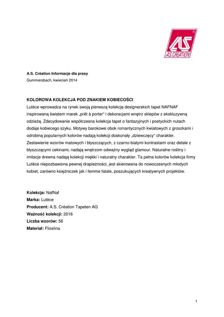 A.S. Création Informacje dla prasy Gummersbach, kwiecień 2014 KOLOROWA KOLEKCJA POD ZNAKIEM KOBIECOŚCI Lutèce wprowadza na rynek swoją pierwszą kolekcję designerskich tapet NAFNAF inspirowaną światem marek „prêt à porter“ i dekoracjami wnętrz sklepów z ekskluzywną odzieżą. Zdecydowanie współczesna kolekcja tapet o fantazyjnych i poetyckich nutach dodaje kobiecego szyku. Motywy barokowe obok romantycznych kwiatowych z groszkami i odrobiną popularnych kolorów nadają kolekcji doskonały „dziewczęcy“ charakter. Zestawienie wzorów matowych i błyszczących, z czarno-białymi kontrastami oraz detale z błyszczącymi cekinami, nadają wnętrzom odważny wygląd glamour. Naturalne rośliny i imitacje drewna nadają kolekcji miękki i naturalny charakter. Ta pełna kolorów kolekcja firmy Lutèce niepozbawiona pewnej drapieżności, jest skierowana do nowoczesnych młodych kobiet, zarówno księżniczek jak i femme fatale, poszukujących kreatywnych projektów. Kolekcja: NafNaf Marka: Lutèce Producent: A.S. Création Tapeten AG Ważność kolekcji: 2016 Liczba wzorów: 56 Materiał: Flizelina 1