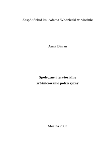 Zespół Szkół im. Adama Wodziczki w Mosinie Anna Biwan Społeczne i terytorialne zróŜnicowanie polszczyzny Mosina 2005 Społeczne i terytorialne zróŜnicowanie polszczyzny Praca wykonana podczas zajęć przedmiotu: przetwarzanie informacji w II klasie liceum profilowanego o profilu zarządzanie informacją pod kierunkiem p. Pawła Zawieji. Nauczyciel konsultant: p. Ewa Pietrzak Anna Biwan 2 Społeczne i terytorialne zróŜnicowanie polszczyzny SPIS TREŚCI Wstęp......................................................................................................................... 4 Rozdział 1 – Rys historyczny, opis przemian zachodzących na przełomie wieków....................................................................................................................... 5 Rozdział 2 - Wyjaśnienie pojęć: 2.1.Gwaraludowa....................................................................................................... 10 2.2.Gwara środowiskowa i zawodowa...................................................................... 11 Rozdział 3 –Schemat klasyfikacyjny współczesnego języka polskiego.................... 13 Rozdział 4 – Czynniki społeczne wpływające na posługiwanie się gwarą................ 14 Rozdział 5 - Regionalizm językowy: 5.1 Poszczególne rozmieszczenie dialektów w Polsce. – Mapka dialektowa.................................................................................................................. 15 5.2 Rodzaje dialektów – opis wymowy fonetycznej i wpływy na kształtowanie się dialektów głównie podczas zaborów ze szczególnym uwzględnieniem dialektu wielkopolskiego.......................................................................................................... 16 Zakończenie................................................................................................................ 22 Bibliografia................................................................................................................. 23 Spis rysunków............................................................................................................ 23 Anna Biwan 3 Społeczne i terytorialne zróŜnicowanie polszczyzny Wstęp W kaŜdy sezon letni czy zimowy część z nas wyjeŜdŜa w rejony gdzie mieszkająca ludność posługuje się innymi dialektami, gwarami. Często trudno jest nam się z nimi porozumieć, co czasami bywa bardzo irytujące. Jest tak, poniewaŜ kaŜdy dialekt posiada cechy fonetyczne dotyczące wymowy (np. inna wymowa głosek). KaŜdy dialekt posiada określenia gwarowe na poszczególne rzeczy(owoce, części garderoby). W wielu krajach równieŜ moŜna natknąć się na róŜne dialekty danego języka. Językiem polskim posługuje się około 38 milionów ludzi w Polsce, około 2 miliony w Europie poza Polską i około 8 milionów osób niezamieszkujących w Europie. Na podstawie tych danych moŜna stwierdzić, Ŝe język polski znajduje się na liście 25 największych języków na świecie. Ich przedstawiciele posługują się teŜ, na co dzień polszczyzną. Dla wielu osób nie całkiem swojsko brzmi nawet język dzieł dziewiętnastowiecznych. Niektóre słowa, wyraŜenia i zwroty okazują się niejasne. Bez wątpienia barierę recepcyjną stanowi nieznajomość ówczesnych realiów, kontekstów, do których odnoszą się autorzy np. powieści pozytywistycznych. Ale przyczyn naleŜy szukać równieŜ po stronie języka. Ewolucja polszczyzny rozpoczęła się w chwili, gdy wyłoniła się ona ze słowiańskiej wspólnoty jako samodzielny język. Proces ten przebiega według pewnych prawidłowości. Mogą się one wiązać zarówno ze zmianami w obrębie systemu językowego (np. zmiany fleksyjne), jak teŜ obejmować samo uŜycie języka w komunikacji (np. zmiany w zakresie uŜycia form grzecznościowych). Nazywa się je tendencjami rozwojowymi. Wśród najwaŜniejszych tendencji rozwojowych wymienia się: • DąŜenie do ujednolicenia języka, ale teŜ do jego róŜnicowania, • DąŜenie do oszczędności w posługiwaniu się środkami oraz do ekonomizacji wysiłku komunikacyjnego, • DąŜenie do ścisłości oraz precyzji w wyraŜaniu myśli i sądów, • DąŜenie do uzupełnienia systemu językowego. Anna Biwan 4 Społeczne i terytorialne zróŜnicowanie polszczyzny Rozdział 1 Historia języka polskiego. Od XII wieku moŜemy charakteryzować język polski dokładniej. Mamy, bowiem pierwsze zabytki piśmiennicze, z których najwcześniejszym jest łacińska „Bulla papieŜa Innocentego II”, wysłana do arcybiskupa gnieźnieńskiego, Jakuba. Znajduje się w niej około czterystu polskich nazw osobowych i miejscowych. Po tym zabytku pojawiają się inne, o wiele dla nas cenniejsze: Kazania świętokrzyskie i Kazania gnieźnieńskie, Psałterz floriański - w XIV wieku, „śywot św. BłaŜeja”, „Biblia Królowej Zofii”, „Kodeks Świętosławów”, przekład praw Macieja z RóŜana z pierwszej połowy XV wieku: roty przysiąg sądowych, Psałterz puławski, Rozmowa mistrza Polikarpa ze Śmiercią, Legenda o św. Aleksym z połowy XV wieku. Zabytki te umoŜliwiają ustalenie podstawowych cech języka tego okresu – dostarczają informacji o róŜnych dialektach polszczyzny, no i oczywiście są dokumentami literackimi. Język literacki, czyli ogólnopolski, powstał późno: dopiero w wieku XV rozwinęły się najwaŜniejsze ogólnopolskie normy języka pisanego i formował się ogólnopolski język mówiony, czyli potoczny. Przedtem mówiono w Polsce tylko gwarą. Co więcej ogólnopolski język literacki utworzył się z gwar. MoŜna teŜ z łatwością wskazać, co w języku ogólnopolskim pochodzi z poszczególnych gwar. Podstawą nowego państwa polskiego, które tworzyło się w XIV i XV w. – za Łokietka, za Kazimierza Wielkiego i za Władysława Jagiełły - były połączone dzielnice Wielkopolski (Gniezno, Poznań) i Małopolska (Kraków). Dlatego polski język lit
