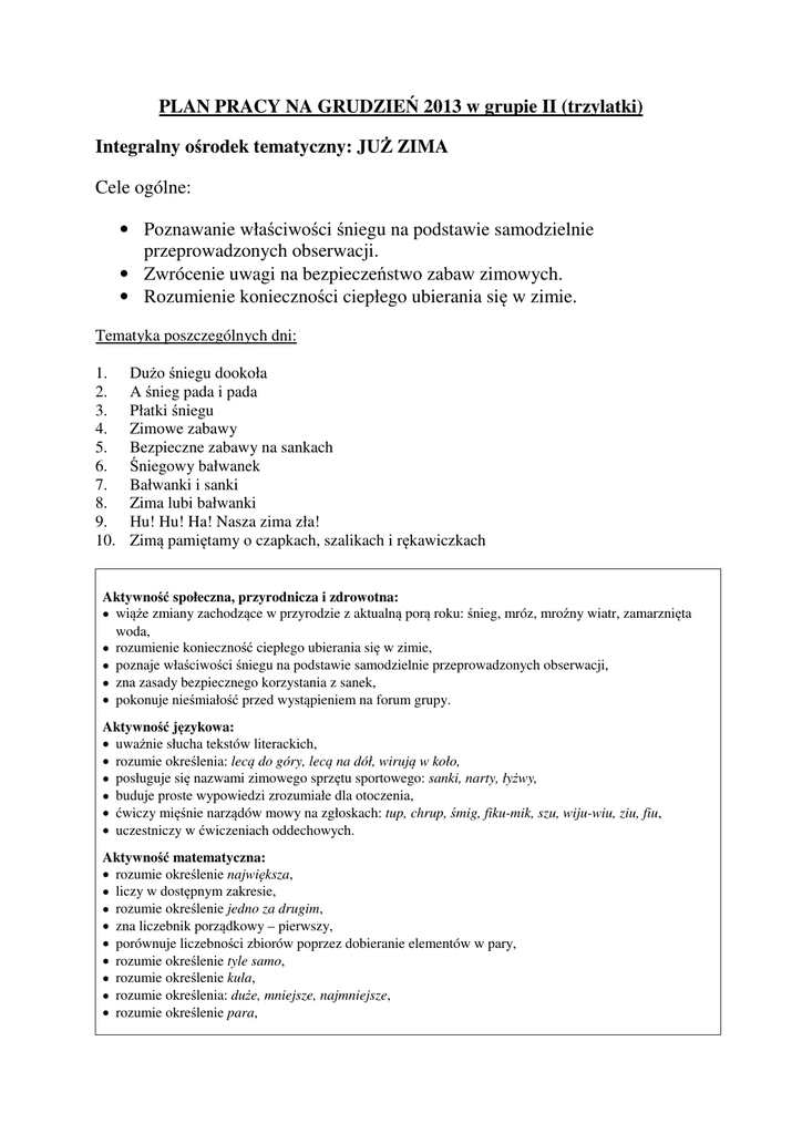 PLAN PRACY NA GRUDZIEŃ 2013 w grupie II (trzylatki) Integralny