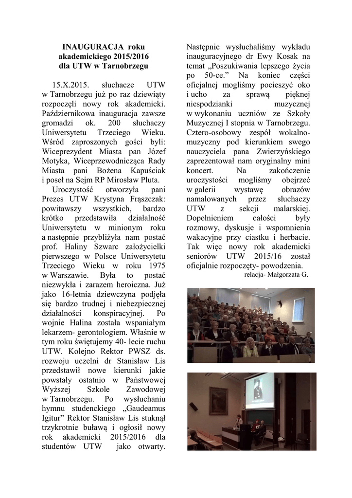 INAUGURACJA roku akademickiego 2015/2016 dla UTW w Tarnobrzegu 15.X.2015. słuchacze UTW w Tarnobrzegu już po raz dziewiąty rozpoczęli nowy rok akademicki. Październikowa inauguracja zawsze gromadzi ok. 200 słuchaczy Uniwersytetu Trzeciego Wieku. Wśród zaproszonych gości byli: Wiceprezydent Miasta pan Józef Motyka, Wiceprzewodnicząca Rady Miasta pani Bożena Kapuściak i poseł na Sejm RP Mirosław Pluta. Uroczystość otworzyła pani Prezes UTW Krystyna Frąszczak: powitawszy wszystkich, bardzo krótko przedstawiła działalność Uniwersytetu w minionym roku a następnie przybliżyła nam postać prof. Haliny Szwarc założycielki pierwszego w Polsce Uniwersytetu Trzeciego Wieku w roku 1975 w Warszawie. Była to postać niezwykła i zarazem heroiczna. Już jako 16-letnia dziewczyna podjęła się bardzo trudnej i niebezpiecznej działalności konspiracyjnej. Po wojnie Halina została wspaniałym lekarzem- gerontologiem. Właśnie w tym roku świętujemy 40- lecie ruchu UTW. Kolejno Rektor PWSZ ds. rozwoju uczelni dr Stanisław Lis przedstawił nowe kierunki jakie powstały ostatnio w Państwowej Wyższej Szkole Zawodowej w Tarnobrzegu. Po wysłuchaniu hymnu studenckiego „Gaudeamus Igitur” Rektor Stanisław Lis stuknął trzykrotnie buławą i ogłosił nowy rok akademicki 2015/2016 dla studentów UTW jako otwarty. Następnie wysłuchaliśmy wykładu inauguracyjnego dr Ewy Kosak na temat „Poszukiwania lepszego życia po 50-ce.” Na koniec części oficjalnej mogliśmy pocieszyć oko i ucho za sprawą pięknej niespodzianki muzycznej w wykonaniu uczniów ze Szkoły Muzycznej I stopnia w Tarnobrzegu. Cztero-osobowy zespół wokalnomuzyczny pod kierunkiem swego nauczyciela pana Zwierzyńskiego zaprezentował nam oryginalny mini koncert. Na zakończenie uroczystości mogliśmy obejrzeć w galerii wystawę obrazów namalowanych przez słuchaczy UTW z sekcji malarskiej. Dopełnieniem całości były rozmowy, dyskusje i wspomnienia wakacyjne przy ciastku i herbacie. Tak więc nowy rok akademicki seniorów UTW 2015/16 został oficjalnie rozpoczęty- powodzenia. relacja- Małgorzata G.