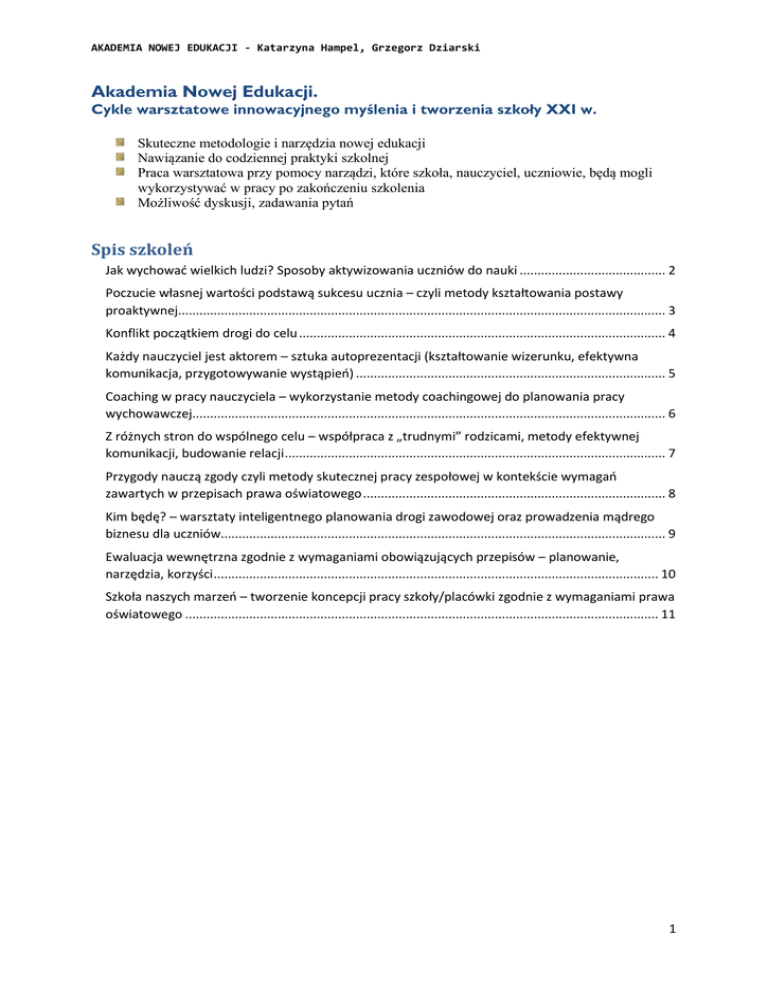 AKADEMIA NOWEJ EDUKACJI - Katarzyna Hampel, Grzegorz Dziarski Akademia Nowej Edukacji. Cykle warsztatowe innowacyjnego myślenia i tworzenia szkoły XXI w. Skuteczne metodologie i narzędzia nowej edukacji Nawiązanie do codziennej praktyki szkolnej Praca warsztatowa przy pomocy narządzi, które szkoła, nauczyciel, uczniowie, będą mogli wykorzystywać w pracy po zakończeniu szkolenia Możliwość dyskusji, zadawania pytań Spis szkoleń Jak wychować wielkich ludzi? Sposoby aktywizowania uczniów do nauki ......................................... 2 Poczucie własnej wartości podstawą sukcesu ucznia – czyli metody kształtowania postawy proaktywnej......................................................................................................................................... 3 Konflikt początkiem drogi do celu ....................................................................................................... 4 Każdy nauczyciel jest aktorem – sztuka autoprezentacji (kształtowanie wizerunku, efektywna komunikacja, przygotowywanie wystąpień) ....................................................................................... 5 Coaching w pracy nauczyciela – wykorzystanie metody coachingowej do planowania pracy wychowawczej..................................................................................................................................... 6 Z różnych stron do wspólnego celu – współpraca z „trudnymi” rodzicami, metody efektywnej komunikacji, budowanie relacji ........................................................................................................... 7 Przygody nauczą zgody czyli metody skutecznej pracy zespołowej w kontekście wymagań zawartych w przepisach prawa oświatowego ..................................................................................... 8 Kim będę? – warsztaty inteligentnego planowania drogi zawodowej oraz prowadzenia mądrego biznesu dla uczniów............................................................................................................................. 9 Ewaluacja wewnętrzna zgodnie z wymaganiami obowiązujących przepisów – planowanie, narzędzia, korzyści ............................................................................................................................. 10 Szkoła naszych marzeń – tworzenie koncepcji pracy szkoły/placówki zgodnie z wymaganiami prawa oświatowego ..................................................................................................................................... 11 1 AKADEMIA NOWEJ EDUKACJI - Katarzyna Hampel, Grzegorz Dziarski CYKL I: Nowa dydaktyka i psychologia w szkole 3.0 Warsztat 1. Temat warsztatu: Jak wychować wielkich ludzi? Sposoby aktywizowania uczniów do nauki Adresaci: Dyrektorzy, rady pedagogiczne, nauczyciele szkół, przedszkoli i placówek oświatowych: publicznych i prywatnych ● Korzyści z udziału w warsztatach: Program warsztatu (optymalnie 2 dni): Informacje o prowadzących Narzędzia/ materiały szkoleniowe: Poznanie zasad skutecznego budowania w uczniach odpowiedzialności za własny rozwój ● Zaznajomienie z nowoczesnymi metodami pobudzania aktywności uczniów (neurodydaktyka, ocenianie kształtujące, psychologia sukcesu) ● Zwiększenie kompetencji w zakresie przywództwa - wywierania pozytywnego wpływu na innych (uczniów, rodziców) ● Poznanie zasad budowania przyjaznego klimatu i otoczenia organizacyjnego dla wychowywania wielkich ludzi Etap I: Dlaczego zależy nam na aktywności uczniów. ● Co oznaczają pojęcia: aktywny uczeń, aktywny człowiek (cechy aktywnego ucznia)? ● Aktywność, a odpowiedzialność za własny rozwój ● Proaktywność – czym jest, jak wpływa na proces uczenia się, jak wpływa na rozwój? ● Jak pracuje się z uczniem, który jest aktywny? Związek pomiędzy aktywnością ucznia a poczuciem sukcesu nauczyciela. Etap II: Aktywność ucznia, a nastawienie nauczyciela jego na rozwój (wg. CarolDwek, „Nowa psychologia sukcesu”) ● Czy jesteśmy nastawieni na trwałość czy na zmianę i co z tego wynika? ● Co sprawia, że człowiek przestaje się uczyć? Działania, które hamują aktywność. ● Sukces, a umiejętność znoszenia niepowodzeń - wpływ rodzaju nastawienia na znoszenie porażki i umiejętność uczenia się na błędach. Etap III: Spojrzenie współczesnej nauki na proces kształtowania aktywności uczniów. ● Wybrane zagadnienia z neurodydaktyki. Możliwości wykorzystania wyników badan nad funkcjonowaniem mózgu z praktyką szkolną ● Przedstawienie głównych elementów Oceniania Kształtującego ich wpływu na kształtowanie aktywności uczniów Etap IV. Przyjazne otoczenie. Szkoła jako instytucja promująca aktywność. ● Zwiększanie inteligencji organizacyjnej - metodologia ©QInS4-System ● Plan działania na najbliższy kwartał - metodologia ©InMoB Katarzyna Hampel– pedagog, logopeda, dyrektor gimnazjum, prowadzi coaching dla dyrektorów szkół. Grzegorz Dziarski – prawnik, konsultant i menedżer zespołów projektowych ds. rozwoju organizacji. Analityk systemów zarządzania. 605 238 203; [email protected]; www.qins4system.pl Lista przekonań identyfikujących nastawienie Karty do analizy sytuacji i problemów metodą ©KaWa&©KaGai wg Birkenbihl Matryce do gier angażujących uczniów wg Marzano Model © Inteligentnej Organizacji QInS4-System i © Inteligentnego Modelu Działania InMoB Kwestionariusze. 2 AKADEMIA NOWEJ EDUKACJI - Katarzyna Hampel, Grzegorz Dziarski Warsztat 2. Temat warsztatu: Poczucie własnej wartości podstawą sukcesu ucznia – czyli metody kształtowania postawy proaktywnej Adresaci: Dyrektorzy, rady pedagogiczne, nauczyciele szkół, przedszkoli i placówek oświatowych: publicznych i prywatnych Korzyści z udziału w warsztatach: Program warsztatu (optymalnie 2 dni): Informacje o prowadzących Narzędzia/ materiały szkoleniowe: ● ● ● ● Zwiększen