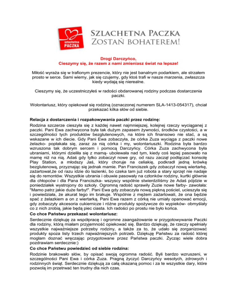 Drogi Darczyńco, Cieszymy się, że razem z nami zmieniasz świat na lepsze! Miłość wyraża się w trafionym prezencie, który nie jest banalnym podarkiem, ale strzałem prosto w serce. Sami wiemy, jak się czujemy, gdy ktoś trafi w nasze marzenia, zwłaszcza kiedy wydają się nierealne. Cieszymy się, że uczestniczyłeś w radości obdarowanej rodziny podczas dostarczenia paczki. Wolontariusz, który opiekował się rodziną (oznaczonej numerem SLA-1413-054317), chciał przekazać kilka słów od siebie. Relacja z dostarczenia i rozpakowywania paczki przez rodzinę: Rodzina szczerze cieszyła się z każdej nawet najmniejszej, kolejnej rzeczy wyciąganej z paczki. Pani Ewa zachwycona była tak dużym zapasem żywności, środków czystości, a w szczególności tych produktów bezglutenowych, na które ich finansowo nie stać, a są wskazane w ich diecie. Gdy Pani Ewa zobaczyła, że córka Zuza wyciąga z paczki nowe żelazko- popłakała się, zaraz za nią córka i my, wolontariuszki. Rodzina była bardzo wzruszona tak dobrym sercem i pomocą Darczyńcy. Córka Zuza zachwycona była ubraniami, którymi dzieliła się z mamą- ubolewała nad tym, kiedy coś lepiej pasowało na mamę niż na nią. Adaś gdy tylko zobaczył nowe gry, od razu zaczął podłączać konsolę Play Station, a młodszy Jaś, który choruje na celiakię, podkradł jedną krówkę bezglutenową, przyznając się jednak mamie. Pan Franciszek gdy zobaczył nową wiertarkę, zażartował,że od razu idzie do łazienki, bo czeka tam już robota a stary sprzęt nie nadaje się do remontów. Wszystkie ubrania i obuwie pasowały na członków rodziny, kurtki głównie dla chłopców i dla Pana Franciszka- wszyscy wspólnie stwierdziliśmy że Adaś pójdzie w poniedziałek wystrojony do szkoły. Ogromną radość sprawiły Zuzie nowe farby- zawołała: "Mamo patrz jakie duże farby!". Pani Ewa gdy zobaczyła nową piękną pościel, ucieszyła się i powiedziała, że akurat tego im brakuje. Wspólnie z mężem zażartowali, że ona będzie spać z żelazkiem a on z wiertarką. Pani Ewa razem z córką nie umiały opanować emocji, gdy zobaczyły akcesoria cukiernicze i różne produkty spożywcze do wypieków- obmyślały co z nich zrobią, jakie będą piec ciasta. Ich radości po prostu nie było końca. Co chce Państwu przekazać wolontariusz: Serdecznie dziękuję za współpracę i ogromne zaangażowanie w przygotowywanie Paczki dla rodziny, którą miałam przyjemność opiekować się. Bardzo dziękuję, że rzeczy spełniały wszystkie najważniejsze potrzeby rodziny, a także za to, że udało się zorganizować produkty spoza listy trzech najważniejszych potrzeb. Dziękuję Państwu za radość której mogłam doznać wręczając przygotowane przez Państwa paczki. Życząc wiele dobra pozdrawiam serdecznie:) Co chce Państwu powiedzieć od siebie rodzina: Rodzinie brakowało słów, by opisać swoją ogromna radość. Byli bardzo wzruszeni, w szczególności Pani Ewa i córka Zuza. Pragną życzyć Darczyńcy wesołych, zdrowych i rodzinnych świąt. Serdecznie dziękują za całą okazaną pomoc i za te wszystkie dary, które pozwolą im przetrwać ten trudny dla nich czas.