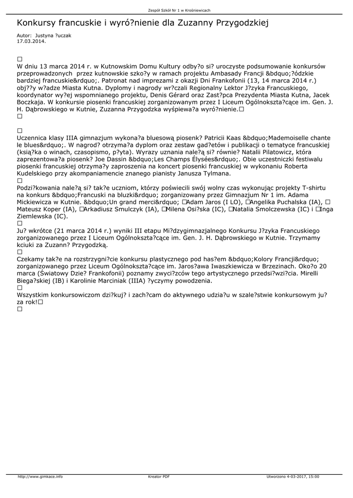 Zespół Szkół Nr 1 w Krośniewicach Konkursy francuskie i wyró?nienie dla Zuzanny Przygodzkiej Autor: Justyna ?uczak 17.03.2014. W dniu 13 marca 2014 r. w Kutnowskim Domu Kultury odby?o si? uroczyste podsumowanie konkursów przeprowadzonych przez kutnowskie szko?y w ramach projektu Ambasady Francji „?ódzkie bardziej francuskie”. Patronat nad imprezami z okazji Dni Frankofonii (13, 14 marca 2014 r.) obj??y w?adze Miasta Kutna. Dyplomy i nagrody wr?czali Regionalny Lektor J?zyka Francuskiego, koordynator wy?ej wspomnianego projektu, Denis Gérard oraz Zast?pca Prezydenta Miasta Kutna, Jacek Boczkaja. W konkursie piosenki francuskiej zorganizowanym przez I Liceum Ogólnokszta?cące im. Gen. J. H. Dąbrowskiego w Kutnie, Zuzanna Przygodzka wyśpiewa?a wyró?nienie. Uczennica klasy IIIA gimnazjum wykona?a bluesową piosenk? Patricii Kaas „Mademoiselle chante le blues”. W nagrod? otrzyma?a dyplom oraz zestaw gad?etów i publikacji o tematyce francuskiej (ksią?ka o winach, czasopismo, p?yta). Wyrazy uznania nale?ą si? równie? Natalii Pilatowicz, która zaprezentowa?a piosenk? Joe Dassin „Les Champs Élysées”. Obie uczestniczki festiwalu piosenki francuskiej otrzyma?y zaproszenia na koncert piosenki francuskiej w wykonaniu Roberta Kudelskiego przy akompaniamencie znanego pianisty Janusza Tylmana. Podzi?kowania nale?ą si? tak?e uczniom, którzy poświecili swój wolny czas wykonując projekty T-shirtu na konkurs „Francuski na bluzki” zorganizowany przez Gimnazjum Nr 1 im. Adama Mickiewicza w Kutnie. „Un grand merci” à Adam Jaros (I LO), à Angelika Puchalska (IA), à Mateusz Koper (IA), à Arkadiusz Smulczyk (IA), à Milena Osi?ska (IC), à Natalia Smolczewska (IC) i à Inga Ziemlewska (IC). Ju? wkrótce (21 marca 2014 r.) wyniki III etapu Mi?dzygimnazjalnego Konkursu J?zyka Francuskiego zorganizowanego przez I Liceum Ogólnokszta?cące im. Gen. J. H. Dąbrowskiego w Kutnie. Trzymamy kciuki za Zuzann? Przygodzką. Czekamy tak?e na rozstrzygni?cie konkursu plastycznego pod has?em „Kolory Francji” zorganizowanego przez Liceum Ogólnokszta?cące im. Jaros?awa Iwaszkiewicza w Brzezinach. Oko?o 20 marca (Światowy Dzie? Frankofonii) poznamy zwyci?zców tego artystycznego przedsi?wzi?cia. Mirelli Biega?skiej (IB) i Karolinie Marciniak (IIIA) ?yczymy powodzenia. Wszystkim konkursowiczom dzi?kuj? i zach?cam do aktywnego udzia?u w szale?stwie konkursowym ju? za rok! http://www.gimkace.info Kreator PDF Utworzono 4-03-2017, 15:00