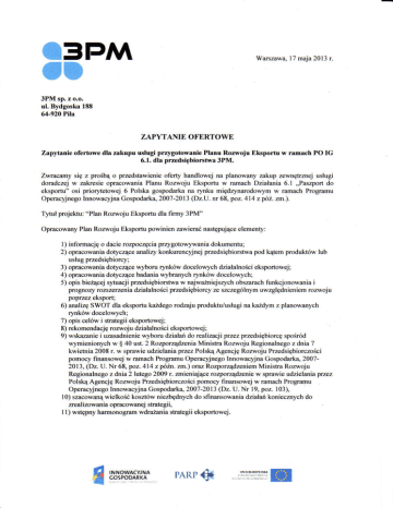 *3PM Warszawa, l7 maja2013r. ffim 3PM sp.z o.o. ol. Bydgoska188 6,|-920Pila ZAPYTANIE OFERTOWE ZapytaDieofertowe dla zakupu Nlugi przygotowanie Pltnu Rozwoju Ebportu w r.macb PO IG 6.1.dla przedsipbiorutwr 3PM. Zwncamy siQz proSb4o przedstawienieoferry handlow€j na planowanyzakup zewnitrmej uslugi domdczejw zakesje opracowaniaPlanu Rozwoju Eksportu w ramachDzialania 6.1 ,,Paszportdo eksportu" osi prioD4etowej6 Polskagospodarkana rynku mi€dzynarodo\rymw ramachPrograrnu (Dz.U.nr 68,poz.414z p62.nn.). Operacyjnego Innowacyjna Gospodark42007-2013 T,'tul projeltui "Plan Ronvoju Eksportudla firmy 3PM" elementy: OpracowanyPlanRozwojuEksportupowinienzawiemcnastQpujqce przygotowywania I) informacjgo dacierozpoczecia dokumentu; 2) opracowaniadotycz4ceanaliry konkurencyjnejpzedsiQbiorstwapod k4temprodukt6wlub uslugprzedsiQbiorcy; 3) opraco8aniadotycz4cewyboru r),nk6wdocelowychdzialalnoscieksportowej; 4) opracowaniadotycz4c€badaniawybranychrynk6w docelo*ych: 5) opis bie24cejsltuacji przedsigbiorstwaw najwainiejszychobszarachfunkcjonowaniai pmgnozyrozszerzeniadzialalnosciprzedsipbiorcyze szczeg6lnyfirwzglQdnieniern rozwoju poprzezeksport; 6) analizqSWOT dla eksportukazdegorodzajuFoduktu/uslugi na kaidym z planowanych rynk6w docelowych; ?) opis c€l6w i strategiiekportowej; E) rekomendacjgrozwoju dzialalnoscieksportowej; 9) wskazaniei uzasadnienicwyboru dzialai do rcalizacji przezprzedsiQbio.ce spodr6d wymienionychw $ 40 ust. 2 RozpoE4dzeniaMinisha RozwojuRegionalnegoz dnia 7 kwietnia 2008r. w sprawieudzielaniaprzezPolskqAgencjQRozwoju PrzedsiQbiorczosci pomocyfinansowejw rarnachProgamu OperacyjnegoInnowacyjnaGospodark420072013,(Dz. U. Nr 68, poz.4 l 4 z p6 . zm.) 062 Rozporz4dzeniem Ministra Rozwoju Regionalnegoz dnia 2 lutego2009 r. zmieniajqc€rozporz4dzeniew sprawieudzielaniaprzez pomocyfinsnsowejw mmachProgramu PolskqAgencjqRozwoju PrzedsiQbiorczosci (Dz. U. Nr 19,poz.l0l), 2007-2013 Opemcyjnego Innowacyjna Cospodarka, l0) szacowanqwielkos6koszt6wniezbpdnychdo sfinansowaniadzialaf koniecmychdo zrealizo\,rania strategii. opracowanej 11) wstppnyharmonogramwdra2aniastrategiiekportowej. PIanRozwoju Eksportupowinien w sposobkompleksowyokregladstrategiQeksportow4do realizacji w kolejnychdw6chlatach. Ofertapowinnazawiem6: . nazwQi adresoferenta, . datQsporzedzenia, . cenFcalkowitq netto i brutto, . temin wainosci ofer8, . terminrealizacji, . warunki i termin platnoici, . informacjeo ofercie dolyczqcejwdrazaniaPlan6w RozwojuEksportuw ostatn;chtrzech latach(liczba zrealizowanychprojekt6w wyszukiwaniapartner6wwraz z referencjami). r. Ofenapolinnabyc*arnado:30.06.201J Oferta powinnaby6 sporz4dzon napapiefte Ermovr'ymoferentalub opatrzonapiecz4tkqfirrnowa posiadaddatQsporzqdzeniai czfelny podpis.Ofertamo2€byi przeslanaF)czt4 elektroniczn4na lub listemna adressiedzibyfirmy: 3PM, ul. Bydgoska188, adres:m.szcTcnanskililluuluLcqql.pl Plan Rozwoju Eksportu". 6+920 Pil^ z dopiskiem "Ofertr Termin skladani&ofert: 21 tu^j^2013 r. do godz.12.00 Kryteria oceny ofert l. Maksymrlny temin reelizNcji zlecenis - do 30 dni od daty podpisaniaumowryna przygotowanie PRE- I0 pkt.,3 l-50 dni 5 pkt.,pow.50 dni - 0 pkL 2. Cena calkowita za uslugQ- do 12.500zl netto* 20 pkt., pow. 12.500zl netto- 0 pkL 3. Doswiadczenlewe wdrareDlu PlrD6w Rozwoju Eksportu - ofer€ntkt6ry wykazesig pod wzgl€demliczby projekt6w polegaj4cychna wyszukiwaniu najwiekszlm do5wiadczeniem parmerowhandlowychna rynkachdocelo*ych - 30 pkt., kolejny oferentz najwiQkszlm doswiadczeniern - 20 pkt, trze.cioferentpod wzglpdemliczby wdrozonychprojekt6w I0 pk! pozostali- 0 pkt. 4. Maksymalny termin plrtnoici z. uslugt - pow. 90 dni od zatwi€dzeniaPRE przezRIF - I 0 pkt., do 90 dni od zatwierdzeniaPREprzezRIF - 5 pkt, nie pomiej niz w ci4gu 7 dni od zatwierdzenia PREprzezRIF 0 pkt. 5. Warunki platno!.i - OfertazawieraklauzulQo brakuobowipku dokonaniazaplatyw przypadku negat,'wnejweryfikacji PRE- 30 pkt. Oferta nie zawieratakiej klauzuli - 0 pk1. ( ..-,."- -*-- ' --'' 3FrtlsD.zo,o. 188 6aSAm.' d Bydgoska 3023803?2 REGON ilrP7642664248 wrw3pmcond GOSPOOAf,(A PARPs ,-1,Ti1H