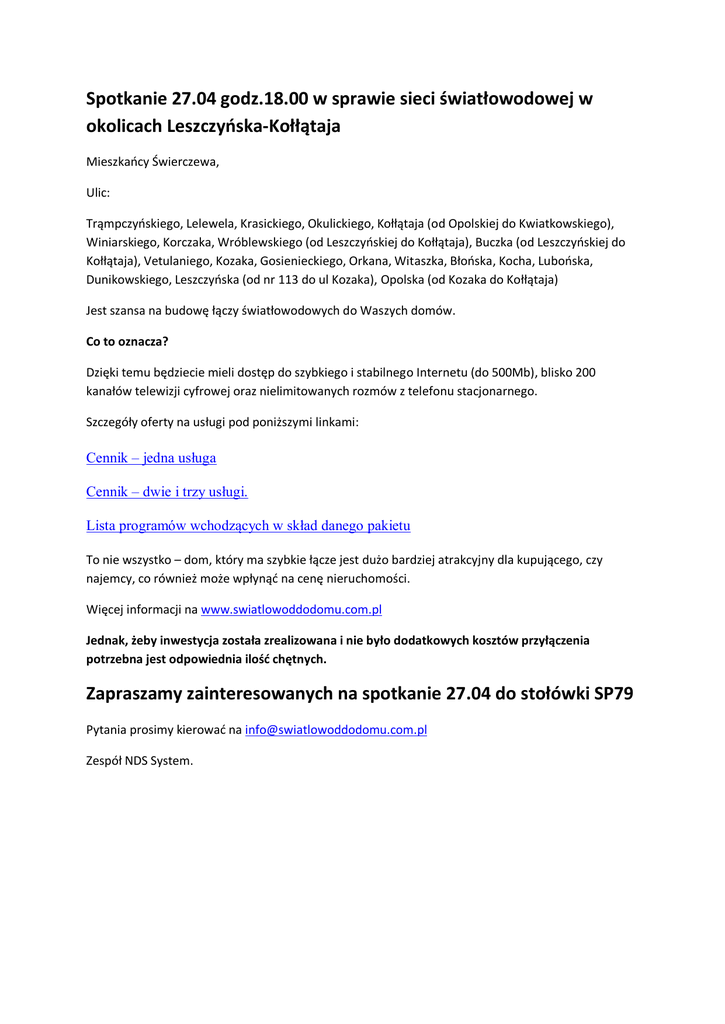 Spotkanie 27.04 godz.18.00 w sprawie sieci światłowodowej w okolicach Leszczyńska-Kołłątaja Mieszkańcy Świerczewa, Ulic: Trąmpczyńskiego, Lelewela, Krasickiego, Okulickiego, Kołłątaja (od Opolskiej do Kwiatkowskiego), Winiarskiego, Korczaka, Wróblewskiego (od Leszczyńskiej do Kołłątaja), Buczka (od Leszczyńskiej do Kołłątaja), Vetulaniego, Kozaka, Gosienieckiego, Orkana, Witaszka, Błońska, Kocha, Lubońska, Dunikowskiego, Leszczyńska (od nr 113 do ul Kozaka), Opolska (od Kozaka do Kołłątaja) Jest szansa na budowę łączy światłowodowych do Waszych domów. Co to oznacza? Dzięki temu będziecie mieli dostęp do szybkiego i stabilnego Internetu (do 500Mb), blisko 200 kanałów telewizji cyfrowej oraz nielimitowanych rozmów z telefonu stacjonarnego. Szczegóły oferty na usługi pod poniższymi linkami: Cennik – jedna usługa Cennik – dwie i trzy usługi. Lista programów wchodzących w skład danego pakietu To nie wszystko – dom, który ma szybkie łącze jest dużo bardziej atrakcyjny dla kupującego, czy najemcy, co również może wpłynąć na cenę nieruchomości. Więcej informacji na www.swiatlowoddodomu.com.pl Jednak, żeby inwestycja została zrealizowana i nie było dodatkowych kosztów przyłączenia potrzebna jest odpowiednia ilość chętnych. Zapraszamy zainteresowanych na spotkanie 27.04 do stołówki SP79 Pytania prosimy kierować na [email protected] Zespół NDS System.