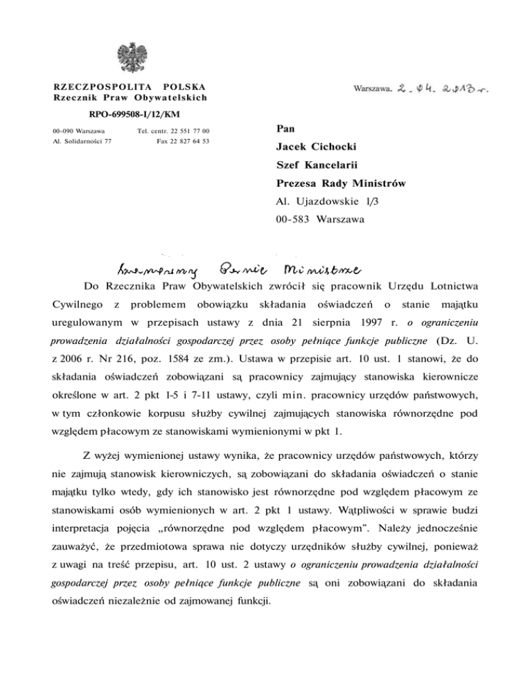 RZECZPOSPOLITA POLSKA Rzecznik Praw O b y w a t e l s k i c h RPO-699508-I/12/KM 00-090 Warszawa Pan Tel. centr. 22 551 77 00 Al. Solidarności 77 Fax 22 827 64 53 Jacek Cichocki Szef Kancelarii Prezesa Rady Ministrów Al. Ujazdowskie 1/3 00-583 Warszawa Do Rzecznika Praw Obywatelskich zwrócił się pracownik Urzędu Lotnictwa Cywilnego z problemem obowiązku składania oświadczeń o stanie majątku uregulowanym w przepisach ustawy z dnia 21 sierpnia 1997 r. o ograniczeniu prowadzenia działalności gospodarczej przez osoby pełniące funkcje publiczne (Dz. U. z 2006 r. Nr 216, poz. 1584 ze zm.). Ustawa w przepisie art. 10 ust. 1 stanowi, że do składania oświadczeń zobowiązani są pracownicy zajmujący stanowiska kierownicze określone w art. 2 pkt 1-5 i 7-11 ustawy, czyli min. pracownicy urzędów państwowych, w tym członkowie korpusu służby cywilnej zajmujących stanowiska równorzędne pod względem płacowym ze stanowiskami wymienionymi w pkt 1. Z wyżej wymienionej ustawy wynika, że pracownicy urzędów państwowych, którzy nie zajmują stanowisk kierowniczych, są zobowiązani do składania oświadczeń o stanie majątku tylko wtedy, gdy ich stanowisko jest równorzędne pod względem płacowym ze stanowiskami osób wymienionych w art. 2 pkt 1 ustawy. Wątpliwości w sprawie budzi interpretacja pojęcia „równorzędne pod względem płacowym". Należy jednocześnie zauważyć, że przedmiotowa sprawa nie dotyczy urzędników służby cywilnej, ponieważ z uwagi na treść przepisu, art. 10 ust. 2 ustawy o ograniczeniu prowadzenia działalności gospodarczej przez osoby pełniące funkcje publiczne są oni zobowiązani do składania oświadczeń niezależnie od zajmowanej funkcji. 2 Rzecznik skierował w dniu 17 lipca 2012 r. pismo do Dyrektora Generalnego Urzędu Lotnictwa Cywilnego z prośbą o udzielenie informacji, którzy pracownicy zatrudnieni w Urzędzie są zobowiązani do składania oświadczeń majątkowych. Dyrektor Generalny w piśmie z dnia 26 lipca 2012 r. wskazał, że stanowiska równorzędne to te, które zostały umieszczone na tej samej pozycji w Załączniku Nr 2 do rozporządzenia Prezesa Rady Ministrów z dnia 9 grudnia 2009 r. w sprawie określania stanowisk urzędniczych, wymaganych kwalifikacji zawodowych, stopni służbowych urzędników służby cywilnej, mnożników do ustalania wynagrodzenia oraz szczegółowych zasad ustalania i wypłacania innych świadczeń przysługujących członkom korpusu służby cywilnej (Dz. U. Nr 211, poz. 1630 ze zm.). Tabela wyszczególniona we wskazanym załączniku podaje grupy stanowisk oraz mnożnik kwoty bazowej, służący do ustalenia wysokości wynagrodzenia zasadniczego członków korpusu służby cywilnej. Przykładowo, stanowiska należące do kategorii „stanowiska koordynujące w służbie cywilnej" oraz należące do kategorii „stanowiska samodzielne służby cywilnej", zostały umieszczone w tym samym miejscu w tabeli i może być dla nich ustalony mnożnik mieszczący się w zakresie od 1,0 do 6,0. Jeżeli więc przyjąć interpretację wskazaną przez Dyrektora Generalnego ULC, osoby zajmujące stanowiska należące do wskazanych kategorii będą zobowiązane do składania oświadczeń o stanie majątku, ponieważ zostaną one uznane za stanowiska równorzędne pod względem płacowym, mimo że mnożnik ustalony dla poszczególnych stanowisk, a w konsekwencji wysokość otrzymywanego wynagrodzenia, mogą się znacząco od siebie różnić. Z kolei, jak zostało wskazane przez A. Rzetecką-Gil w Komentarzu do art. 2 ustawy o ograniczeniu działalności gospodarczej przez osoby pełniące funkcje publiczne (LEX), pojęcie „równorzędne pod względem płacowym" może być także interpretowane w odmienny sposób, przez przyjęcie, że chodzi o pracownika, który otrzymuje wynagrodzenie w wysokości odpowiadającej wynagrodzeniu osoby zajmującej stanowisko kierownicze. W wyniku powyższej korespondencji, Rzecznik skierował w dniu 10 września 2012 r. pismo do Szefa Służby Cywilnej z prośbą o zajęcie stanowiska odnośnie interpretacji pojęcia „równorzędne pod względem płacowym" oraz wskazanie, jaka jest praktyka w urzędach państwowych. Z odpowiedzi Szefa Służby Cywilnej wynika, że w jego 3 ocenie powyższe pojęcie powinno być interpretowane w oparciu o przepisy rozporządzenia Prezesa Rady Ministrów. Jednak, jak zostało wskazane w piśmie, stanowiska specjalistyczne o mnożnikach 0,9-3,5 oraz stanowiska wspomagające w służbie cywilnej o mnożnikach 0,8-2,7 nie powinny być traktowane jako równorzędne pod względem płacowym ze stanowiskiem naczelnika wydziału, gdyż przedział ustalony dla naczelnika w górnej wysokości jest zasadniczo różny (wynosi 1,0-6,0). W wyniku dalszej korespondencji, Szef Służby Cywilnej w piśmie z dnia 15 lutego 2013 r. podzielił stanowisko Rzecznika o zasadności doprecyzowania przepisów ustawy o ograniczeniu prowadzenia działalności gospodarczej przez osoby pełniące funkcje publiczne, w celu zdefiniowania pojęcia „stanowiska równorzędne pod względem placowym". W mojej ocenie rozbieżności w interpretacji powyższego pojęcia mogą powodować problemy ze stosowaniem przepisów, zarówno przez osoby mające składać oświadczenia majątkowe, jak i osoby przełożone osób zobowiązanych do składania tych oświadczeń, a w konsekwencji stwarzają stan niepewności prawnej naruszającej prawa i wolności obywatelskie. Podkreślenia wymaga, że obowiązek składania oświadczeń majątkowych stanowi istotną ingerencję w konstytucyjne prawa i wolności człowieka i obywatela, w szczególności w wynikające z art. 47 Konstytucji prawo do prywatności. Ze względu na wskazane rozbieżności w interpretacji pojęcia „stanowiska równorzędne pod względem płacowym", przepis art. 2 pkt 2 przedmiotowej ustawy nie spełnia wymogu stanowienia precyzyjnych przepisów prawa, wynikającego z art. 2 Konstytucji. W związku z t