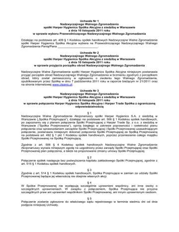 Uchwała Nr 1 Nadzwyczajnego Walnego Zgromadzenia spółki Harper Hygienics Spółka Akcyjna z siedzibą w Warszawie z dnia 10 listopada 2011 roku w sprawie wyboru Przewodniczącego Nadzwyczajnego Walnego Zgromadzenia Działając na podstawie art. 409 § 1 Kodeksu spółek handlowych Nadzwyczajne Walne Zgromadzenie spółki Harper Hygienics Spółka Akcyjna wybiera na Przewodniczącego Nadzwyczajnego Walnego Zgromadzenia Panią/Pana ________________________. Uchwała Nr 2 Nadzwyczajnego Walnego Zgromadzenia spółki Harper Hygienics Spółka Akcyjna z siedzibą w Warszawie z dnia 10 listopada 2011 roku w sprawie przyjęcia porządku obrad Nadzwyczajnego Walnego Zgromadzenia Nadzwyczajne Walne Zgromadzenie spółki Harper Hygienics Spółka Akcyjna niniejszym postanawia przyjąć porządek obrad Nadzwyczajnego Walnego Zgromadzenia w brzmieniu zgodnym z porządkiem obrad, który został zamieszczony w ogłoszeniu o zwołaniu tego Walnego Zgromadzenia, opublikowanym przez Spółkę w dniu 7 października 2011 roku w raporcie bieżącym nr 21/2011 oraz na stronie internetowej www.cleanic.pl. Uchwała Nr 3 Nadzwyczajnego Walnego Zgromadzenia spółki Harper Hygienics Spółka Akcyjna z siedzibą w Warszawie z dnia 10 listopada 2011 roku w sprawie połączenia Harper Hygienics Spółka Akcyjna i Harper Trade Spółka z ograniczoną odpowiedzialnością §1 Nadzwyczajne Walne Zgromadzenie Akcjonariuszy spółki Harper Hygienics S.A. z siedzibą w Warszawie („Spółka Przejmująca”), działając na podstawie art. 506 § 1 Kodeksu spółek handlowych, po zapoznaniu się z planem połączenia Spółki Przejmującej z Harper Trade Sp. z o.o. z siedzibą w Warszawie (”Spółka Przejmowana”), opinią biegłego w zakresie poprawności i rzetelności planu połączenia oraz sprawozdaniem zarządów Spółki Przejmującej i Spółki Przejmowanej uzasadniającym połączenie, postanawia niniejszym dokonać połączenia Spółki Przejmującej ze Spółką Przejmowaną na podstawie art. 492 § 1 pkt 1 Kodeksu spółek handlowych, poprzez przeniesienie całego majątku Spółki Przejmowanej na Spółkę Przejmującą. Zgodnie z art. 506 § 4 Kodeksu spółek handlowych Nadzwyczajne Walne Zgromadzenie Akcjonariuszy wyraża niniejszym zgodę na uzgodniony przez zarządy Spółki Przejmującej oraz Spółki Przejmowanej plan połączenia, a także na proponowane zmiany umowy Spółki Przejmującej. §2 Połączenie spółek następuje bez podwyższenia kapitału zakładowego Spółki Przejmującej, zgodnie z art. 515 § 1 Kodeksu spółek handlowych. §3 Zgodnie z art. 514 § 1 Kodeksu spółek handlowych, Spółka Przejmująca w zamian za udziały Spółki Przejmowanej będące jej własnością nie obejmie własnych akcji. §4 W Spółce Przejmowanej nie występują szczególnie uprawnieni wspólnicy, ani inne osoby o szczególnych uprawnieniach. W związku z połączeniem, Spółka Przejmująca nie przyzna szczególnych praw ani uprawnień wspólnikom Spółki Przejmowanej, ani innym uprawnionym osobom. §5 Połączenie zostanie zgłoszone do właściwego sądu rejestrowego w terminie siedmiu dni od dnia podjęcia niniejszej Uchwały. Uchwała Nr 4 Nadzwyczajnego Walnego Zgromadzenia spółki Harper Hygienics Spółka Akcyjna z siedzibą w Warszawie z dnia 10 listopada 2011 roku w sprawie zmiany statutu Harper Hygienics Spółka Akcyjna W związku z połączeniem Harper Hygienics S.A. z siedzibą w Warszawie („Spółka Przejmująca”) z Harper Trade Sp. z o.o. z siedzibą w Warszawie („Spółka Przejmowana”), planowana jest zmiana brzmienia ust. 4.1 Statutu Spółki Przejmującej. Dotychczasowe brzmienie ust. 4.1 Statutu Spółki Przejmującej: 4.1 4.1.1 4.1.2 4.1.3 4.1.4 4.1.5 4.1.6 4.1.7 4.1.8 4.1.9 4.1.10 4.1.11 4.1.12 4.1.13 4.1.14 4.1.15 4.1.16 4.1.17 Przedmiotem działalności Spółki jest: produkcja gotowych artykułów włókienniczych, oprócz odzieży, z wyjątkiem działalności usługowej; produkcja włóknin; produkcja wyrobów włókienniczych pozostałych, gdzie indziej niesklasyfikowana; produkcja papierowych artykułów gospodarstwa domowego, toaletowych i sanitarnych; produkcja pozostałych artykułów z papieru i tektury, gdzie indziej niesklasyfikowana; produkcja włókien chemicznych; produkcja płyt, arkuszy, rur i kształtek z tworzyw sztucznych; produkcja opakowań z tworzyw sztucznych; sprzedaż hurtowa perfum i kosmetyków; pozostała sprzedaż hurtowa wyspecjalizowana; zagospodarowanie i sprzedaż nieruchomości na własny rachunek; kupno i sprzedaż nieruchomości na własny rachunek, wynajem nieruchomości na własny rachunek; zarządzanie nieruchomościami niemieszkalnymi; badanie rynku i opinii publicznej; doradztwo w zakresie prowadzenia działalności gospodarczej i zarządzania; pożyczki pieniężne poza systemem bankowym. W wyniku połączenia ust. 4.1 Statutu Spółki Przejmującej otrzyma następujące brzmienie: 4.1 Przedmiotem działalności Spółki jest: 4.1.1 produkcja gotowych artykułów włókienniczych, oprócz odzieży, z wyjątkiem działalności usługowej; 4.1.2 produkcja włóknin; 4.1.3 produkcja wyrobów włókienniczych pozostałych, gdzie indziej niesklasyfikowana; 4.1.4 produkcja papierowych artykułów gospodarstwa domowego, toaletowych i sanitarnych; 4.1.5 produkcja pozostałych artykułów z papieru i tektury, gdzie indziej niesklasyfikowana; 4.1.6 produkcja włókien chemicznych; 4.1.7 produkcja płyt, arkuszy, rur i kształtek z tworzyw sztucznych; 4.1.8 produkcja opakowań z tworzyw sztucznych; 4.1.9 sprzedaż hurtowa perfum i kosmetyków; 4.1.10 pozostała sprzedaż hurtowa wyspecjalizowana; 4.1.11 zagospodarowanie i sprzedaż nieruchomości na własny rachunek; 4.1.12 kupno i sprzedaż nieruchomości na własny rachunek, 4.1.13 wynajem nieruchomości na własny rachunek; 4.1.14 zarządzanie nieruchomościami niemieszkalnymi; 4.1.15 badanie rynku i opinii publicznej; 4.1.16 doradztwo w zakresie prowadzenia działalności gospoda